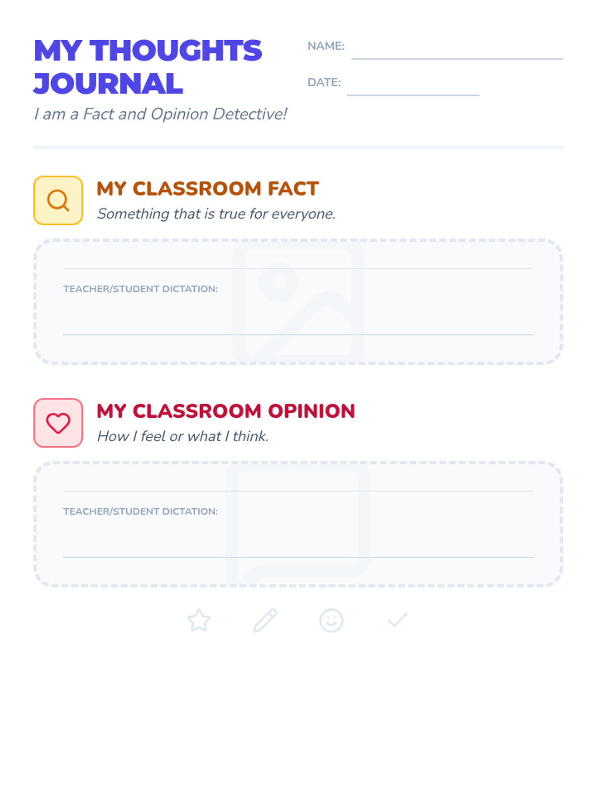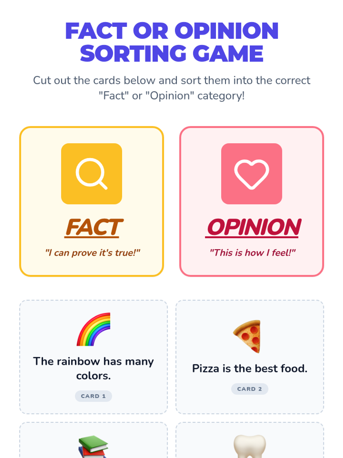 A foundational 25-minute lesson for Kindergarteners to distinguish between objective facts and subjective opinions using relatable classroom examples and interactive games.