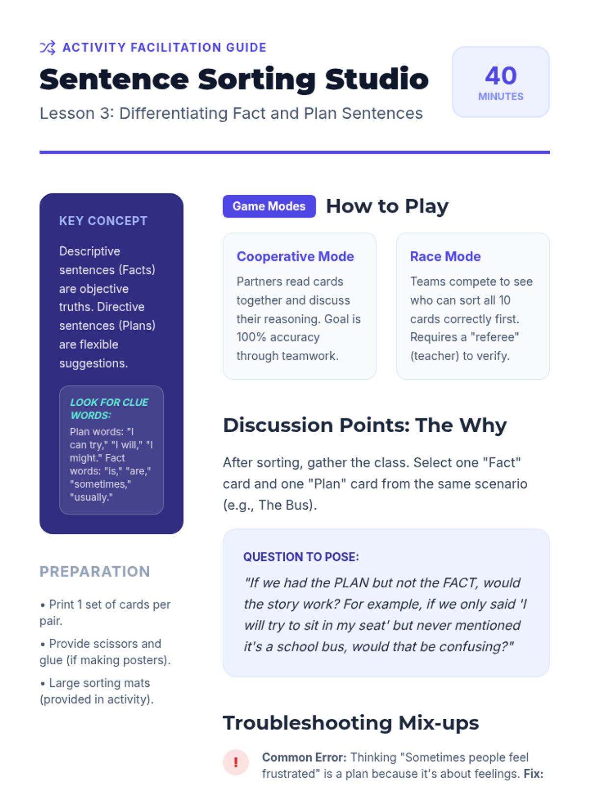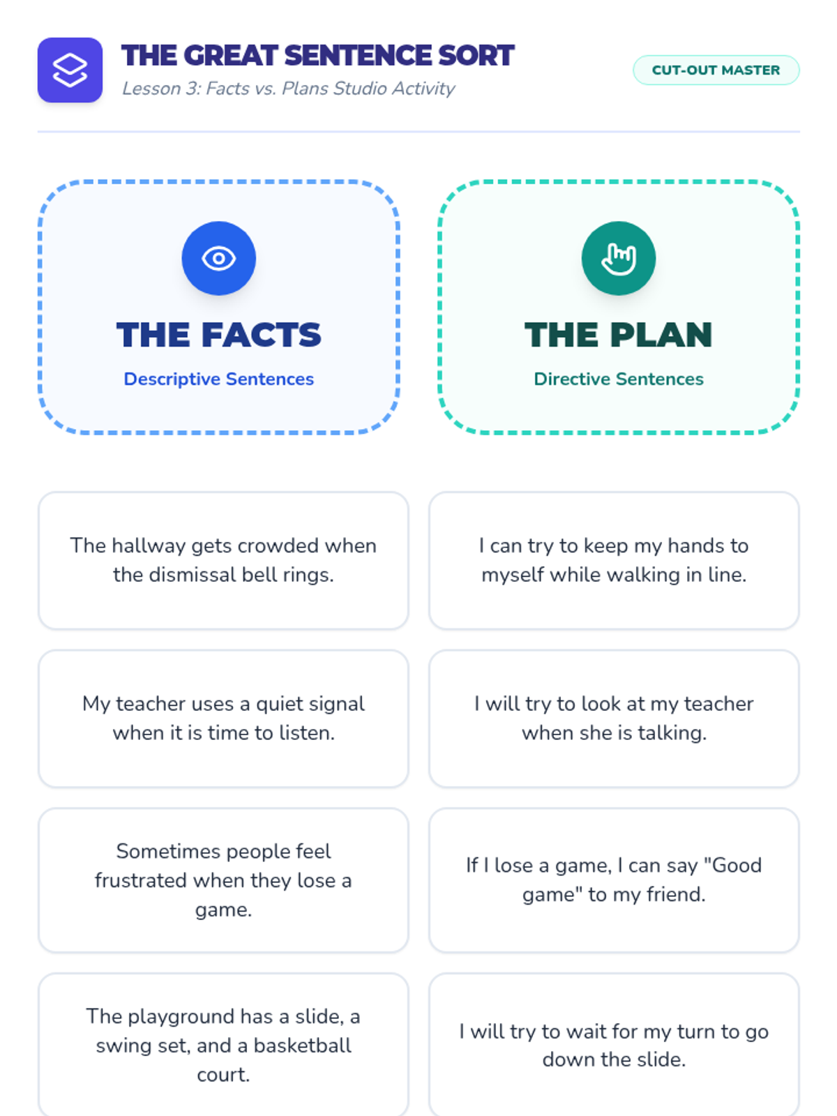 Students participate in a sorting activity to differentiate between sentences that describe a setting and sentences that suggest a behavior. This foundational skill helps them understand that social stories are mostly about understanding, not just obeying.