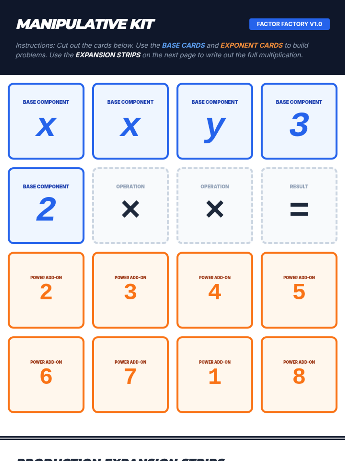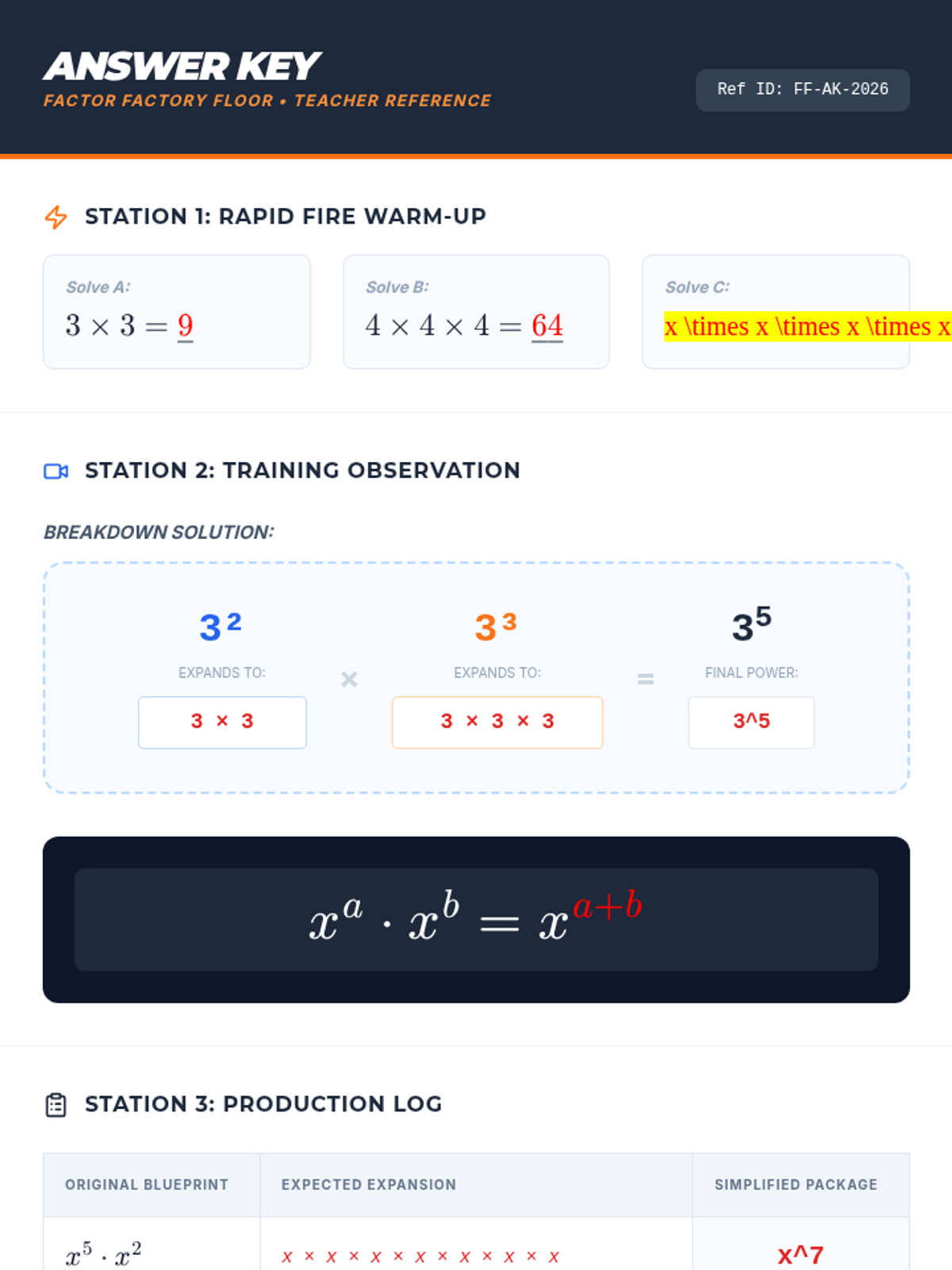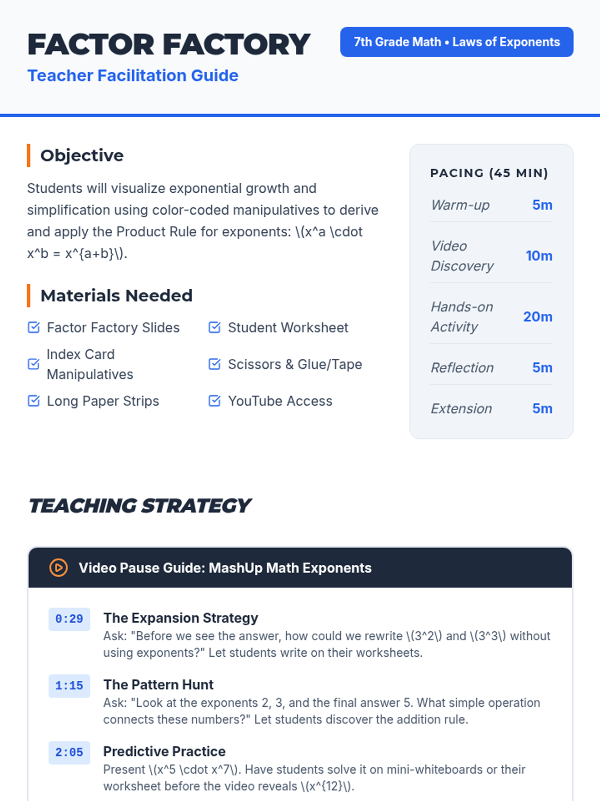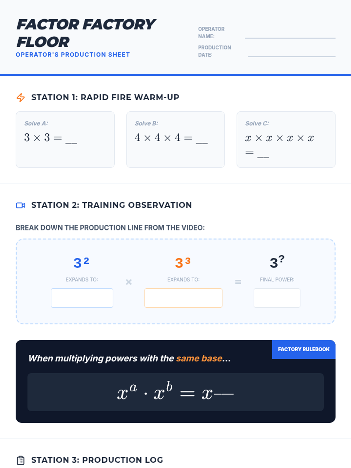 Students will discover and apply the Product Rule for exponents through visual expansion and color-coded manipulatives. The lesson uses a 'Factor Factory' theme to help students visualize exponents as assembly lines of repeated multiplication.