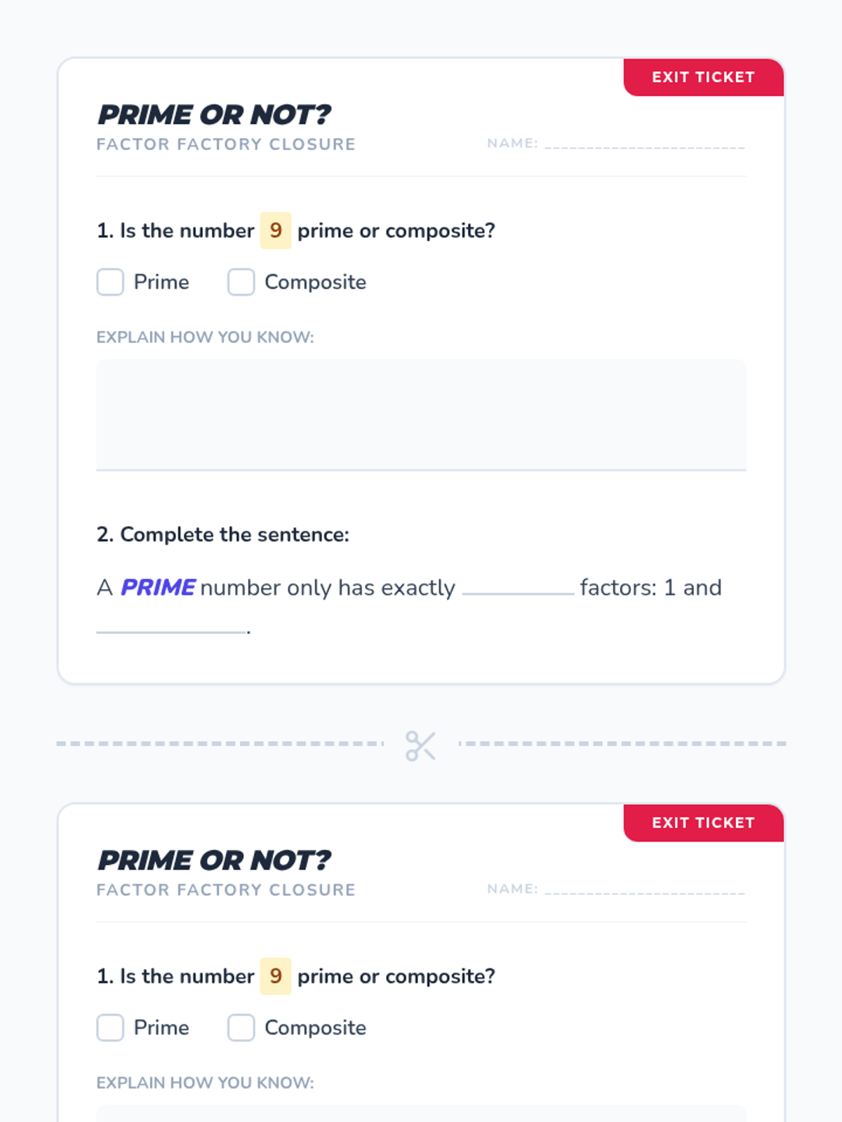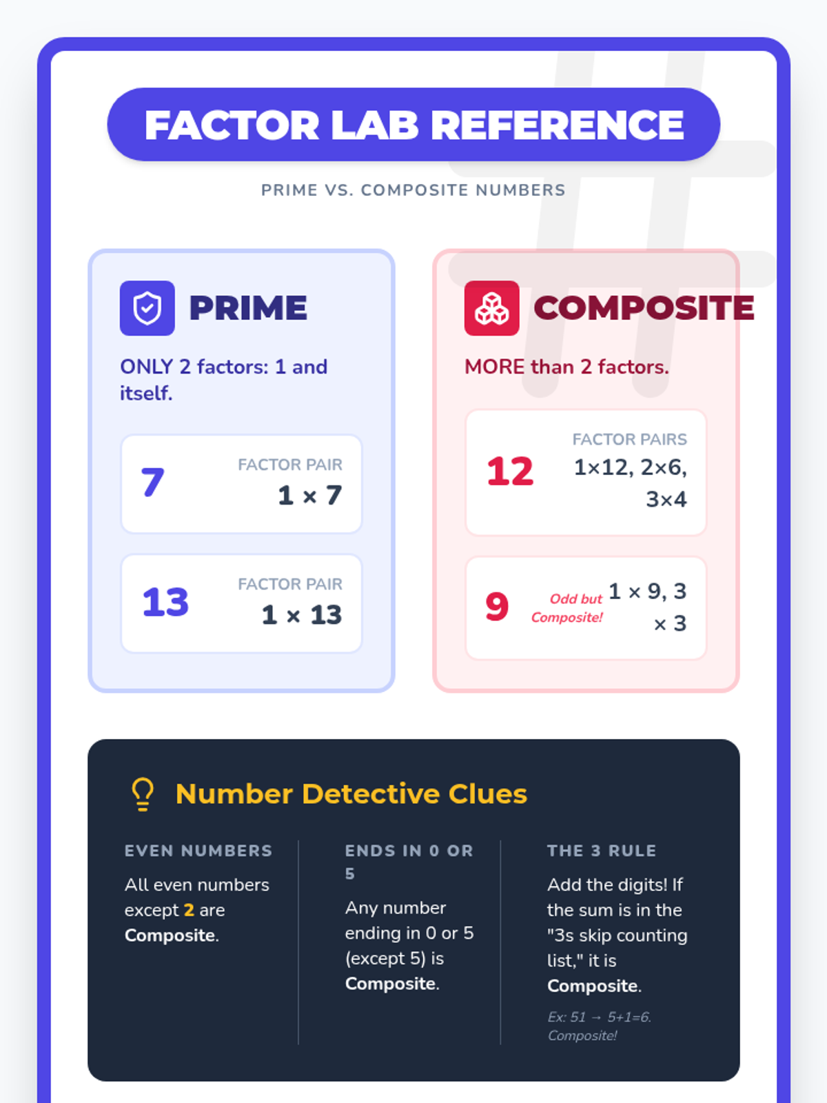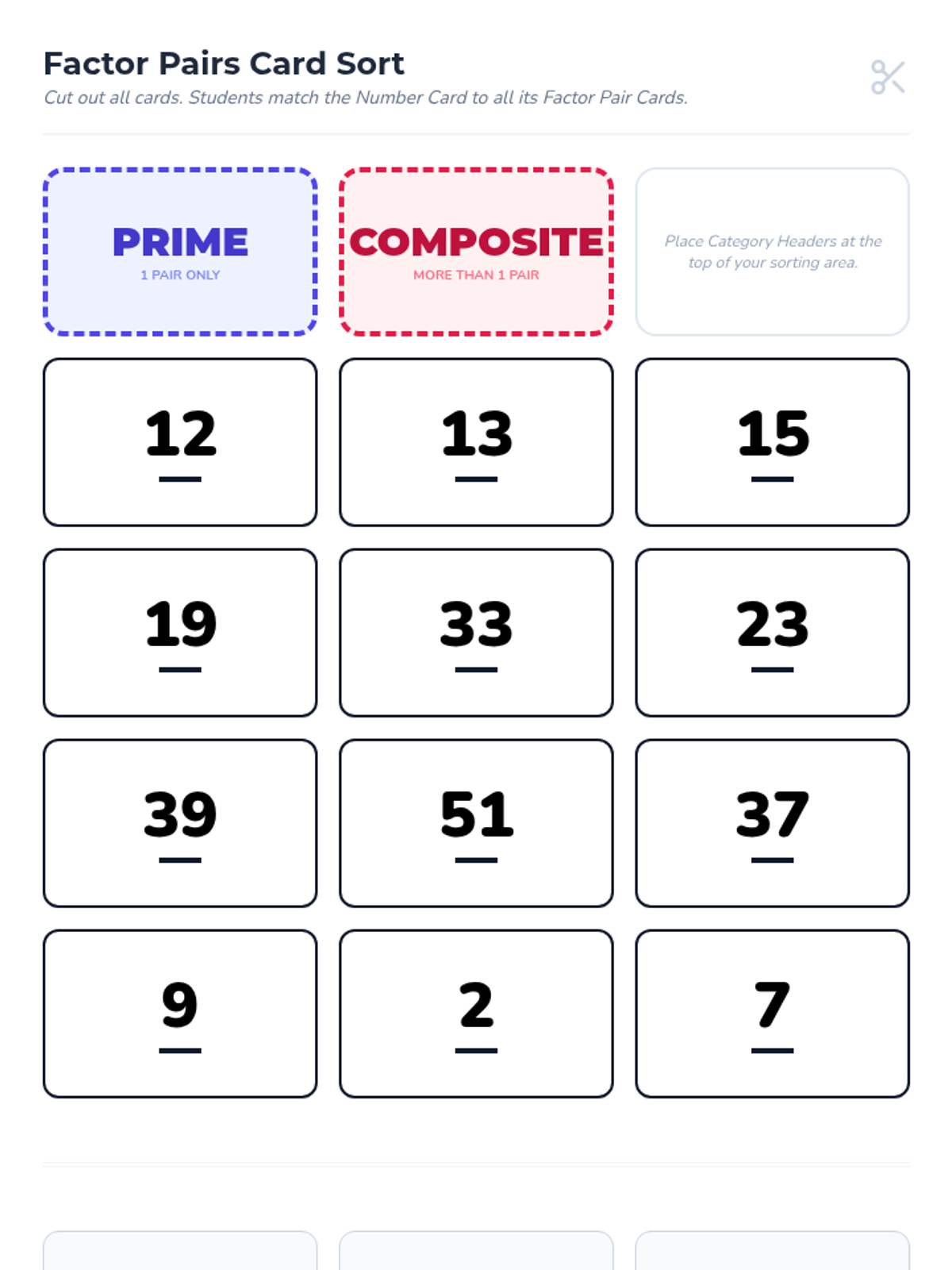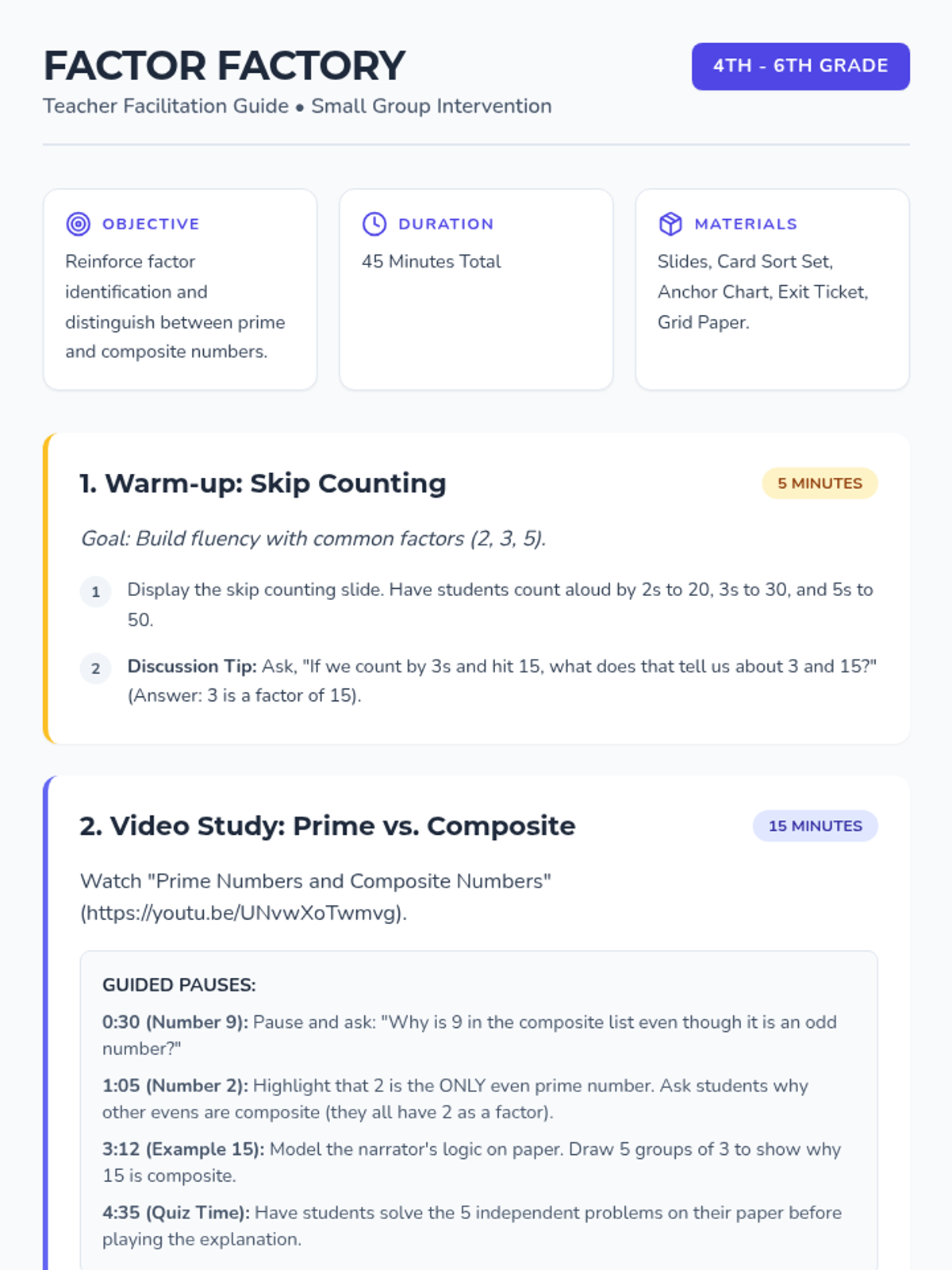 A small-group intervention lesson designed to help students identify prime and composite numbers by finding factor pairs, using guided video analysis and hands-on sorting.