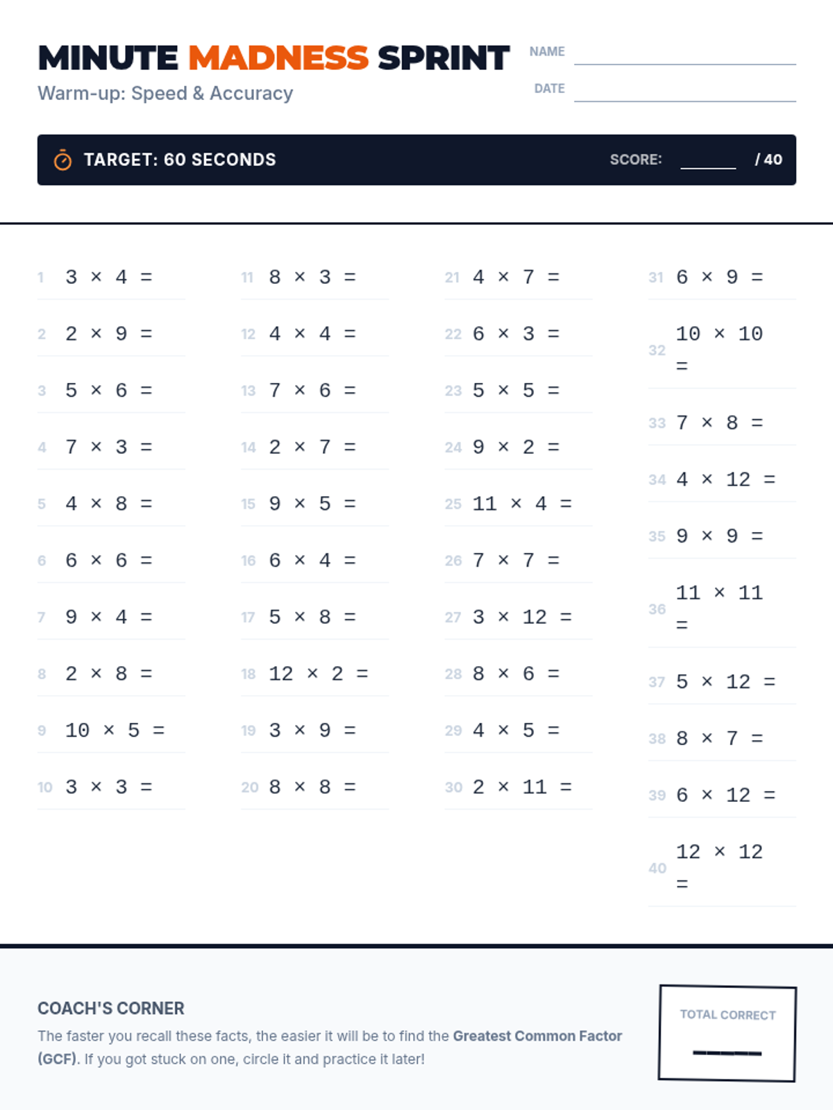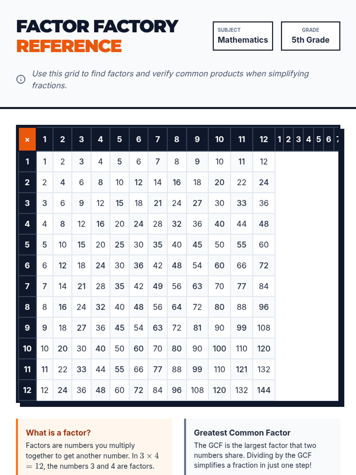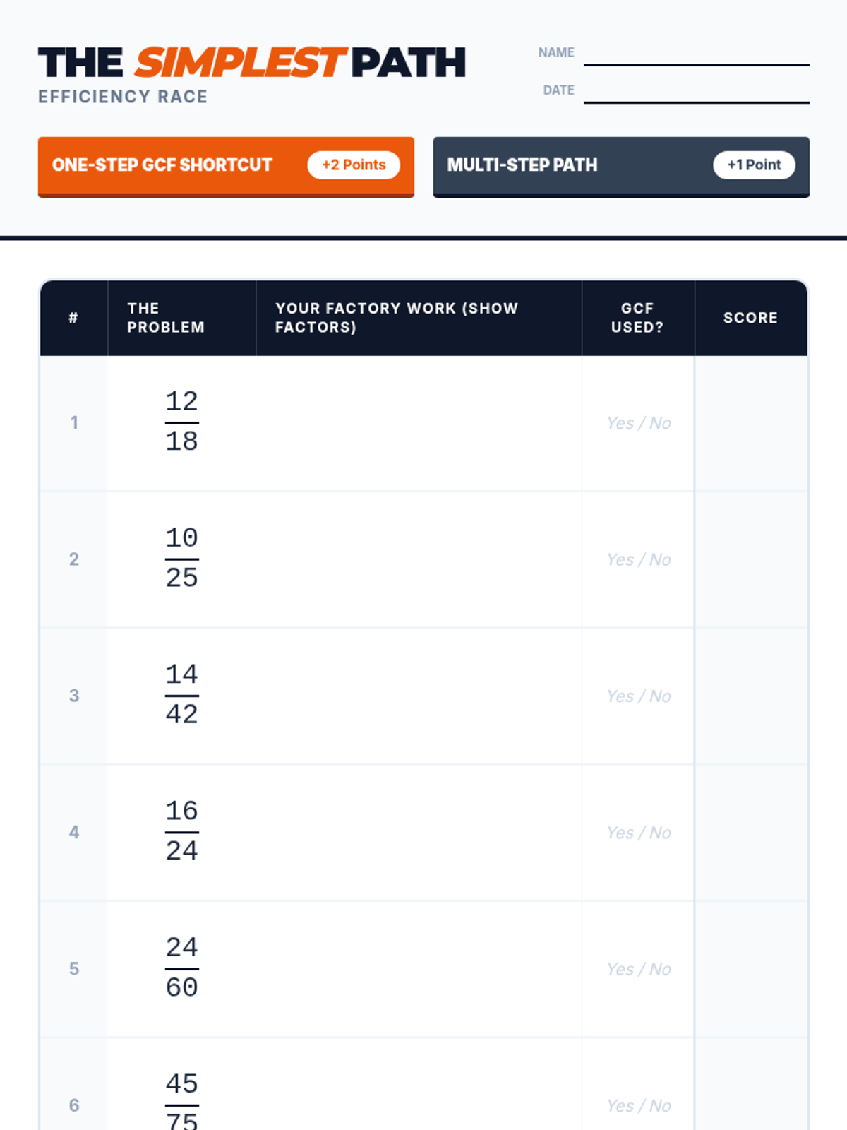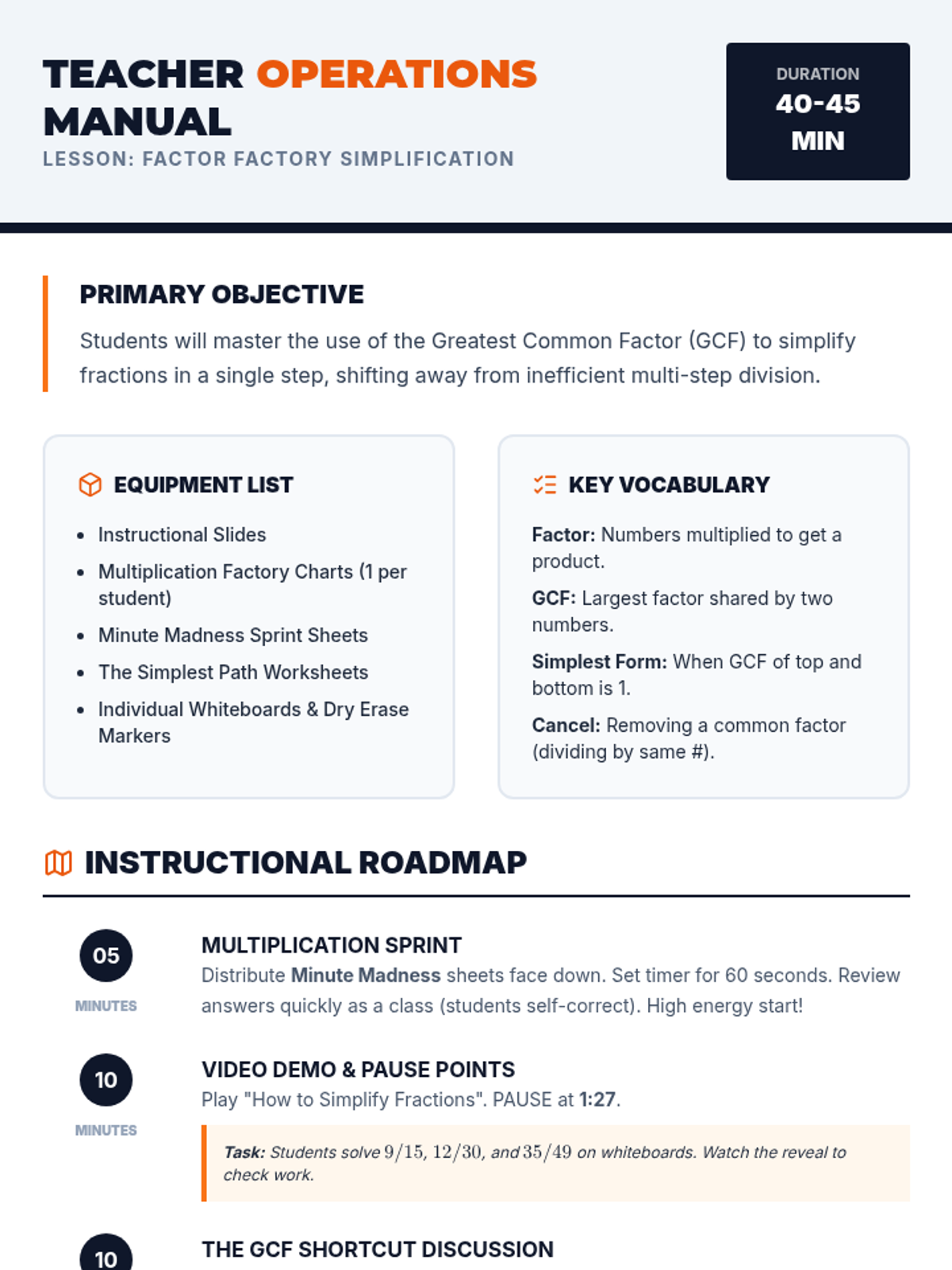 A 5th-grade lesson on simplifying fractions using the Greatest Common Factor (GCF), featuring a multiplication sprint, a guided video analysis, and a competitive simplification game.