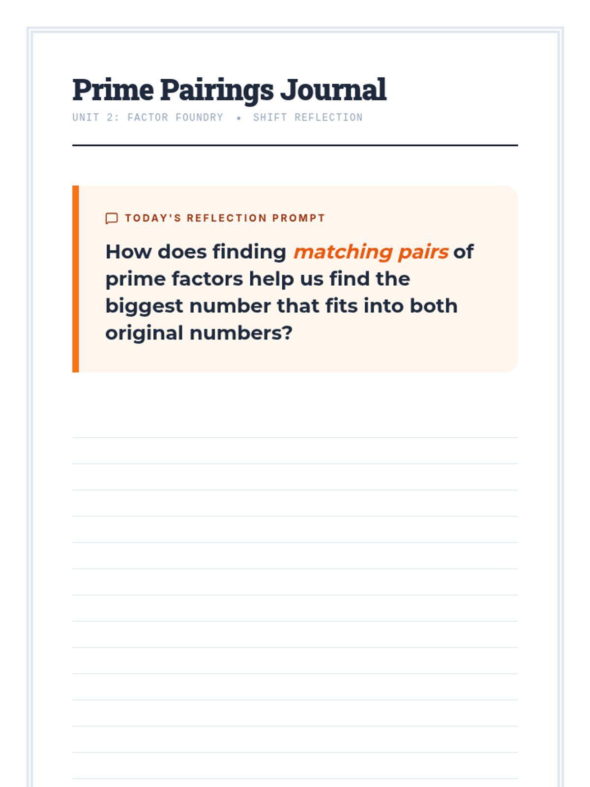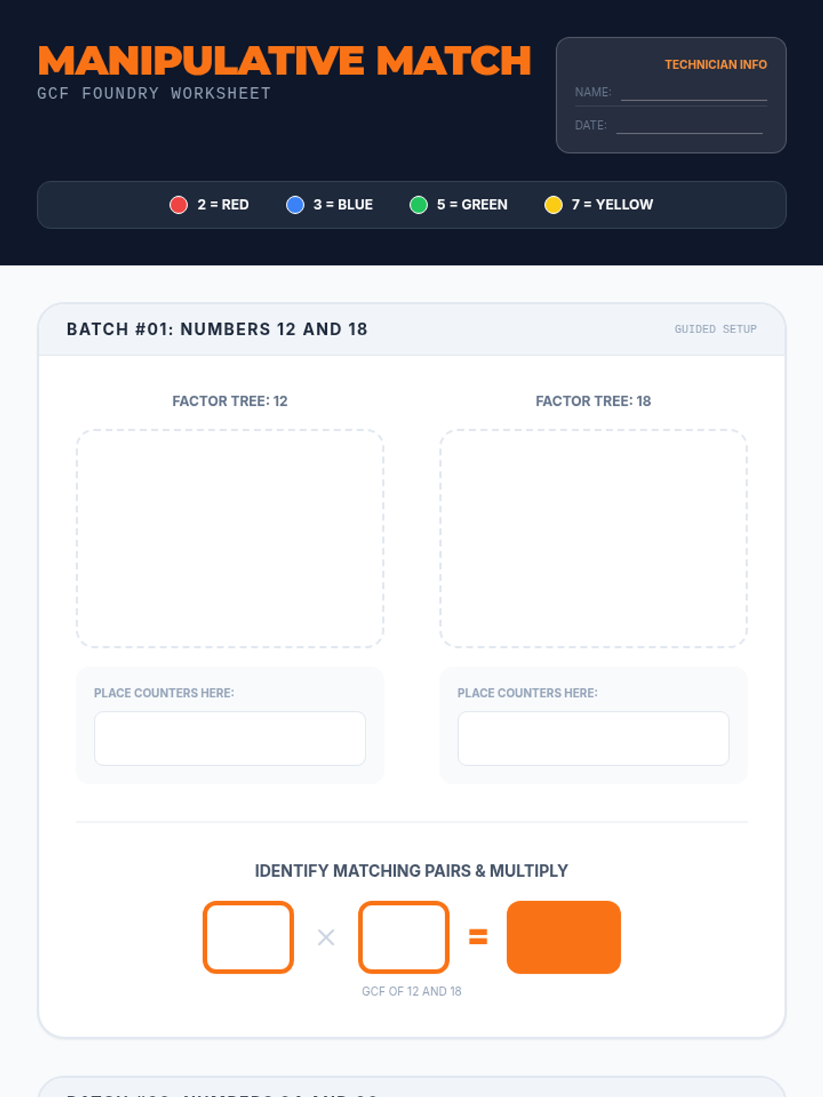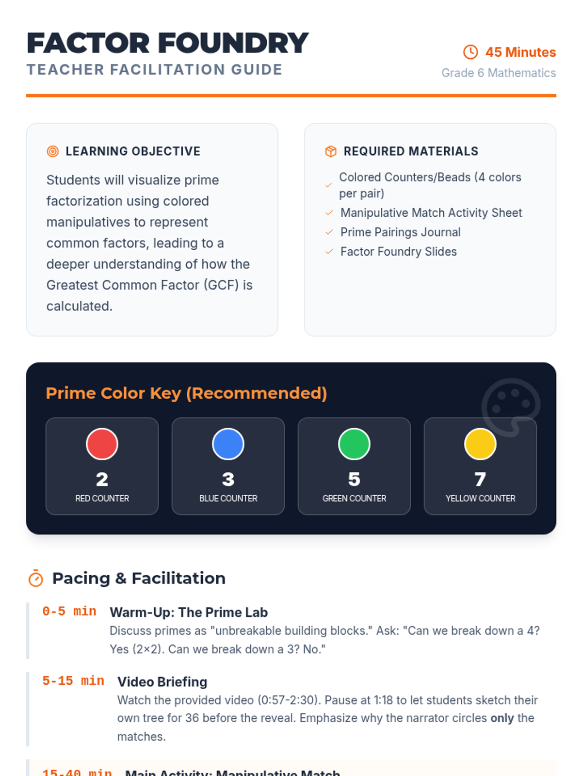 A 6th-grade math lesson that uses physical manipulatives (counters/beads) to represent prime factors, helping students visualize how identifying common prime factors leads to the Greatest Common Factor (GCF).