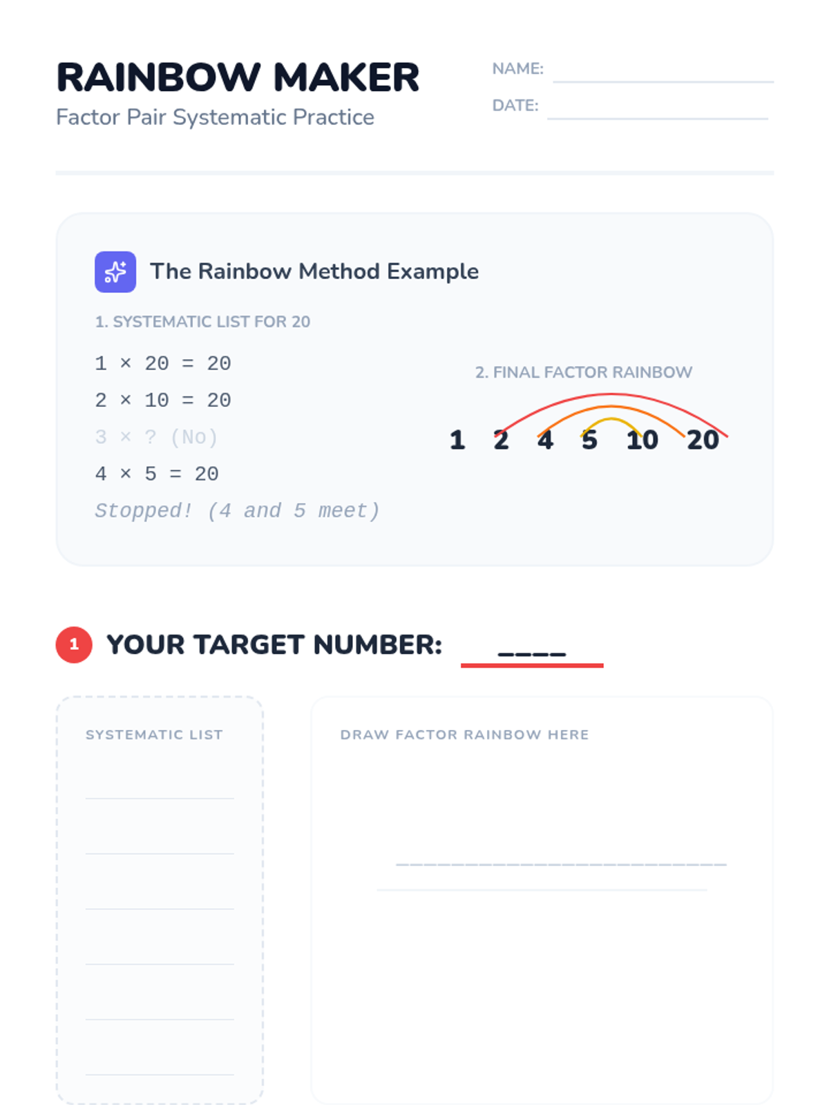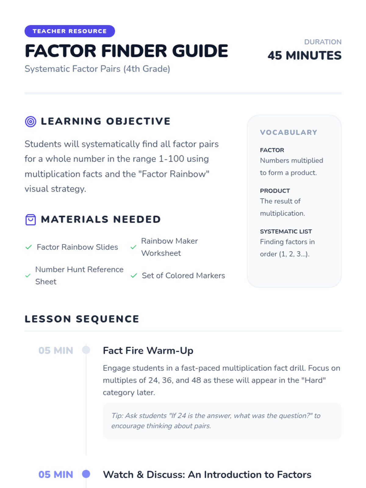 A 4th-grade lesson on finding factors systematically using the 'Factor Rainbow' method, featuring a video introduction and a creative hands-on activity.