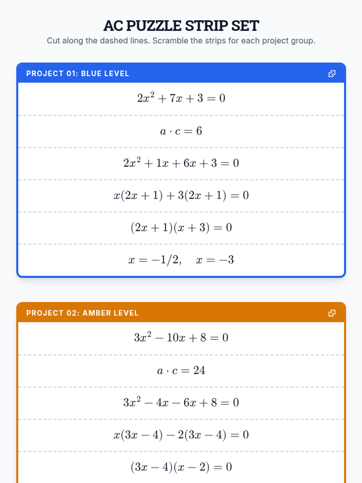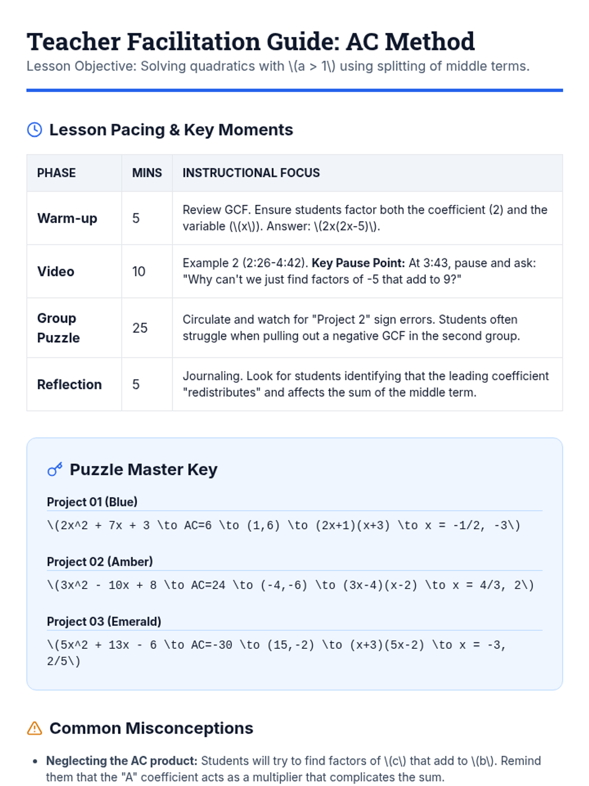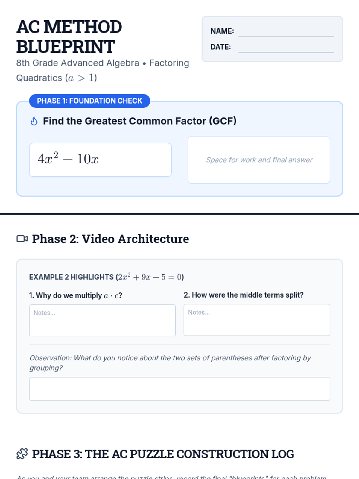 A comprehensive lesson on factoring quadratic equations where a > 1 using the AC method, featuring a video-guided walkthrough and a hands-on sorting puzzle.