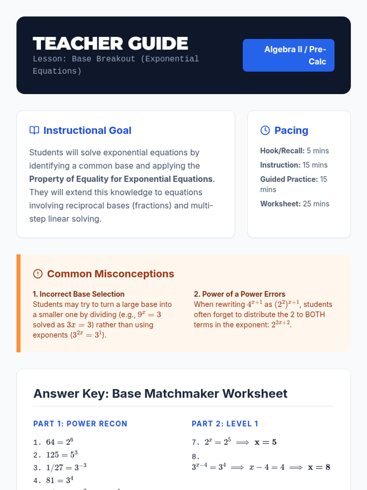 A comprehensive lesson on solving exponential equations by identifying and rewriting unlike bases to a common base, featuring interactive slides, guided practice, and independent student work.
