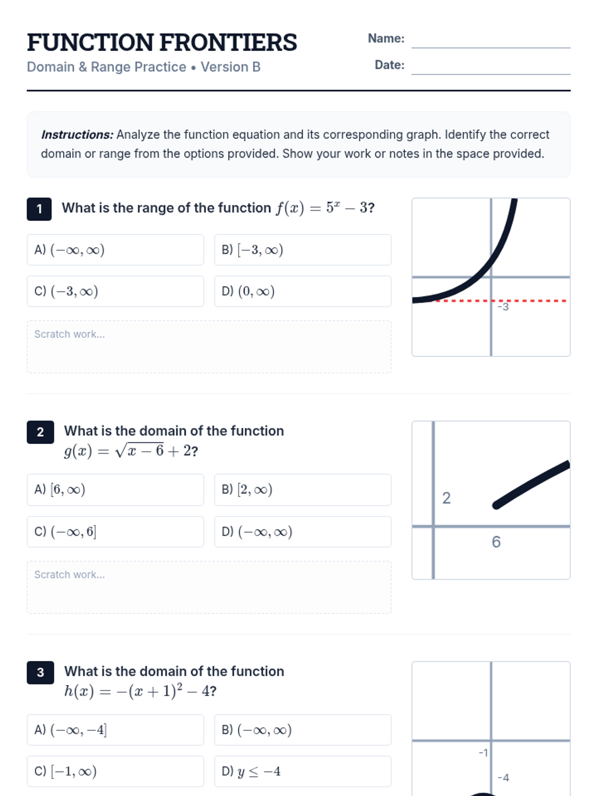 This lesson covers identifying the domain and range of exponential, square root, and quadratic functions through multiple-choice practice. Students will analyze function equations to determine possible input and output values.