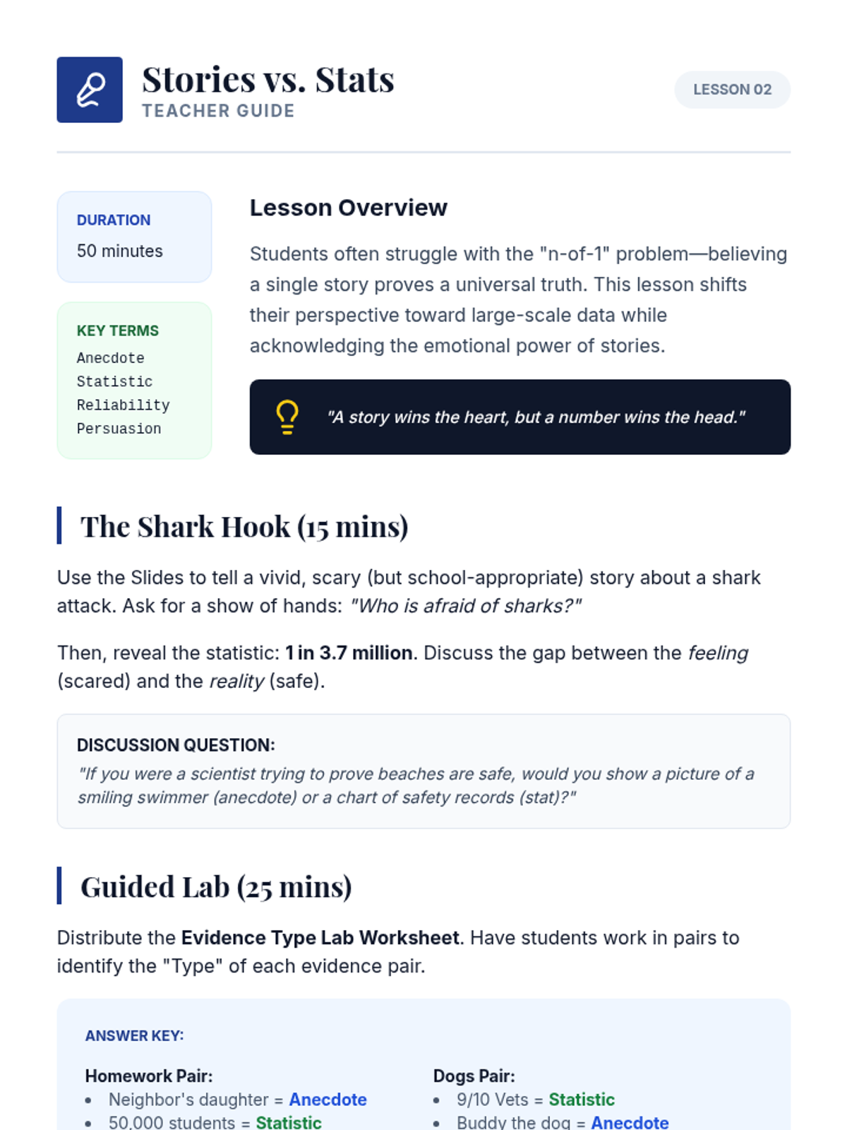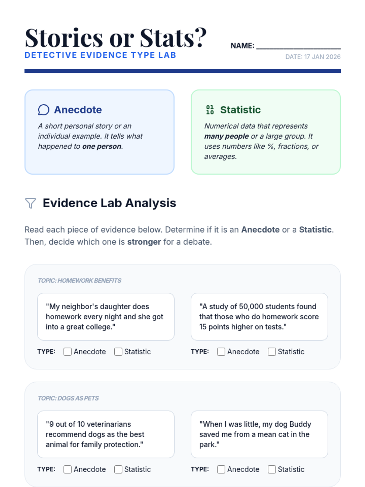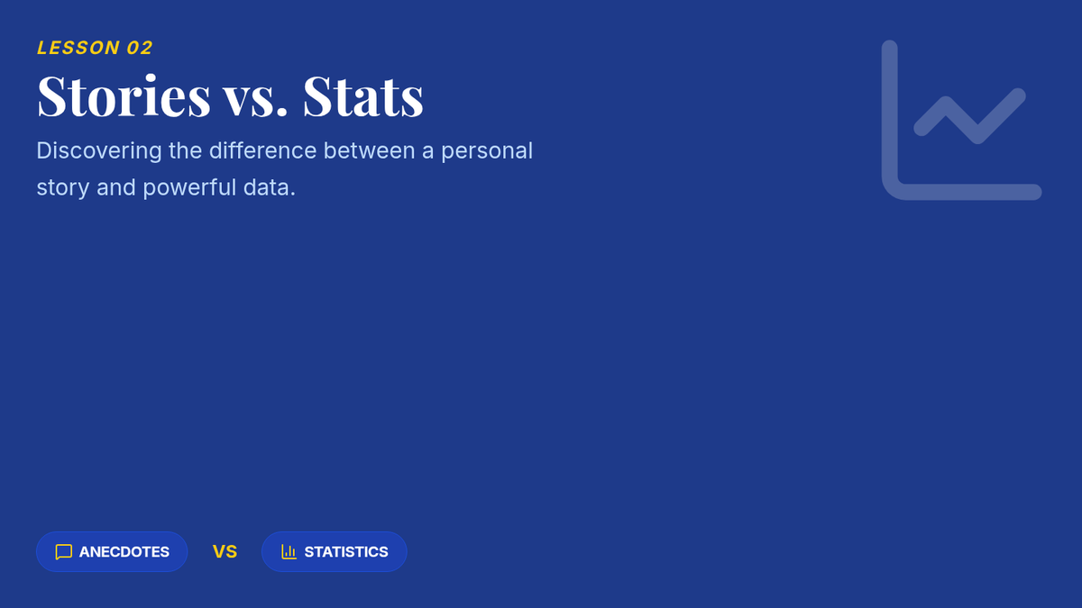 Students compare statistical data with personal stories (anecdotes) to see which type of evidence carries more weight in a formal debate.