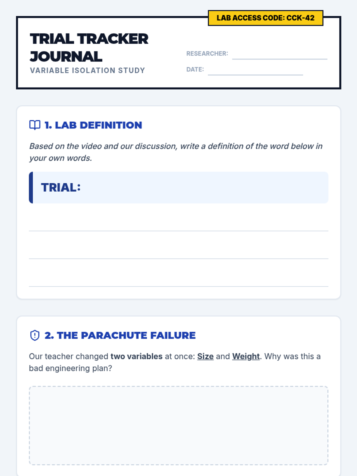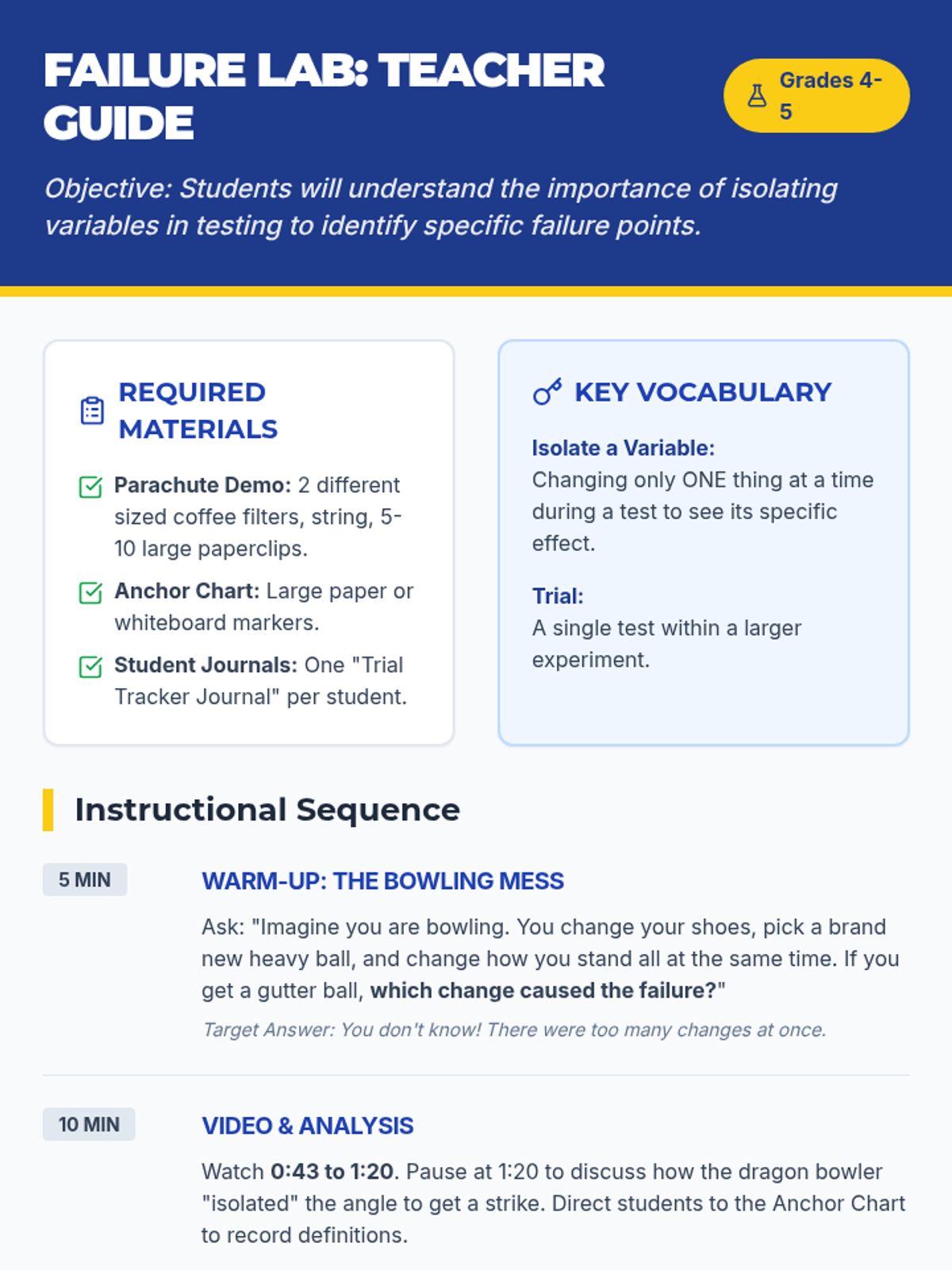 Students learn the critical engineering concept of isolating variables through a bowling analogy, a video investigation, and a hands-on parachute demonstration critique. They will practice identifying failure points and designing controlled trials.