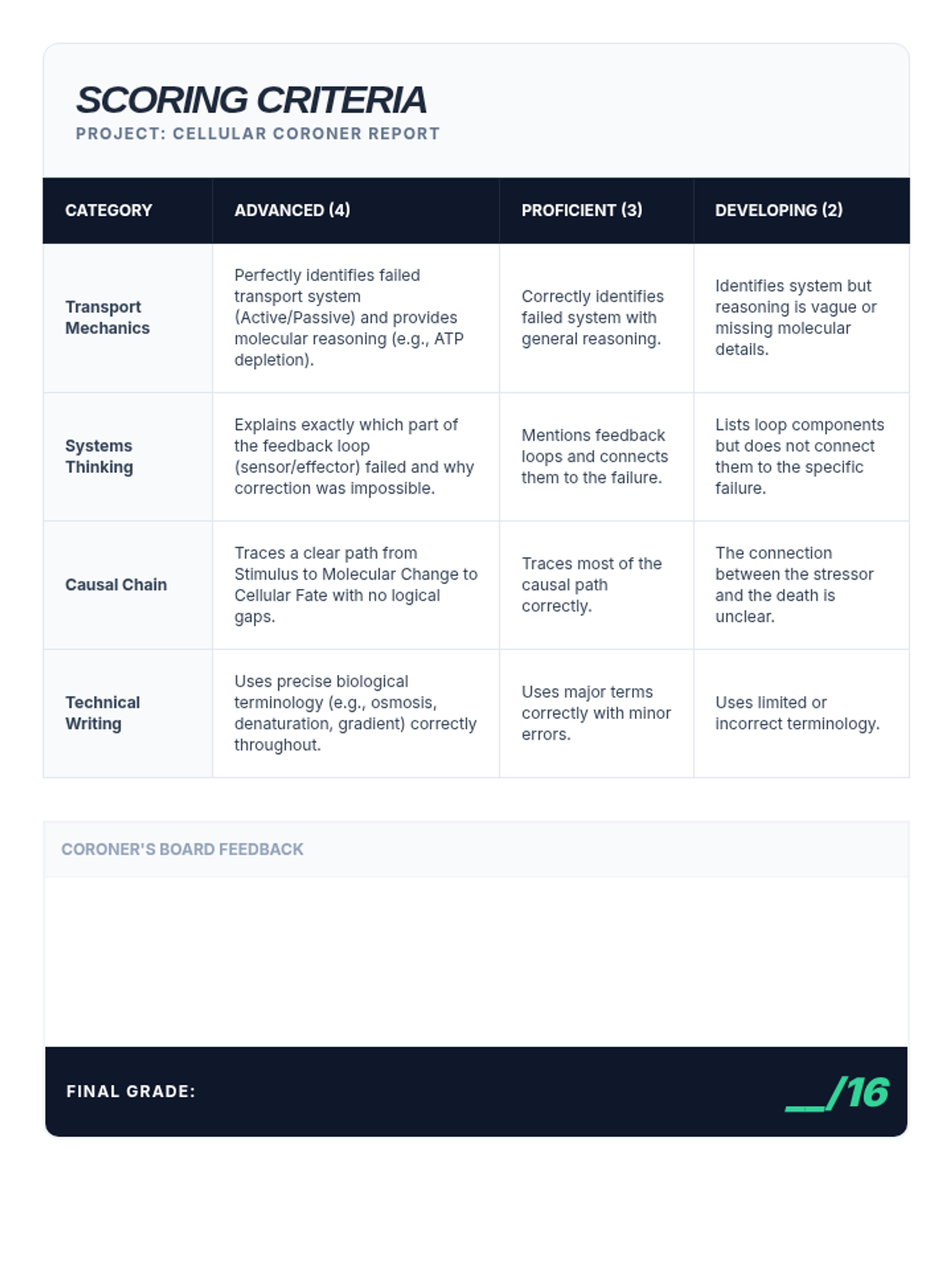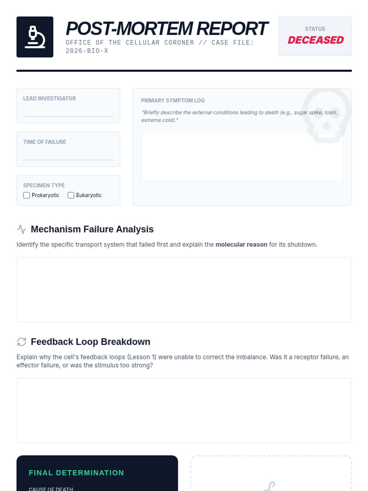 Students synthesize their learning by writing a 'post-mortem' report on a cell that failed to maintain homeostasis in the simulation. They must identify the specific transport mechanism that failed and explain why the cell could not compensate.