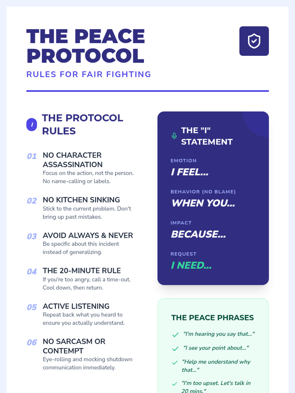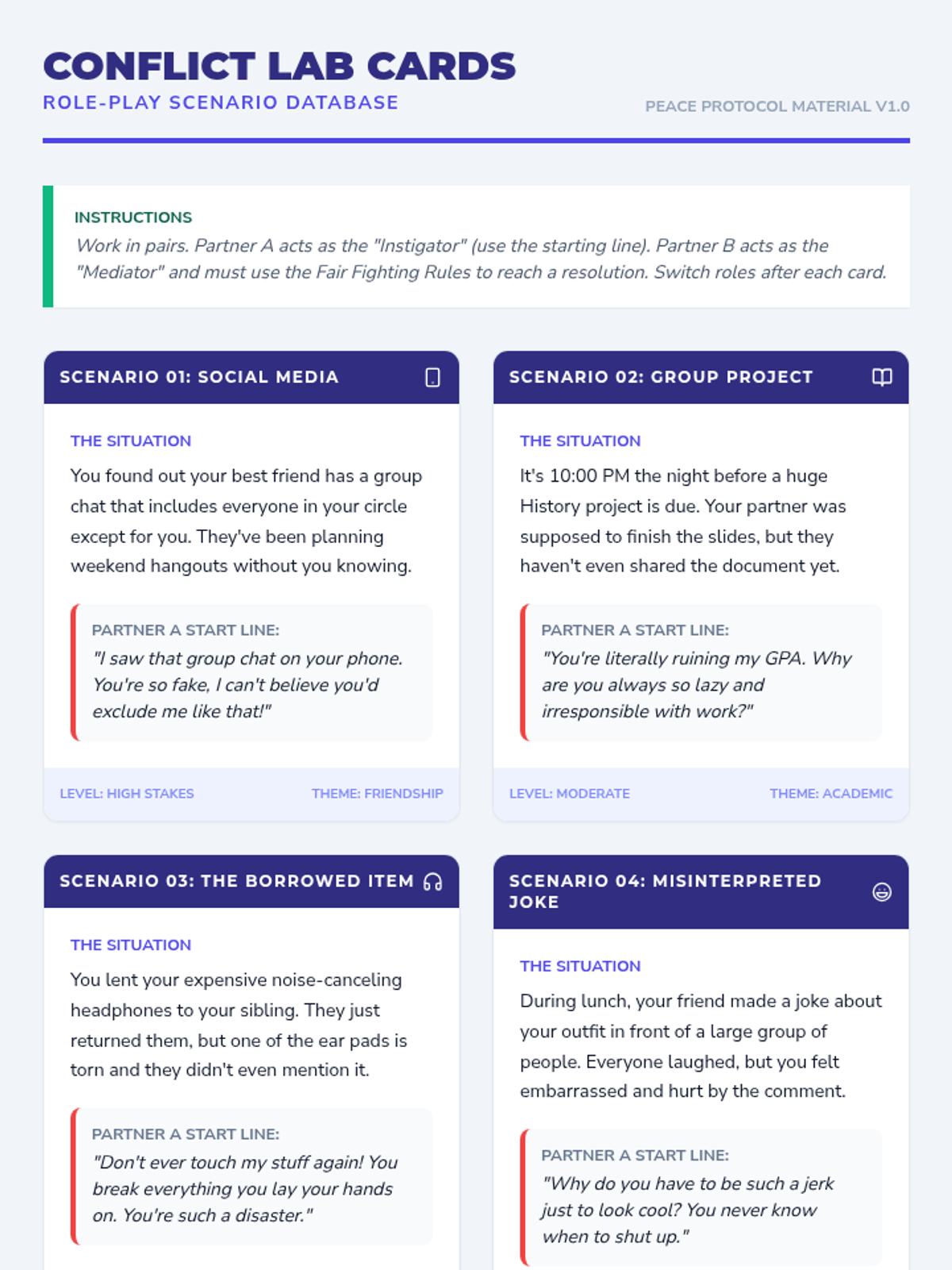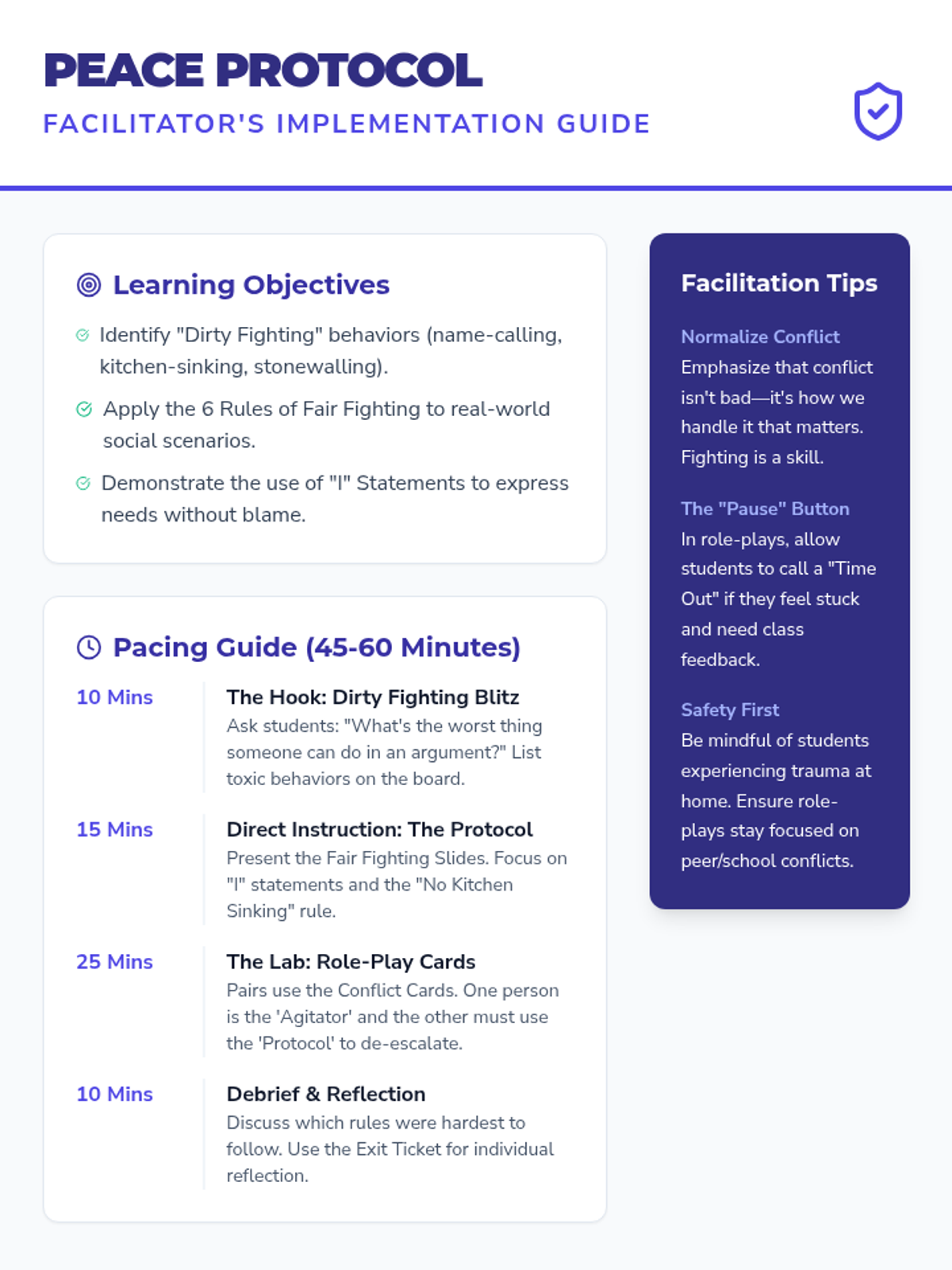 A comprehensive lesson for high school students focused on the "Rules of Fair Fighting." Students will learn specific conflict resolution techniques and apply them through high-stakes role-playing scenarios designed for the high school environment.