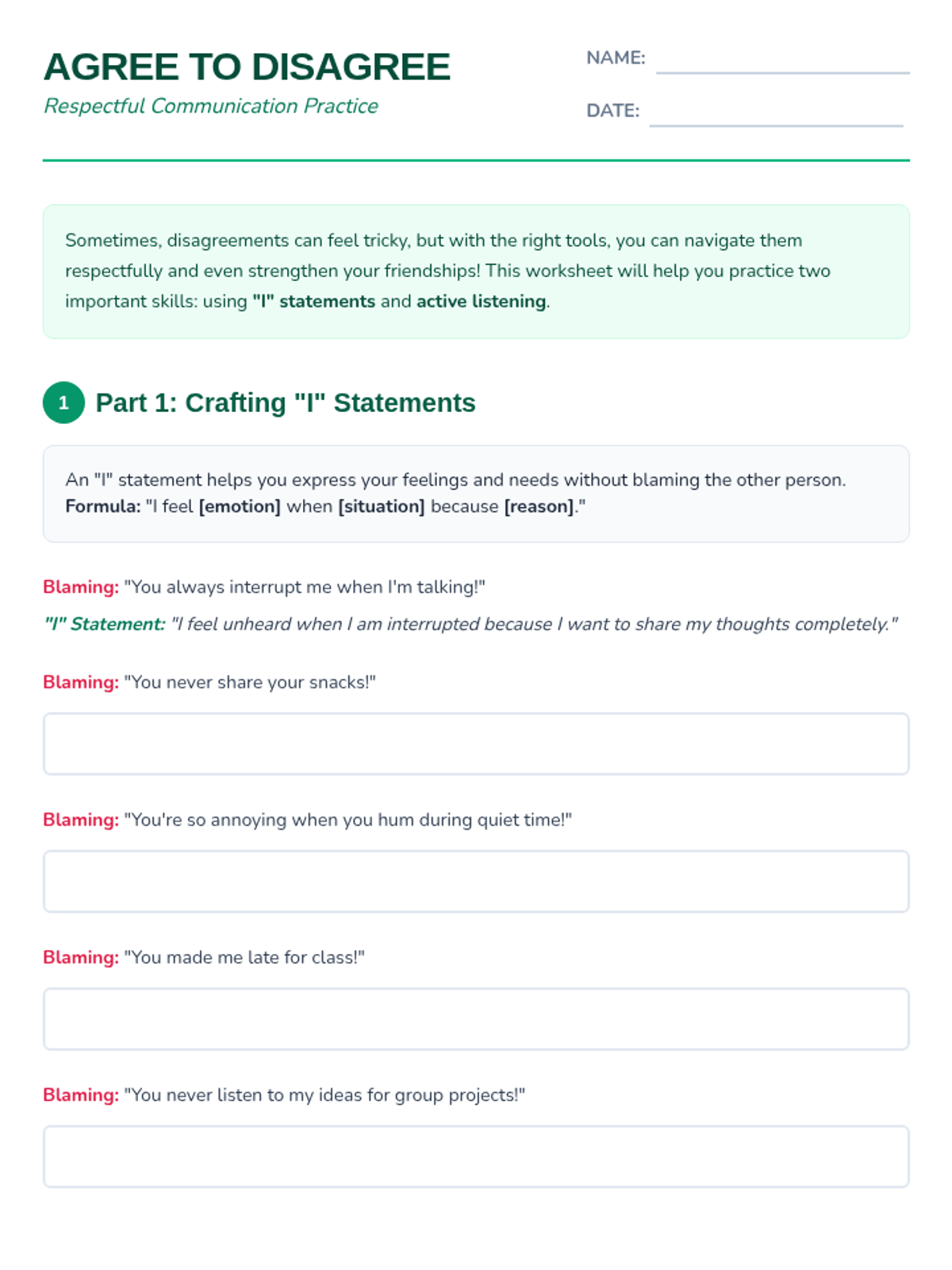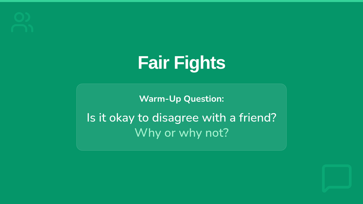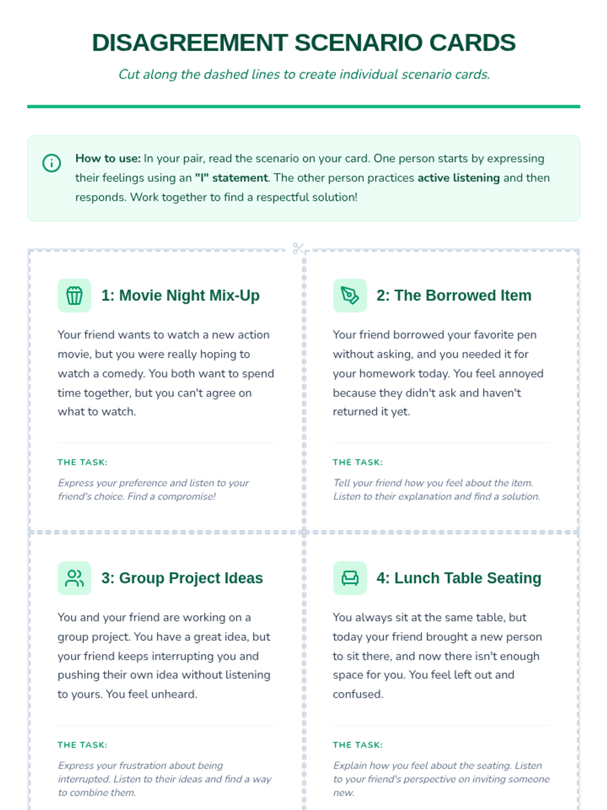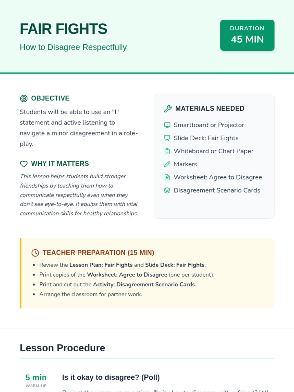 This lesson teaches 7th-grade students essential conflict resolution skills, focusing on respectful communication during disagreements. Students will learn to use 'I' statements and active listening, culminating in a role-play activity.