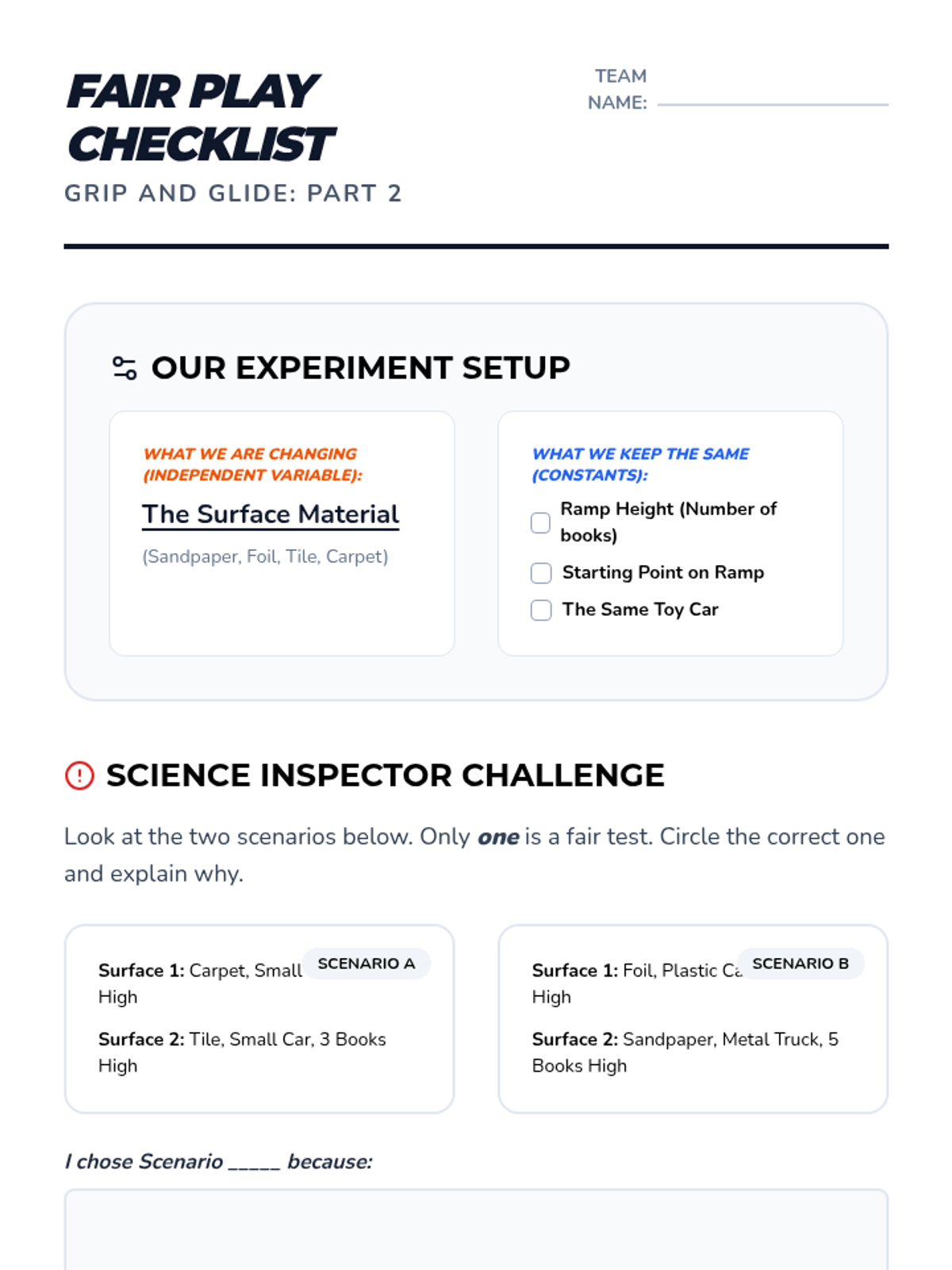 Students learn how to conduct a fair test by keeping the ramp height and object constant while only changing the surface material. They practice measuring the distance a car rolls.