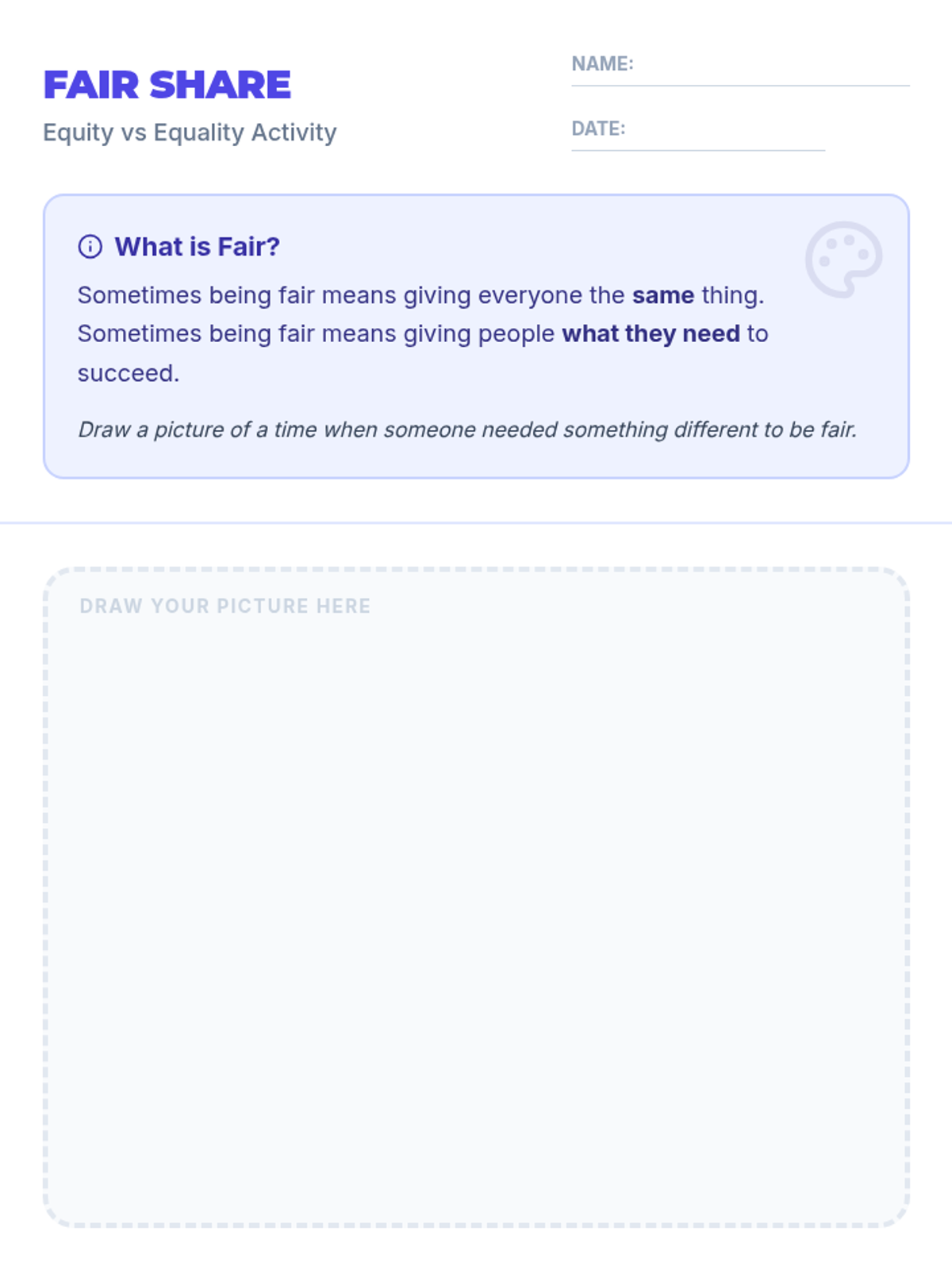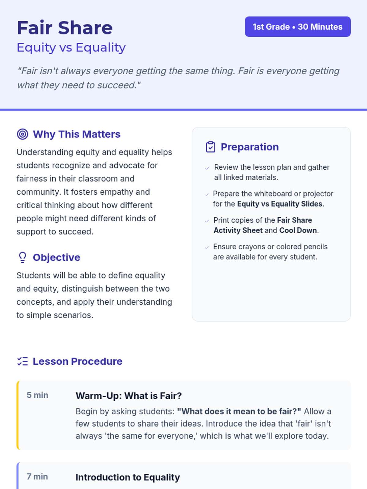 A 30-minute introductory lesson for 1st graders to distinguish between equality (everyone gets the same) and equity (everyone gets what they need). students explore these concepts through relatable examples like shoe sizes and watching a parade over a fence.