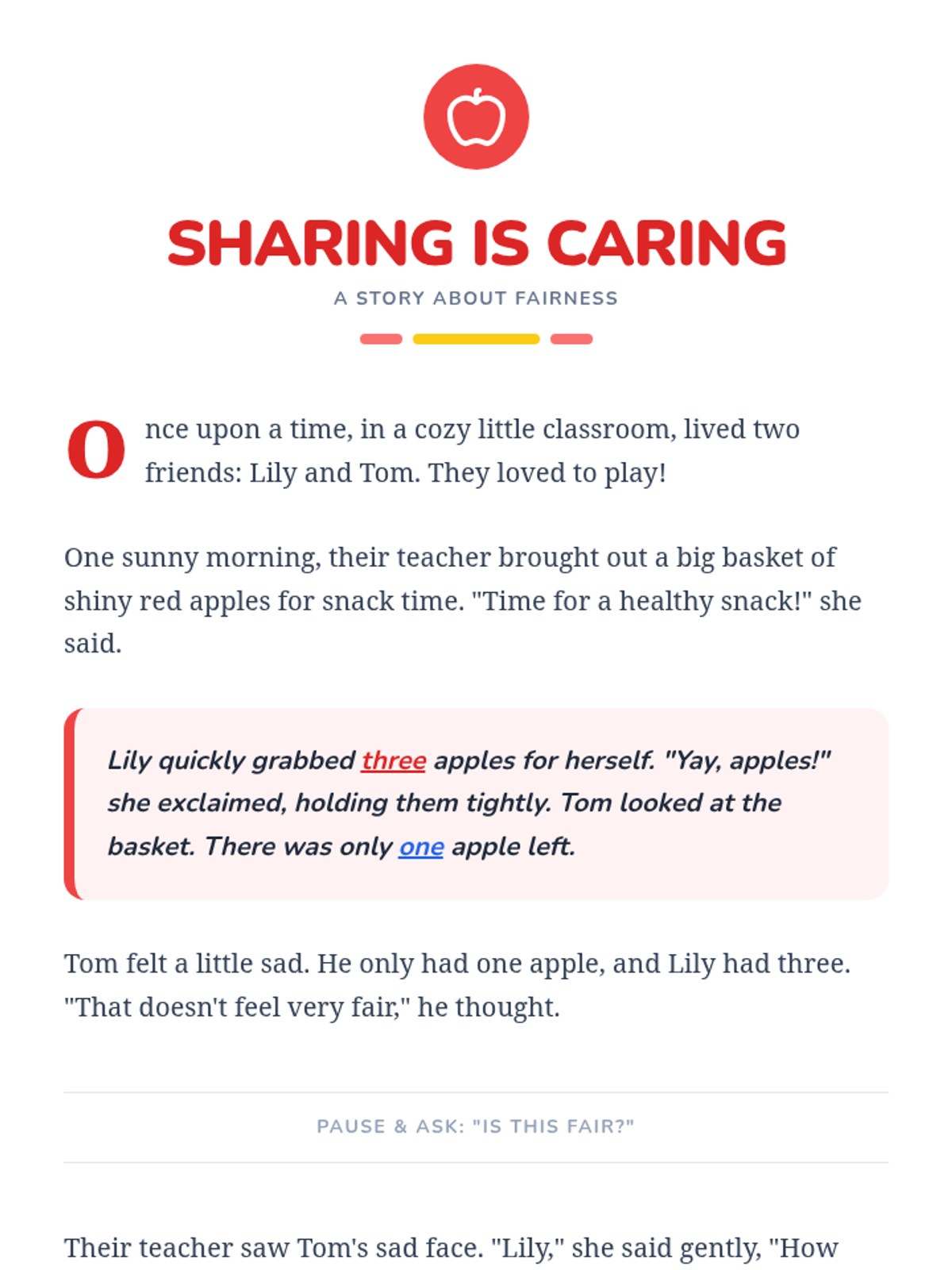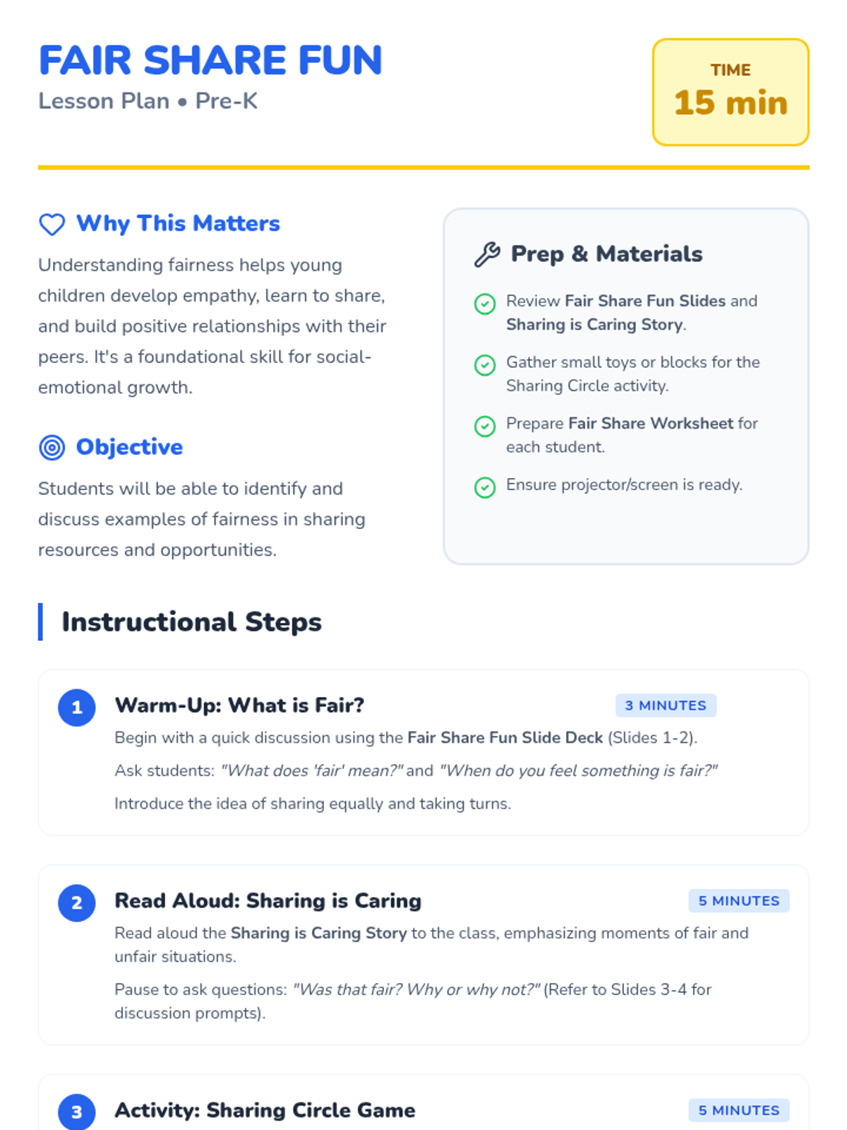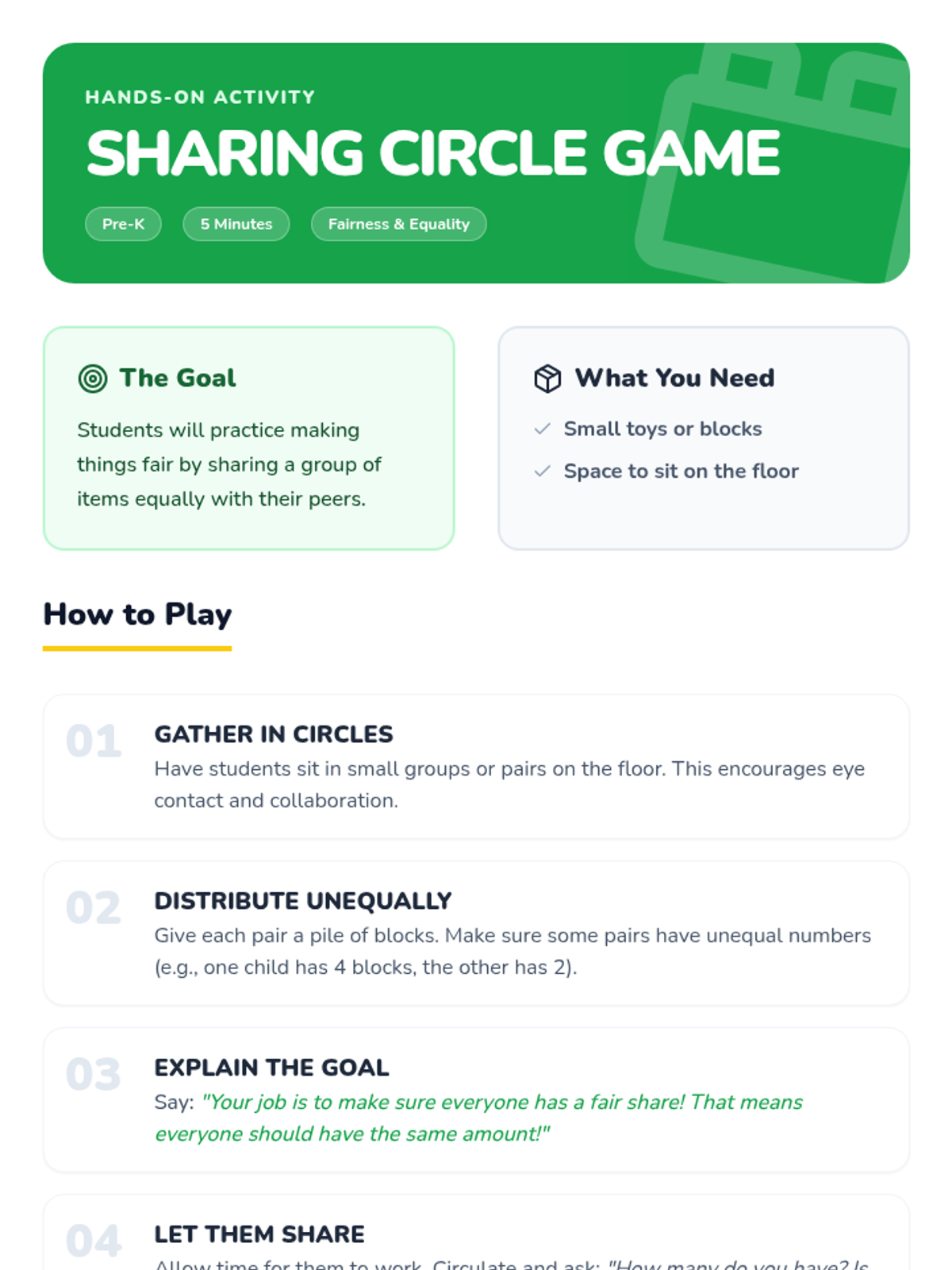 A 15-minute Pre-K lesson that introduces the concept of fairness through a story, discussion, and a hands-on sharing game. Students learn to identify and practice sharing equally with their peers.