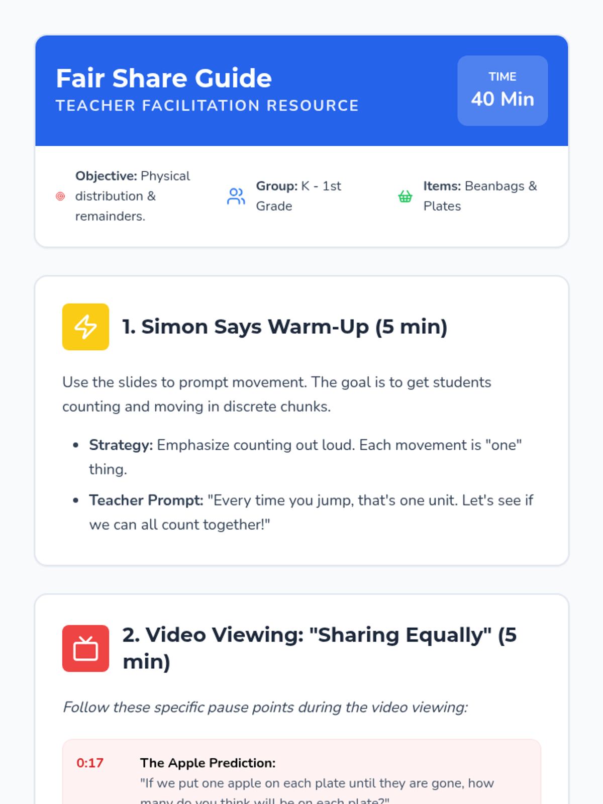 A hands-on introduction to division where students physically act out 'sharing equally' using beanbags and 'human plates' to understand distribution and remainders.