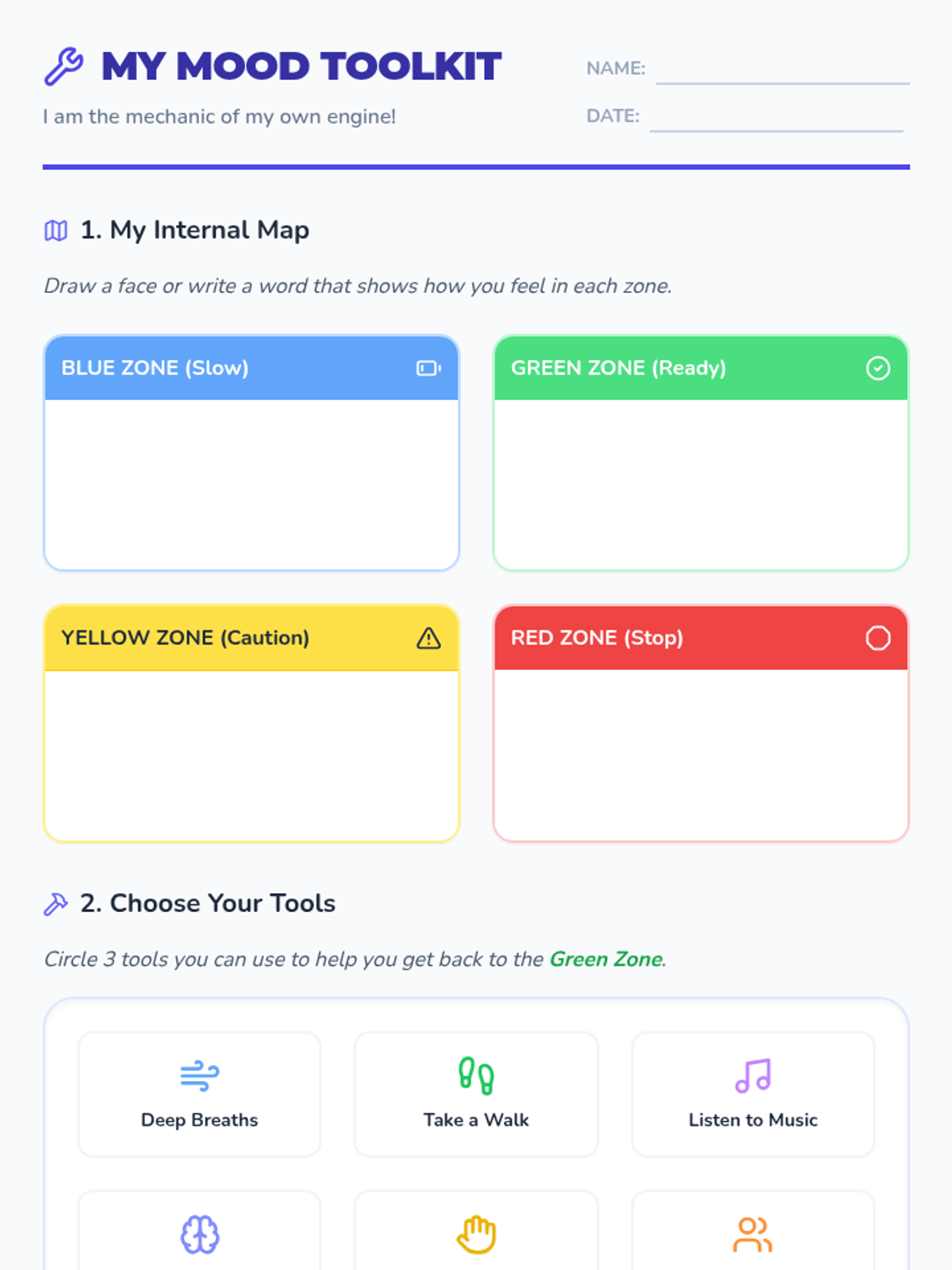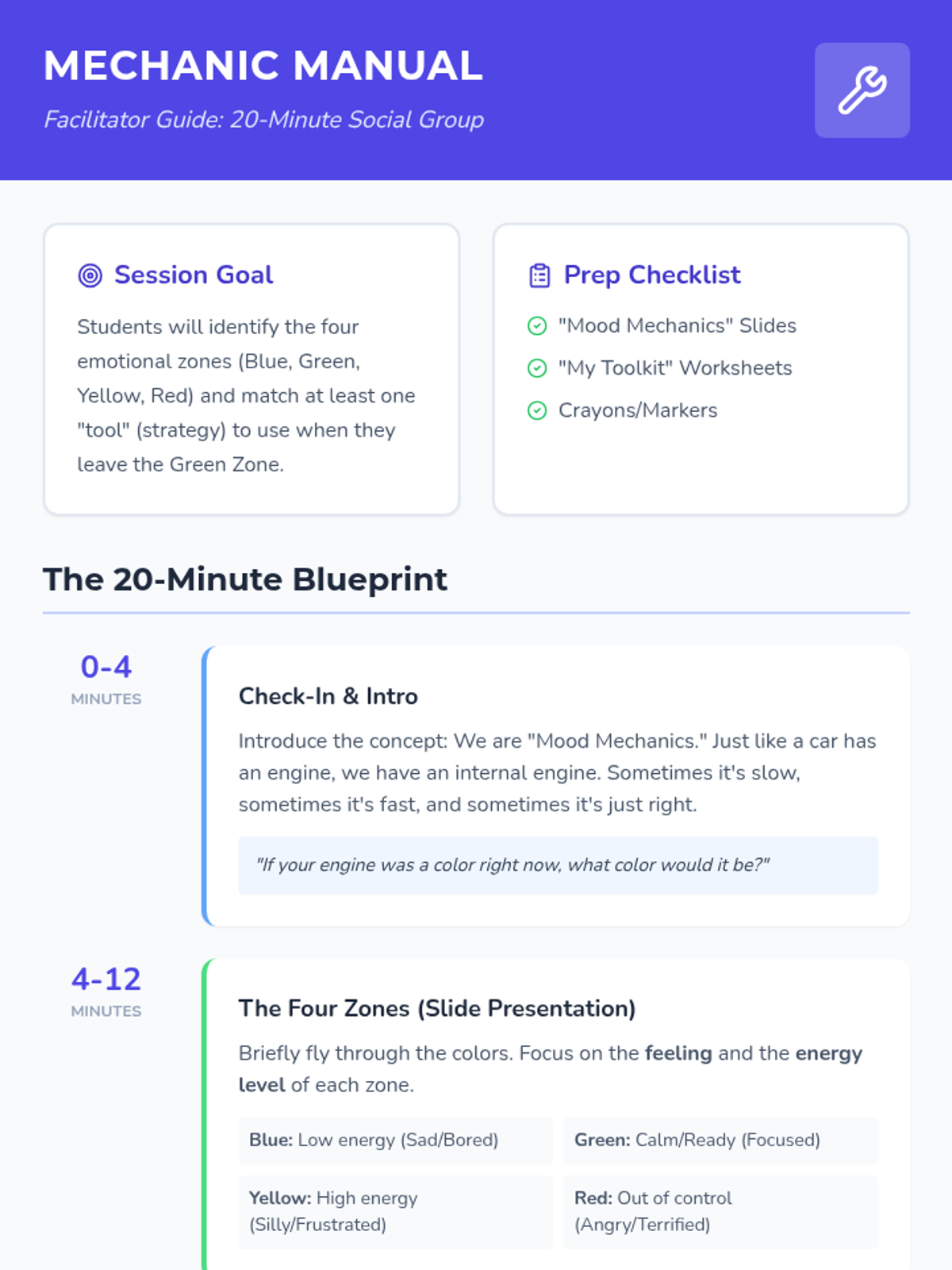 A 20-minute social group lesson for elementary students to identify their emotional 'zone' and select appropriate self-regulation strategies based on the Zones of Regulation framework.
