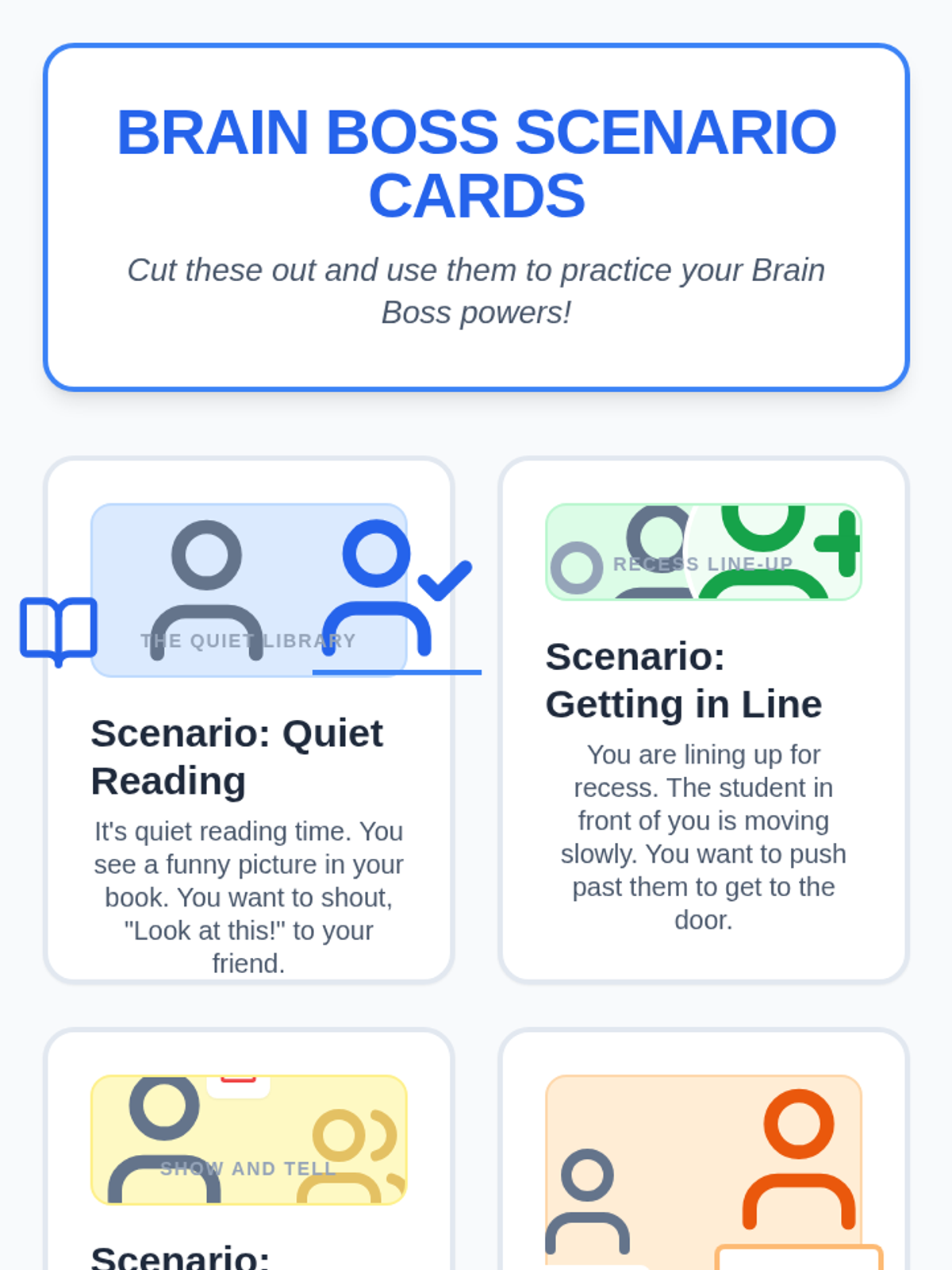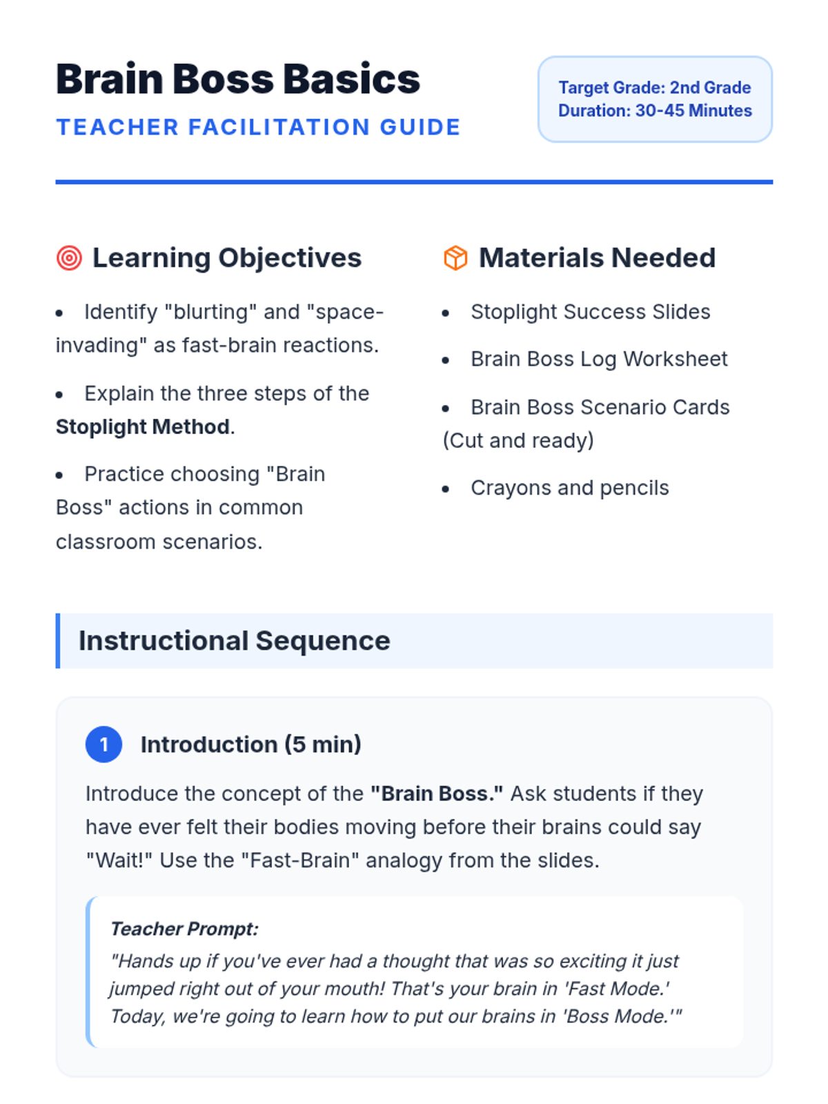 A comprehensive social-emotional learning lesson focused on impulse control, specifically targeting blurting out and maintaining personal space for 2nd-grade students. Using the 'Stoplight Method,' students learn to pause, think, and choose appropriate actions in the classroom.