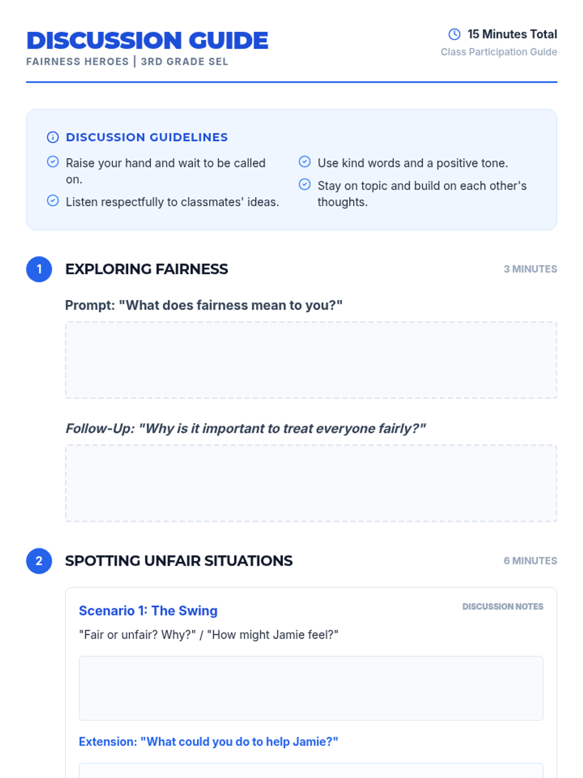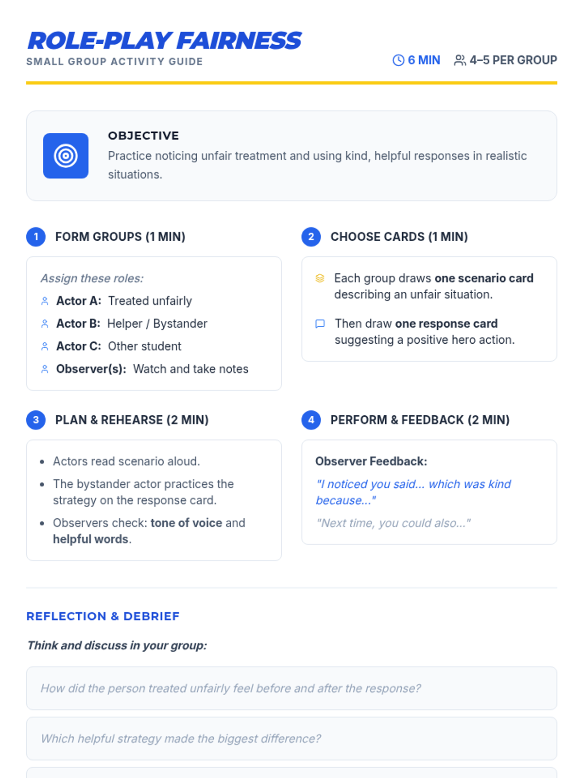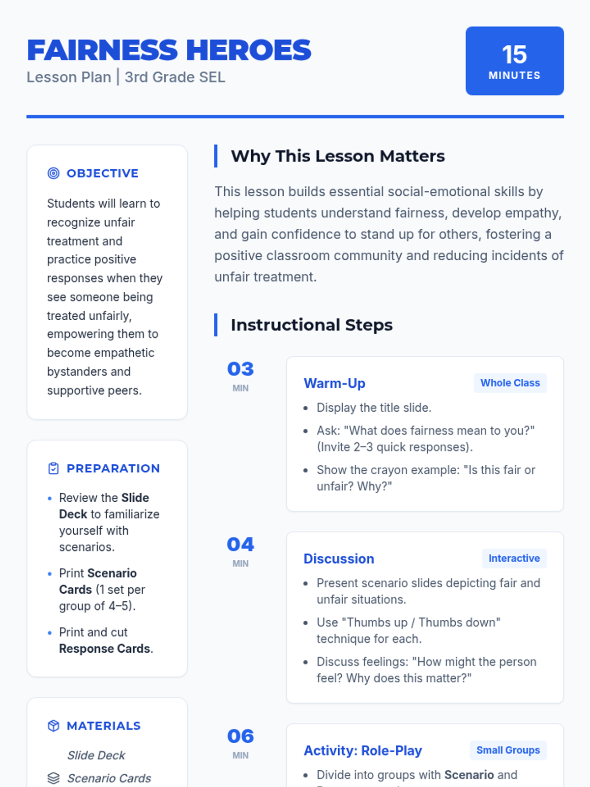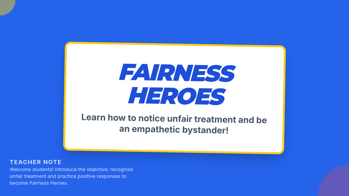 A 15-minute social-emotional learning lesson for 3rd graders focused on recognizing unfairness and practicing kind, heroic responses to support peers.