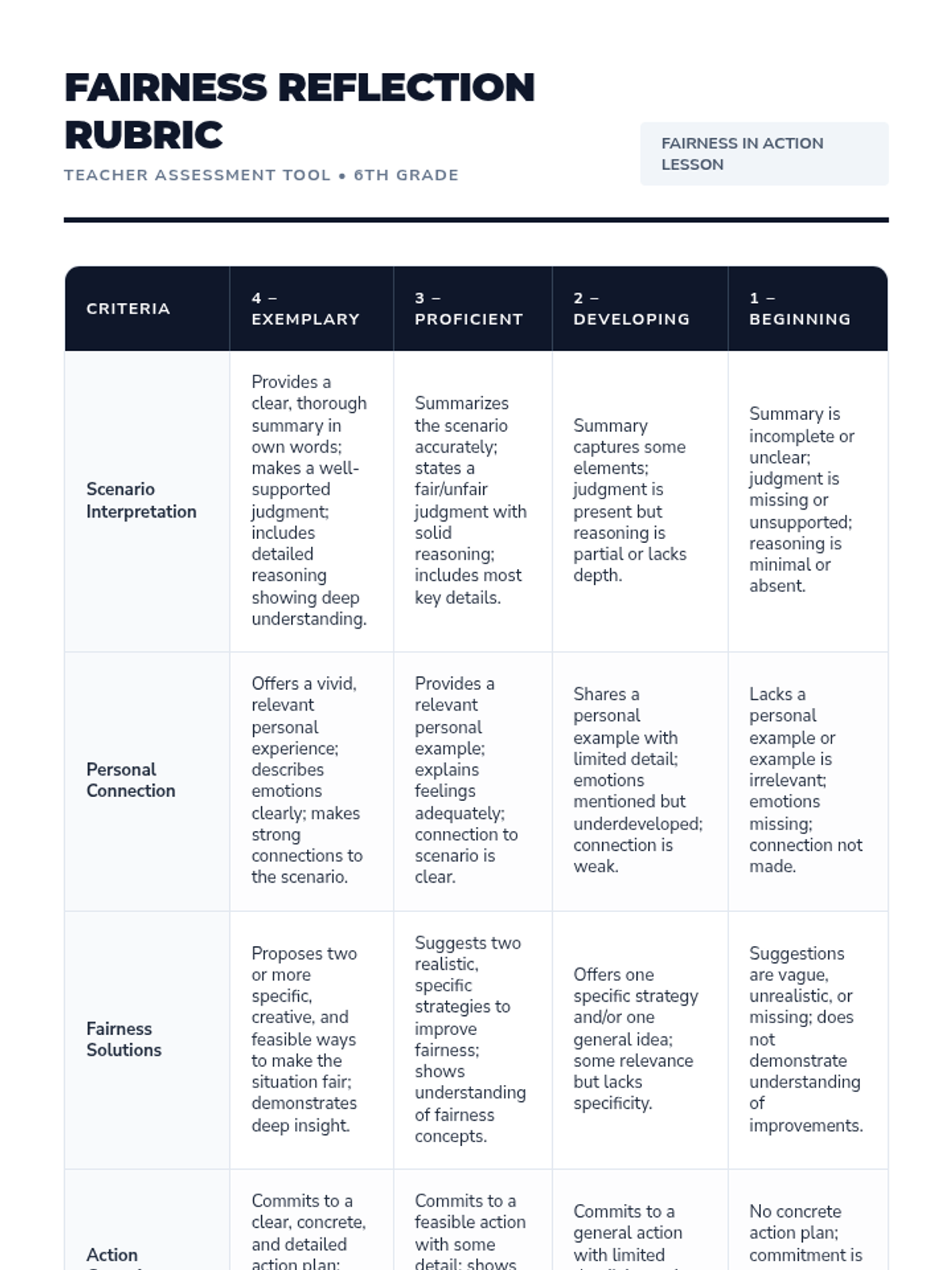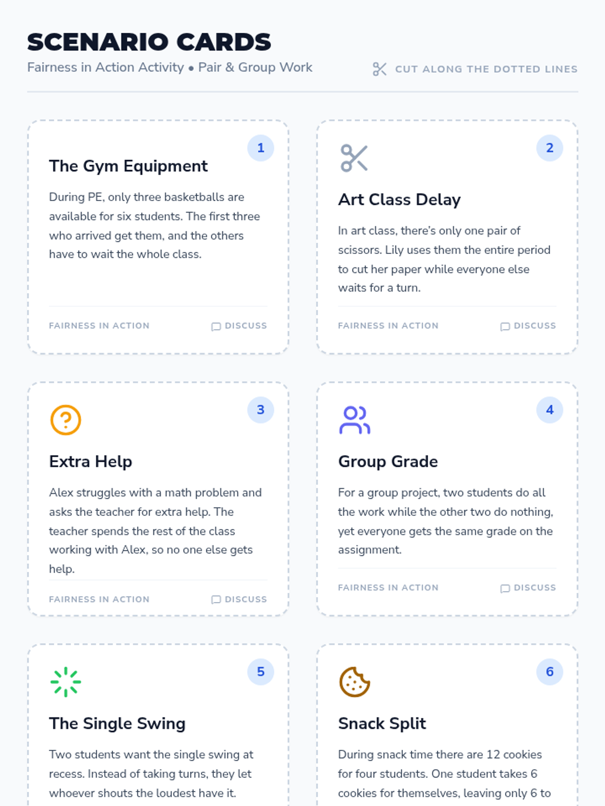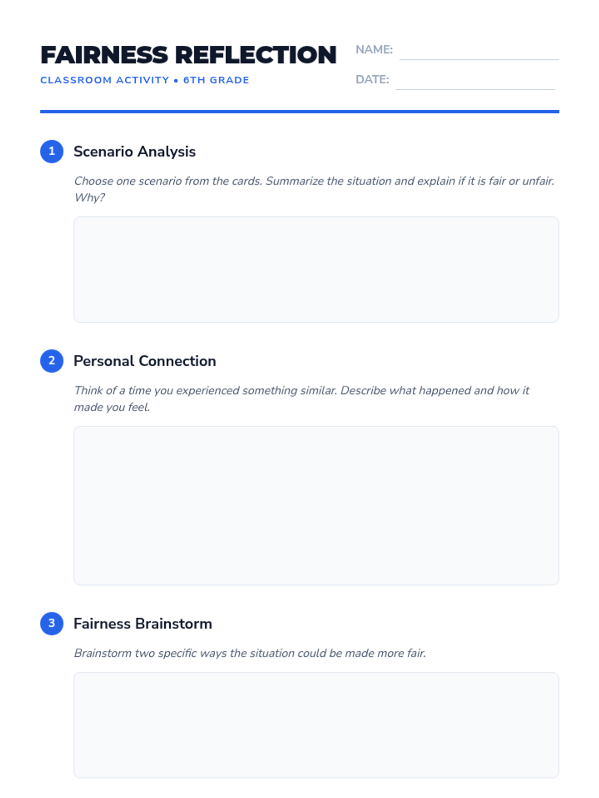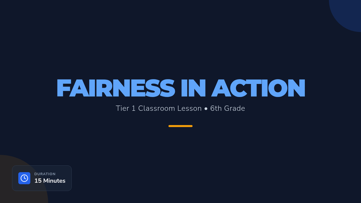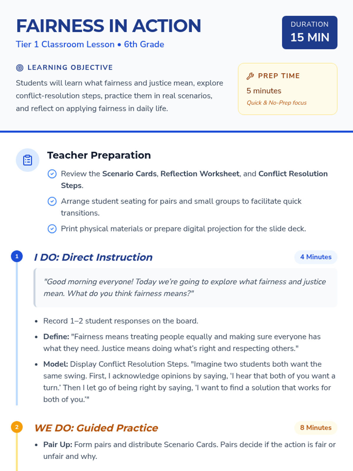 A quick, 15-minute Tier 1 classroom lesson for 6th graders to explore fairness and justice through real-life scenarios and conflict resolution strategies.