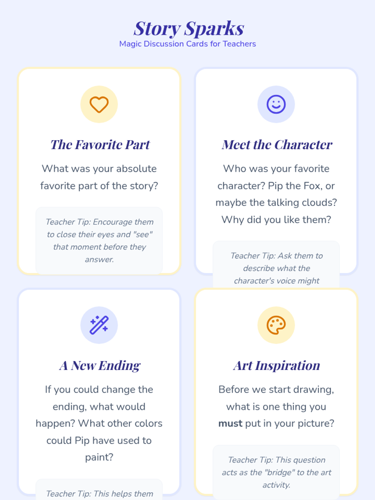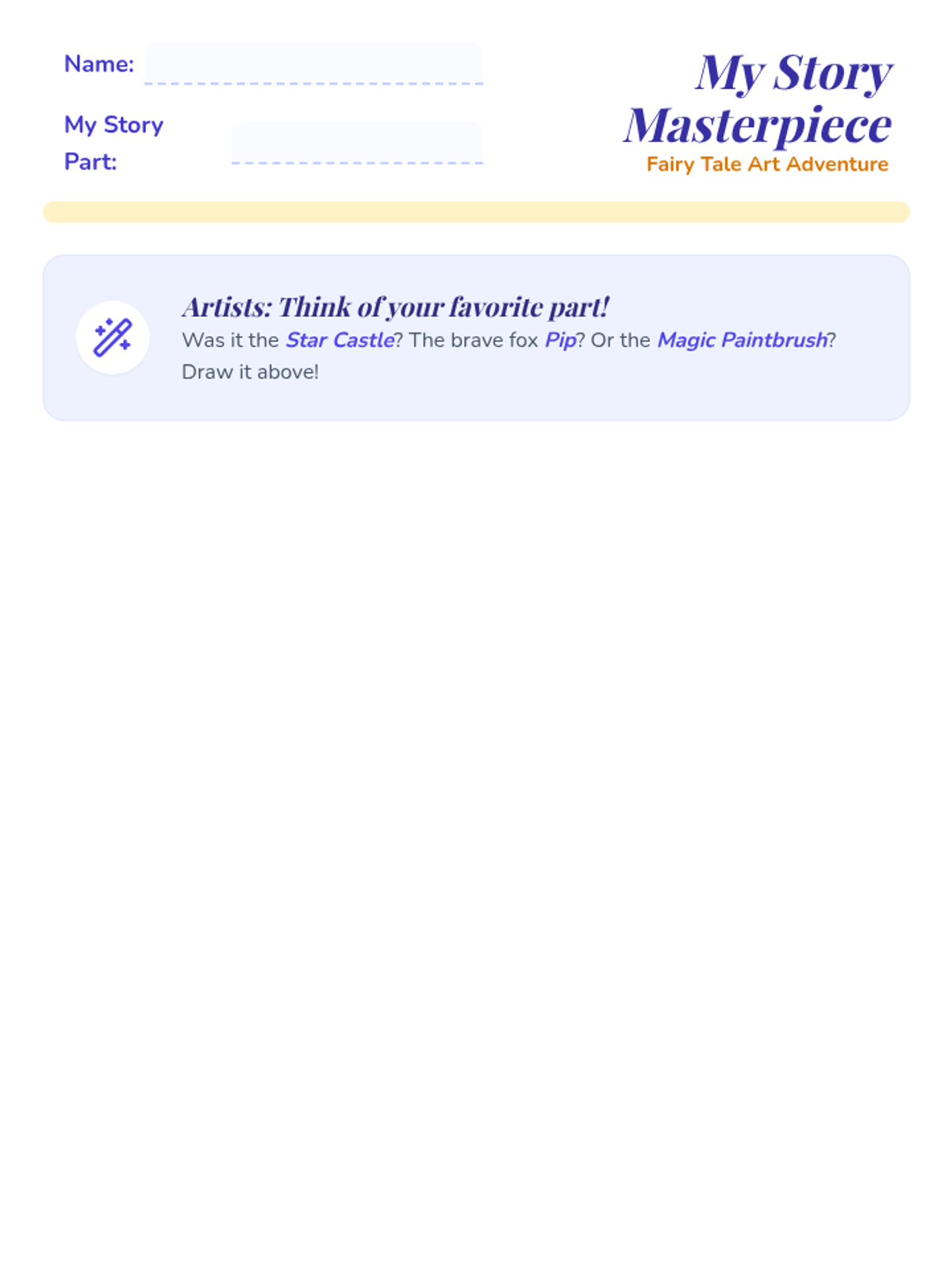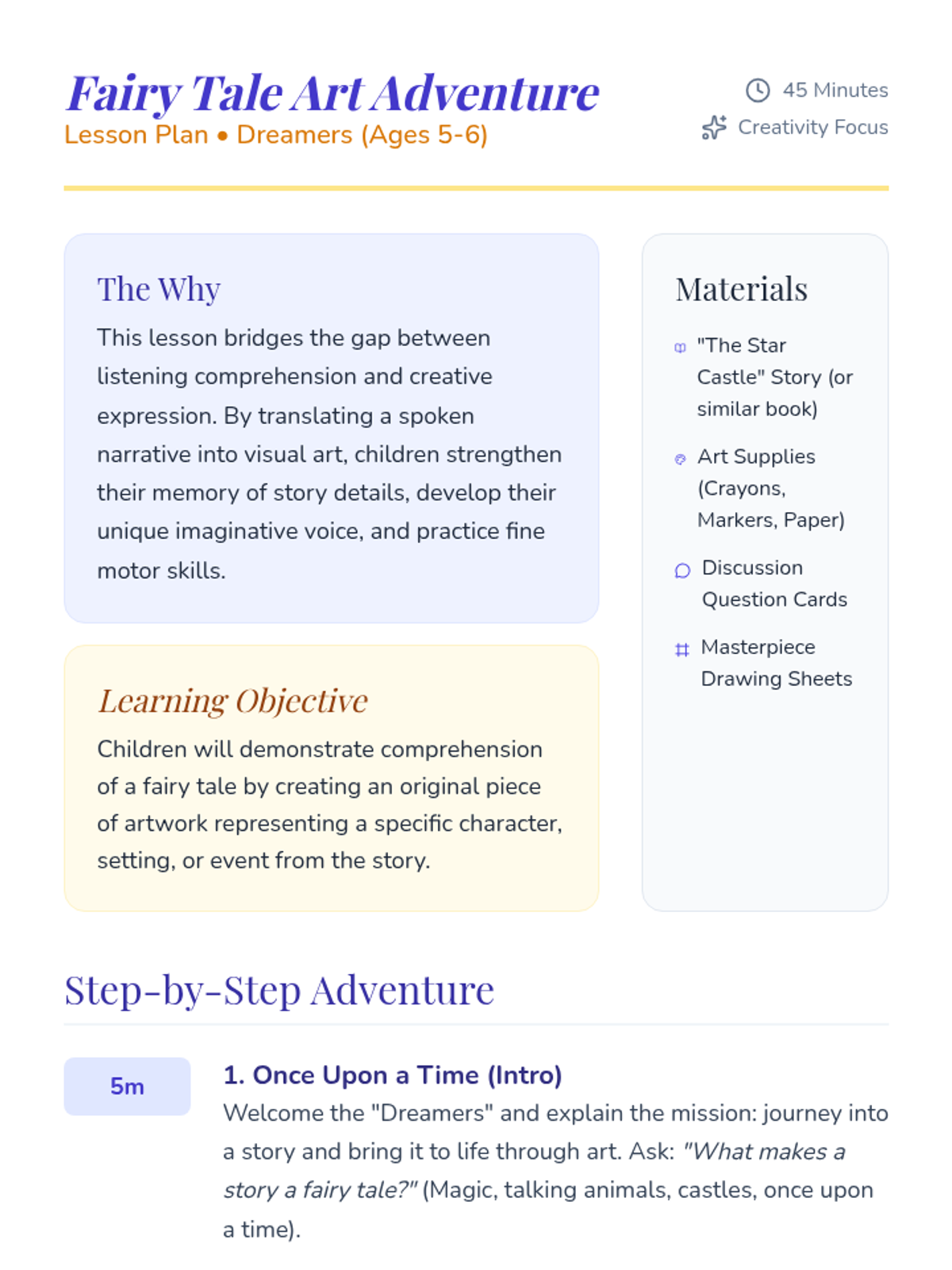 A whimsical lesson for young children (ages 5-6) that combines the magic of storytelling with creative art expression, focusing on imagination and comprehension through visual arts.
