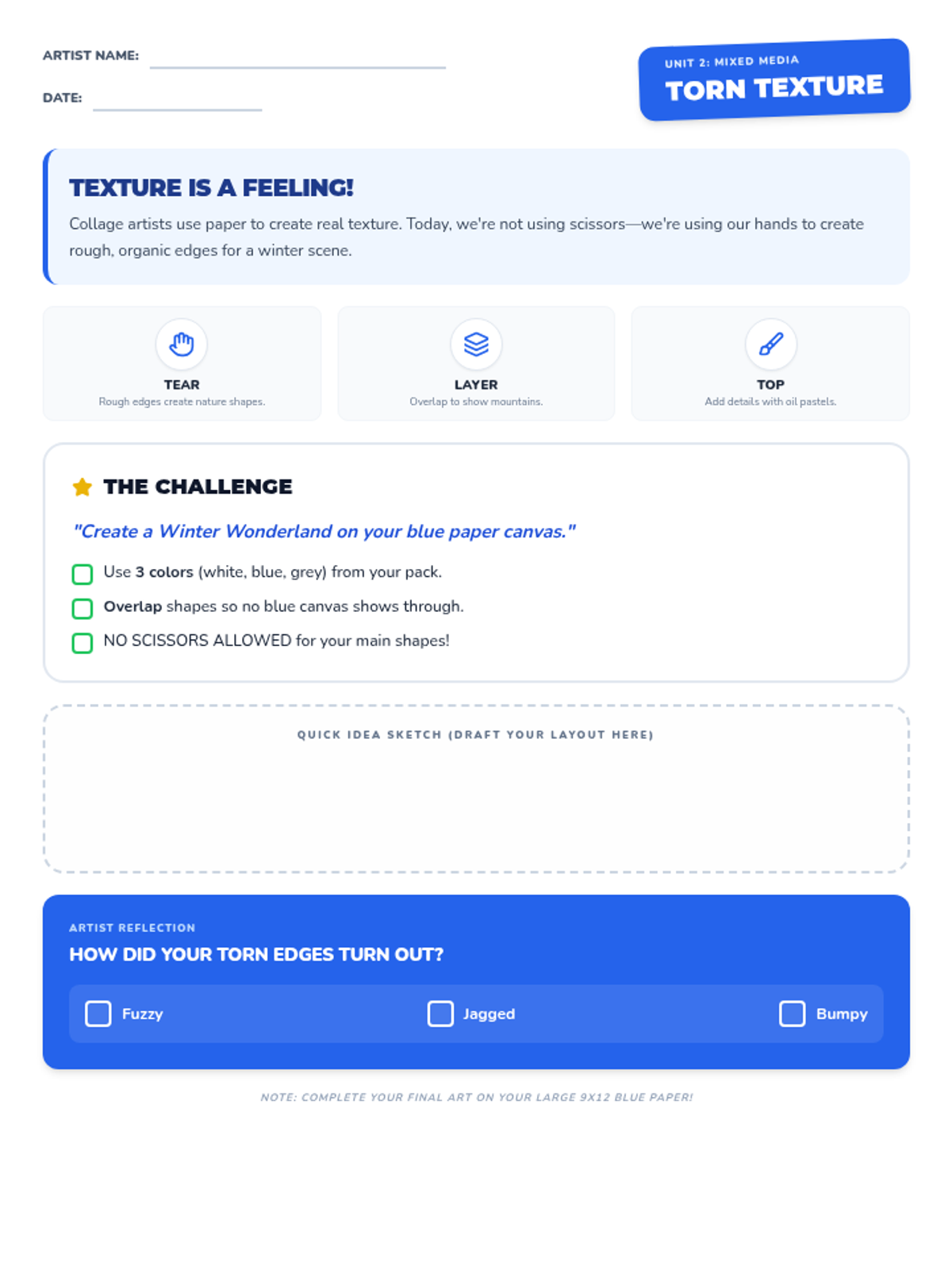 Explores tactile art-making through paper tearing, layering, and found-object assembly.