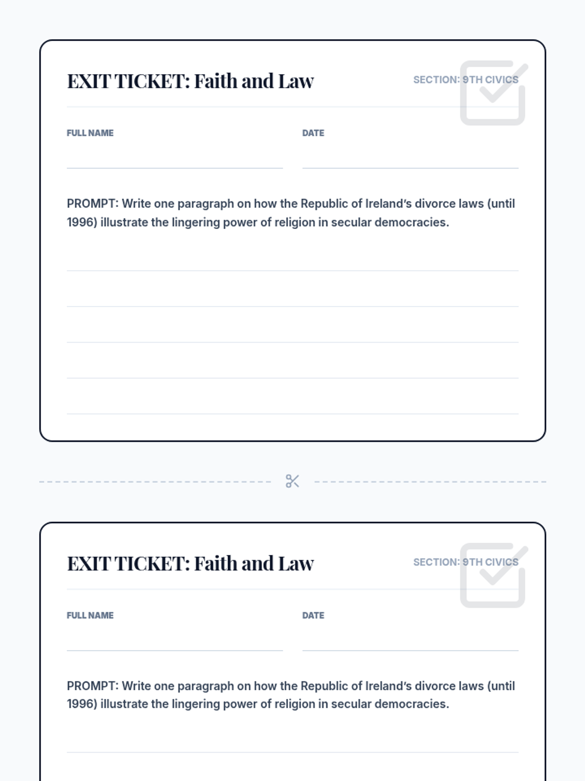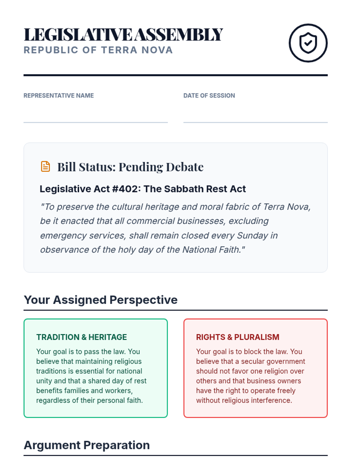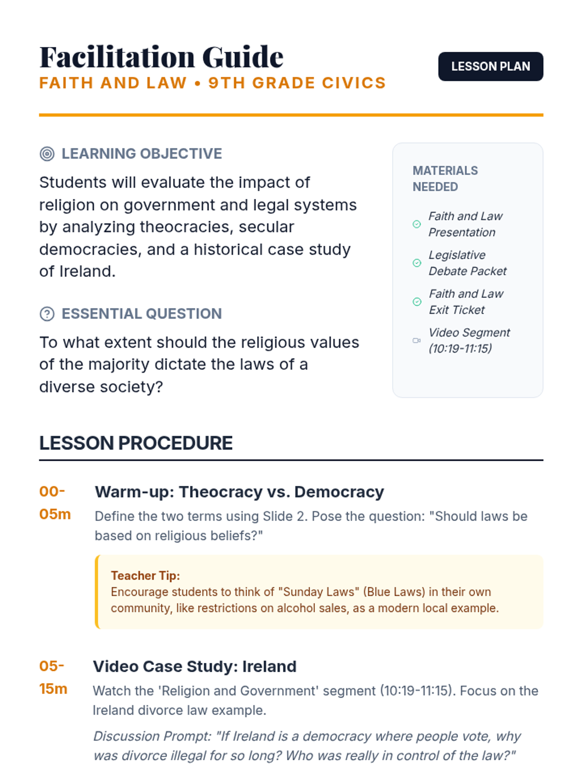 Students evaluate the complex relationship between religion and government, analyzing how religious beliefs influence legal systems in both theocracies and secular democracies through a case study of Ireland and a fictional legislative debate.