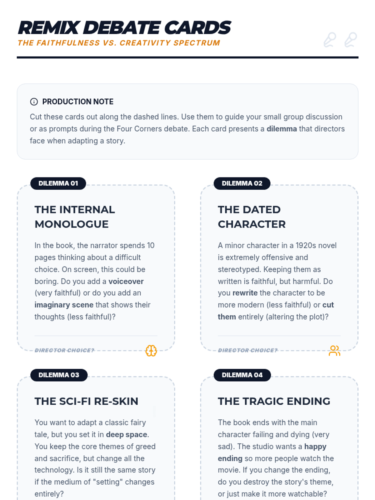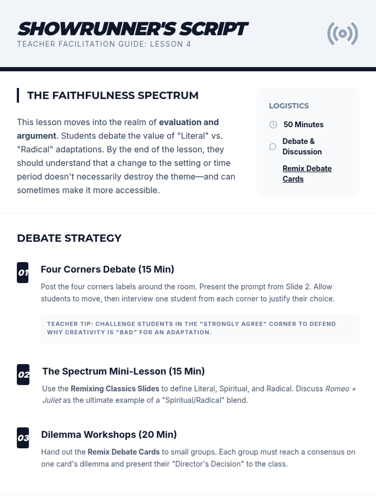 A debate-focused lesson on the spectrum of adaptation faithfulness, from literal translations to radical modern reinterpretations.