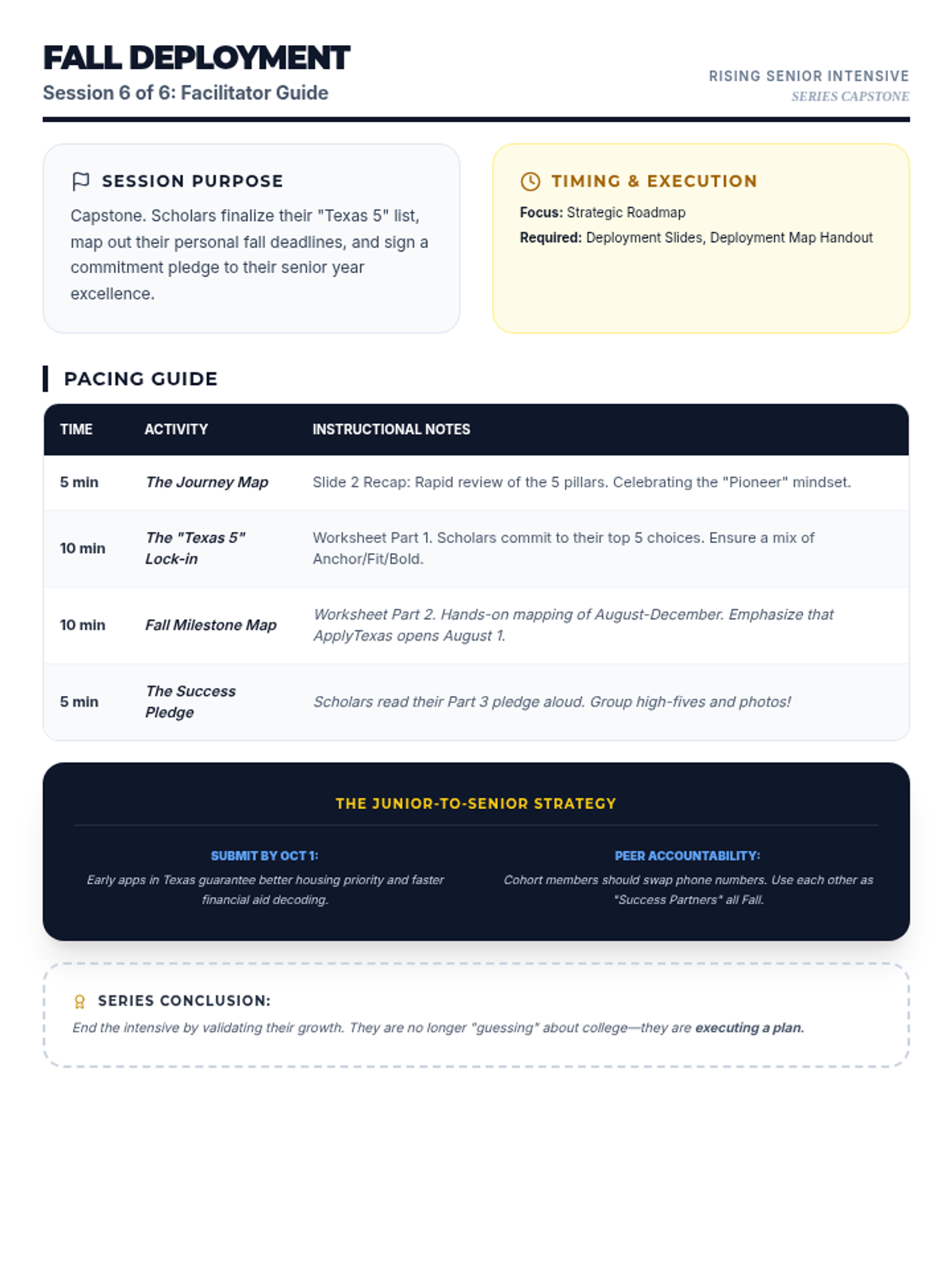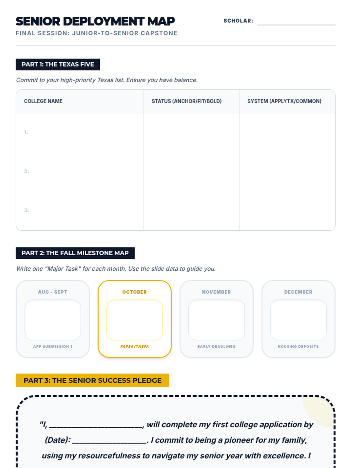 Synthesis session where scholars lock in their Fall application roadmap, finalize their Texas college list, and sign their senior success pledge.