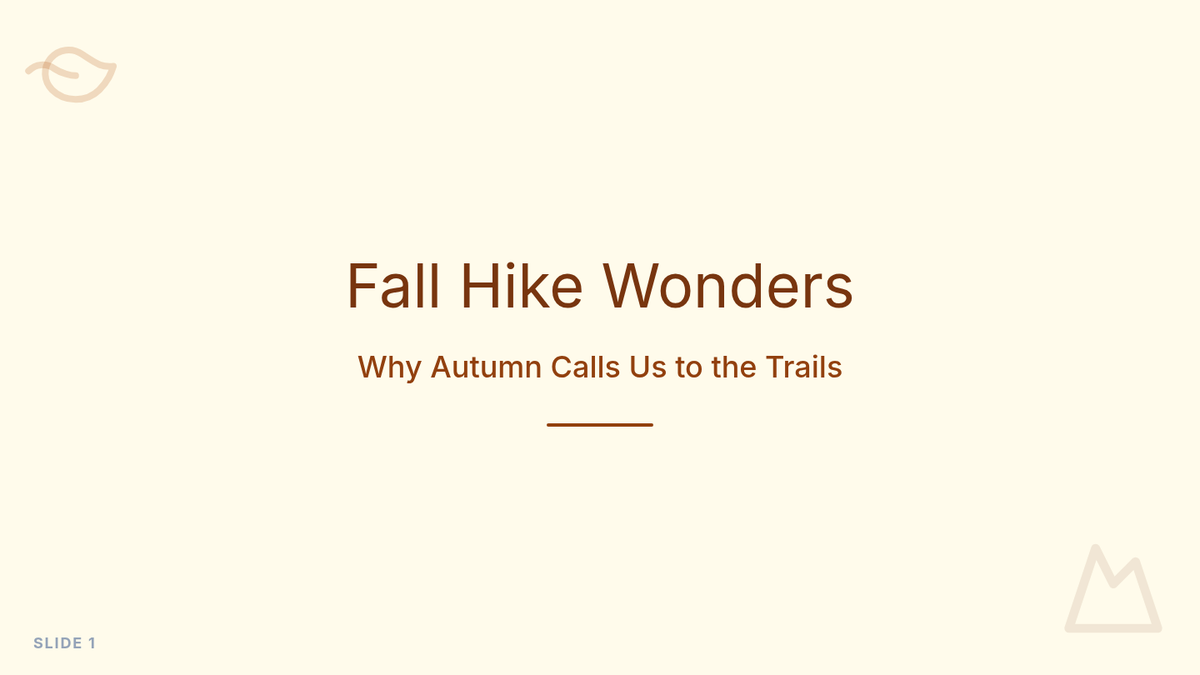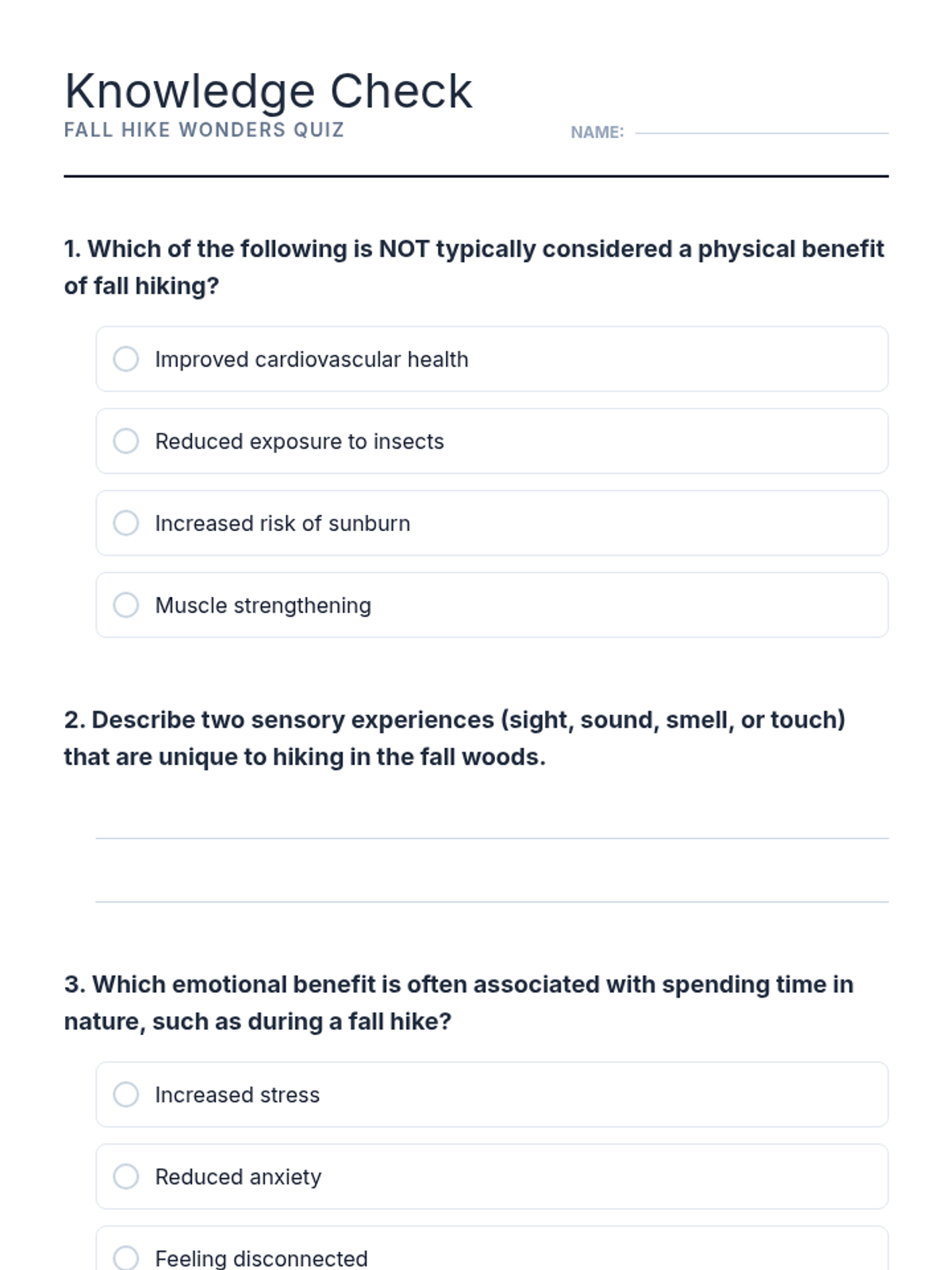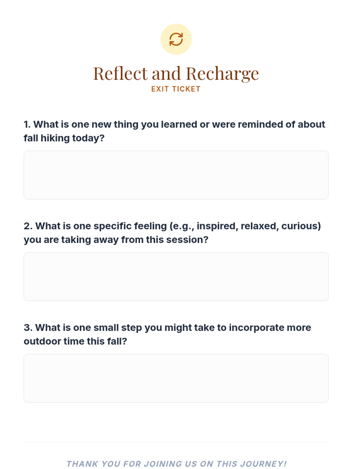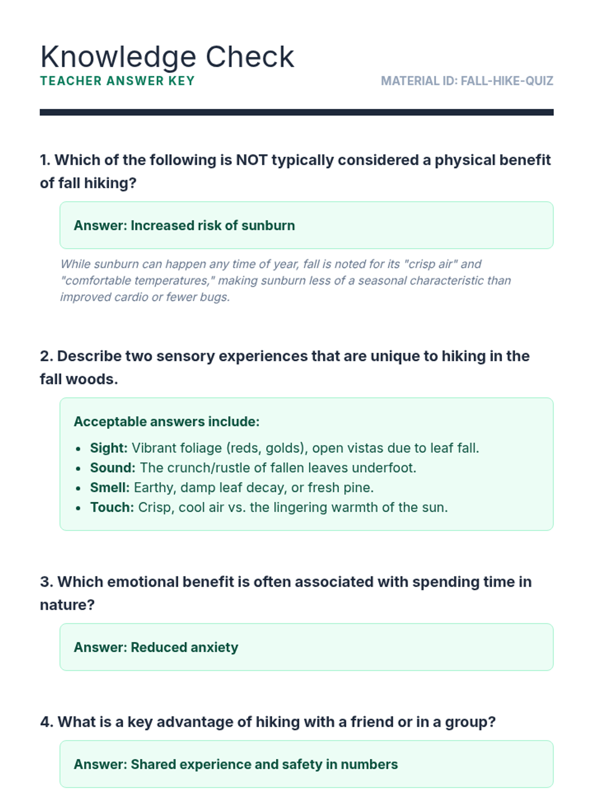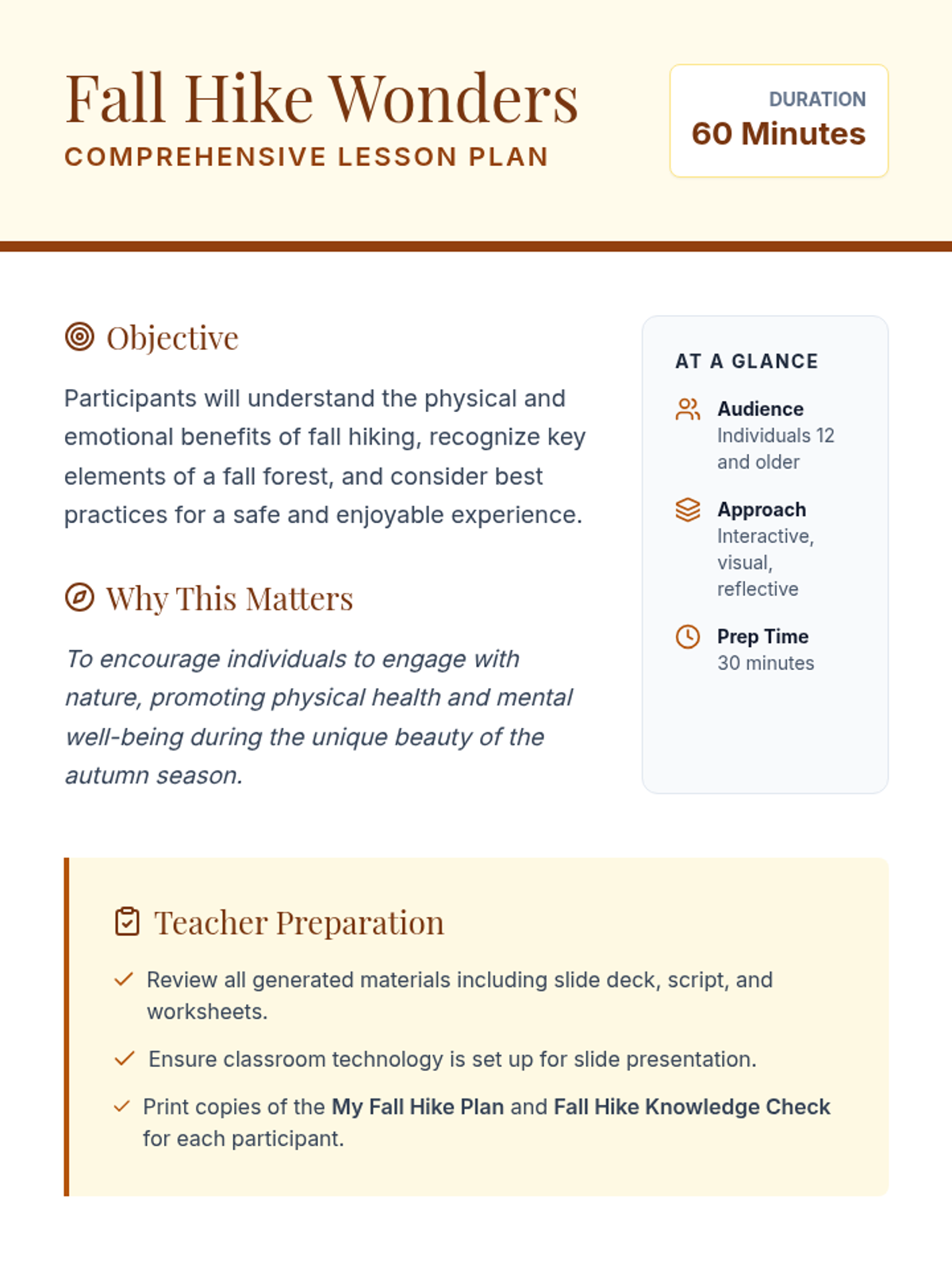 An engaging 60-minute lesson exploring the physical, emotional, and sensory benefits of hiking during the autumn season. Participants will learn about forest transformation, safety considerations, and plan their own fall adventure.