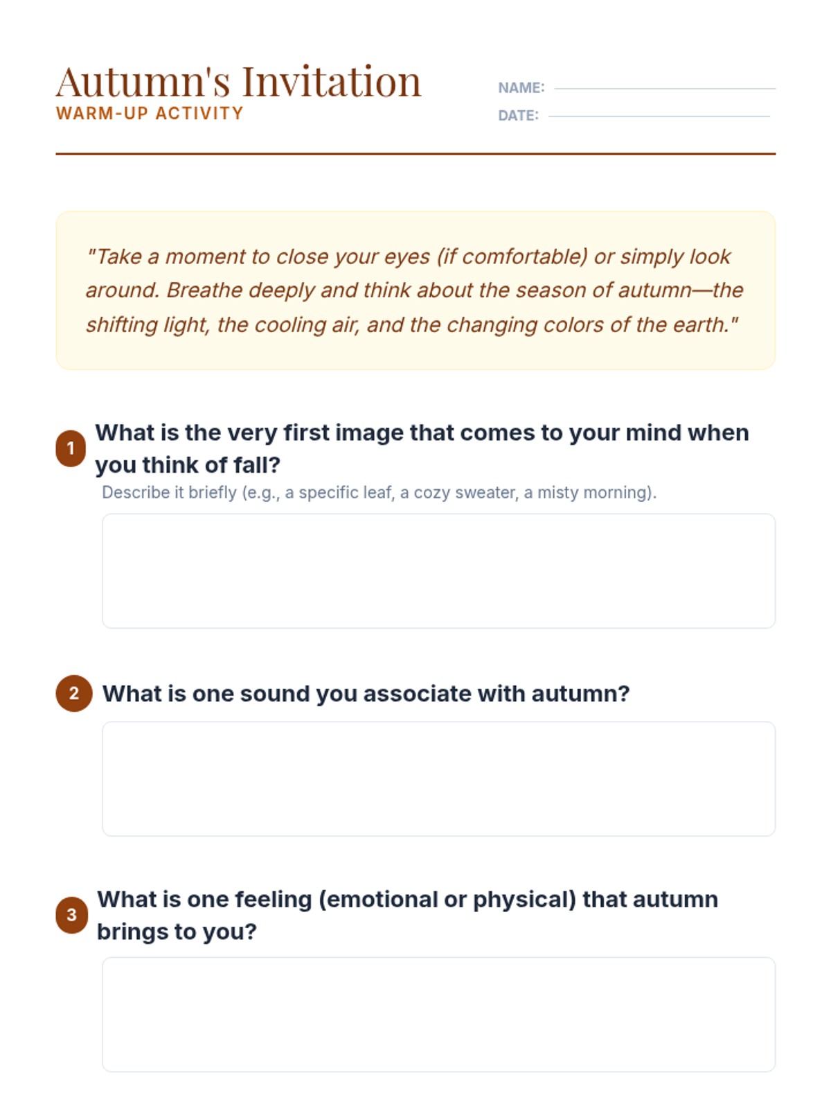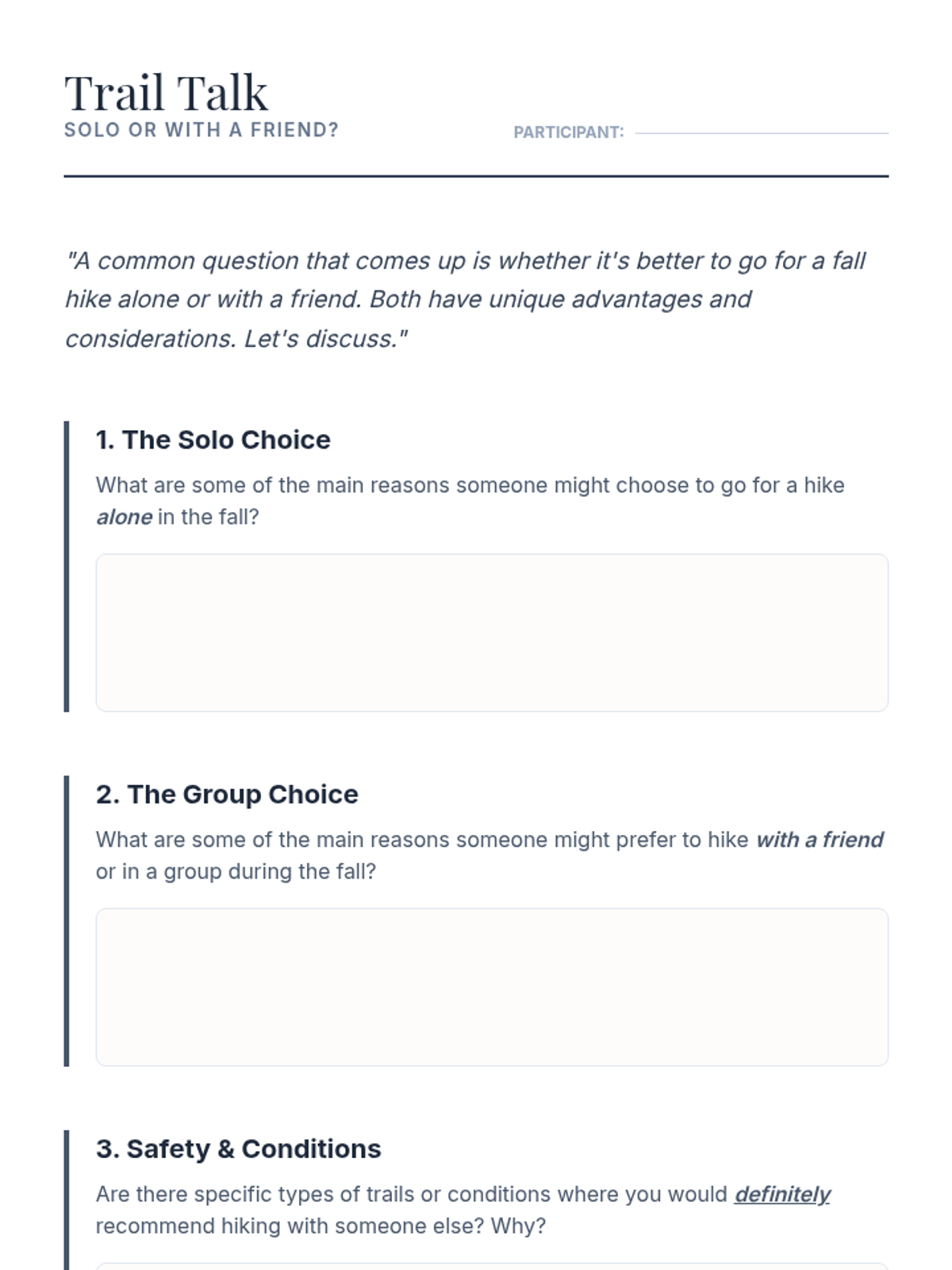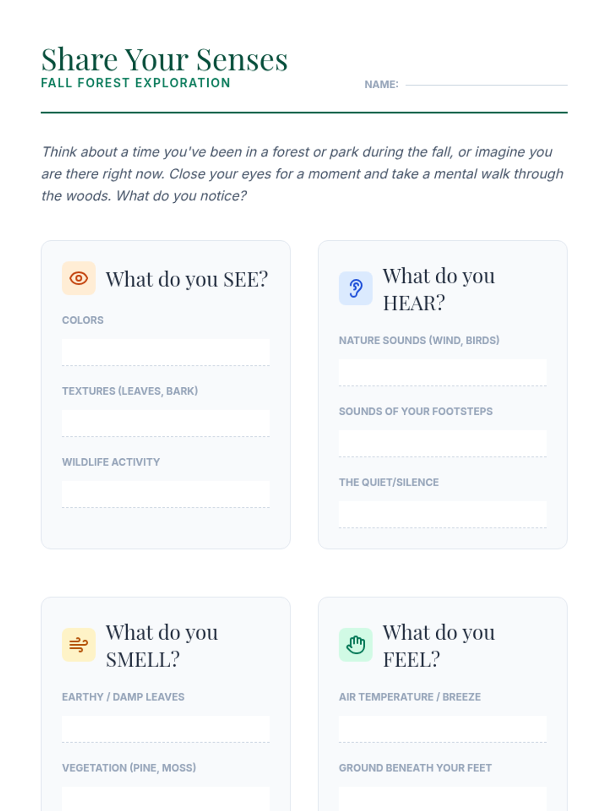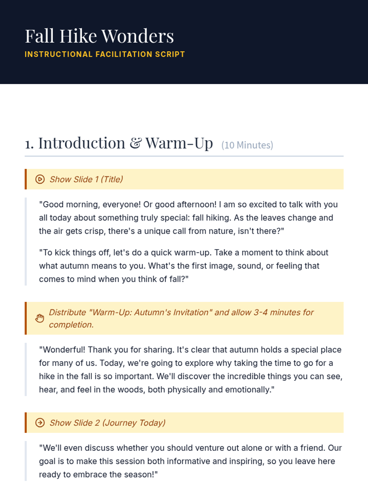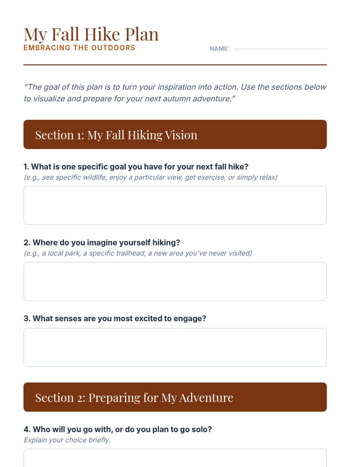 An engaging 60-minute lesson exploring the physical, emotional, and sensory benefits of hiking during the autumn season. Participants will learn about forest transformation, safety considerations, and plan their own fall adventure.