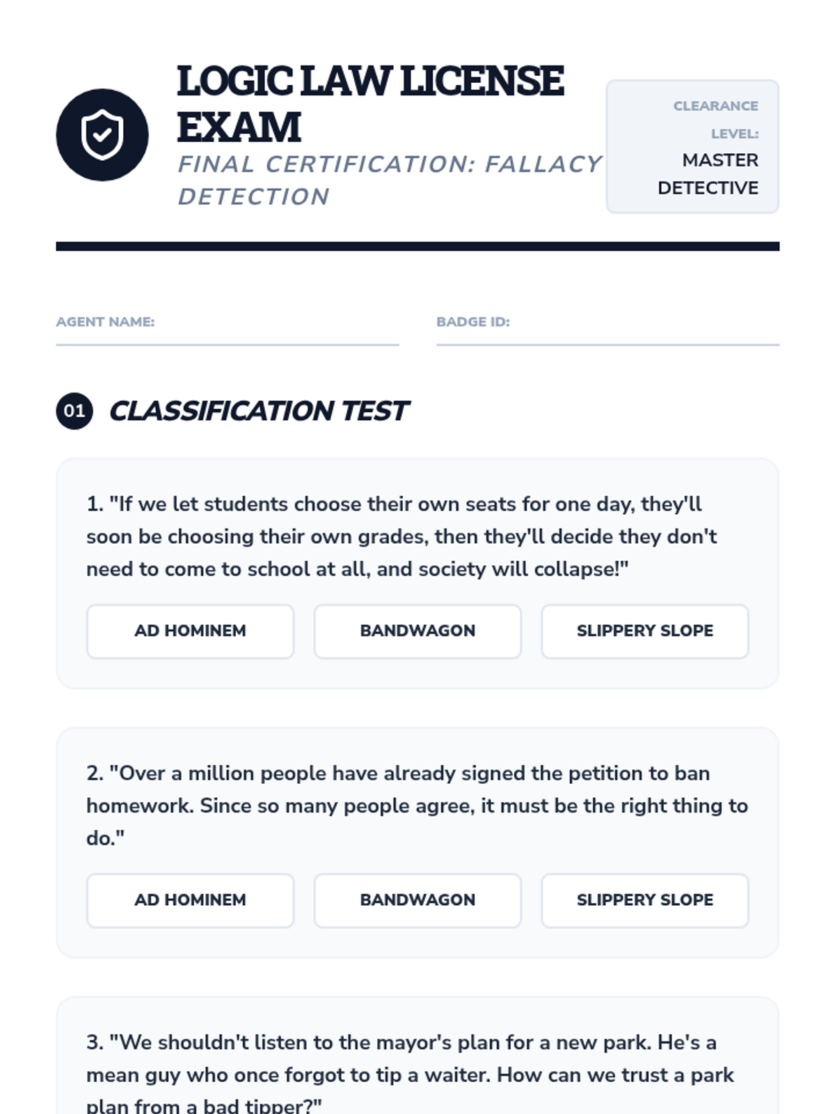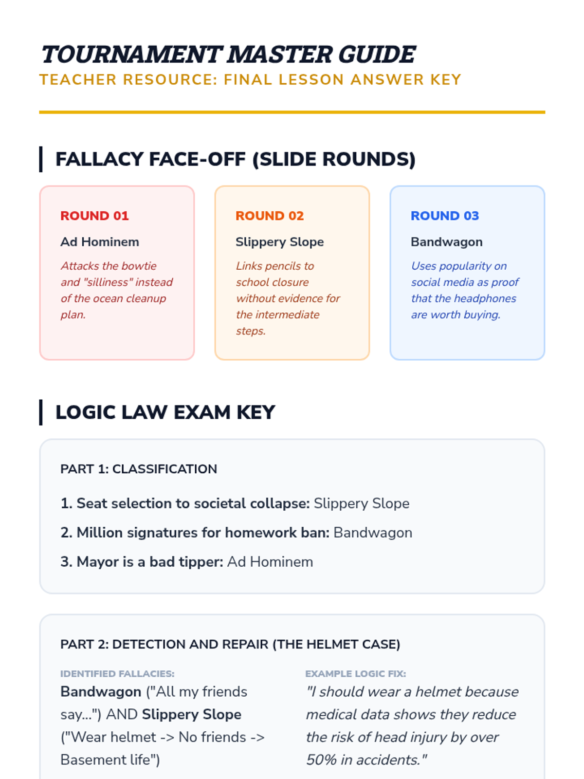 A cumulative tournament where students compete to correctly categorize various logical fallacies in real-time.