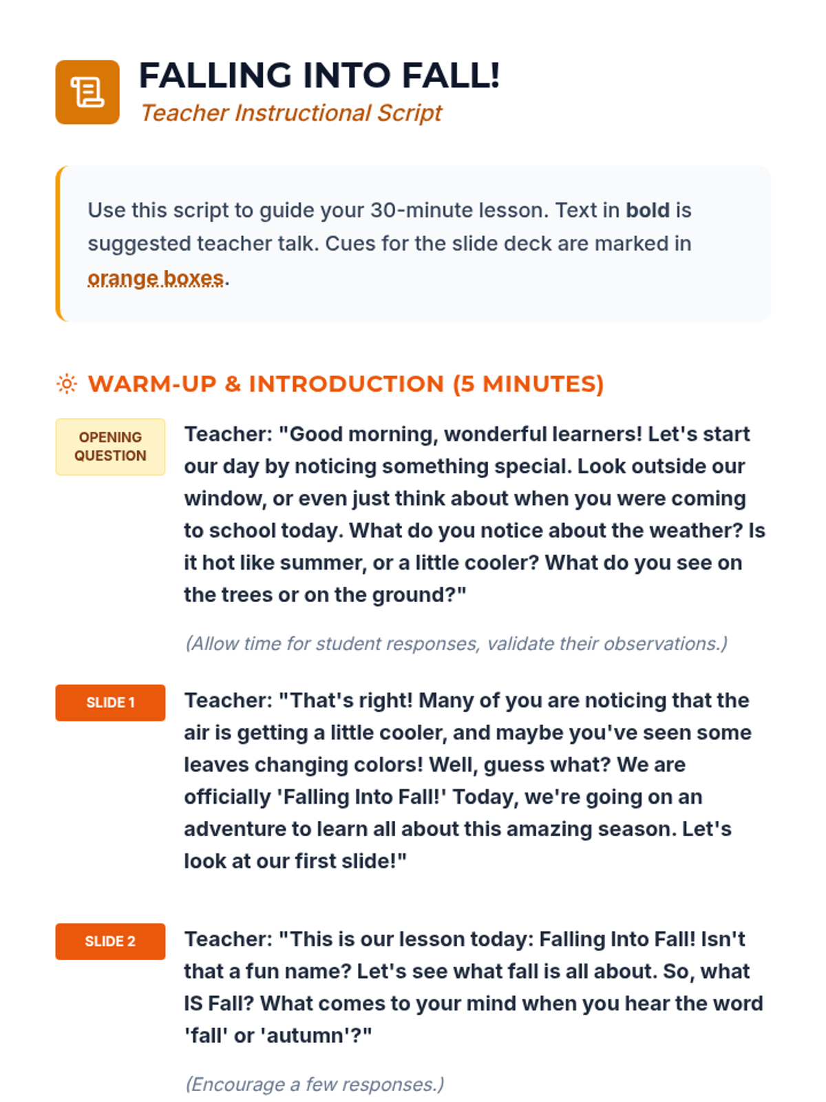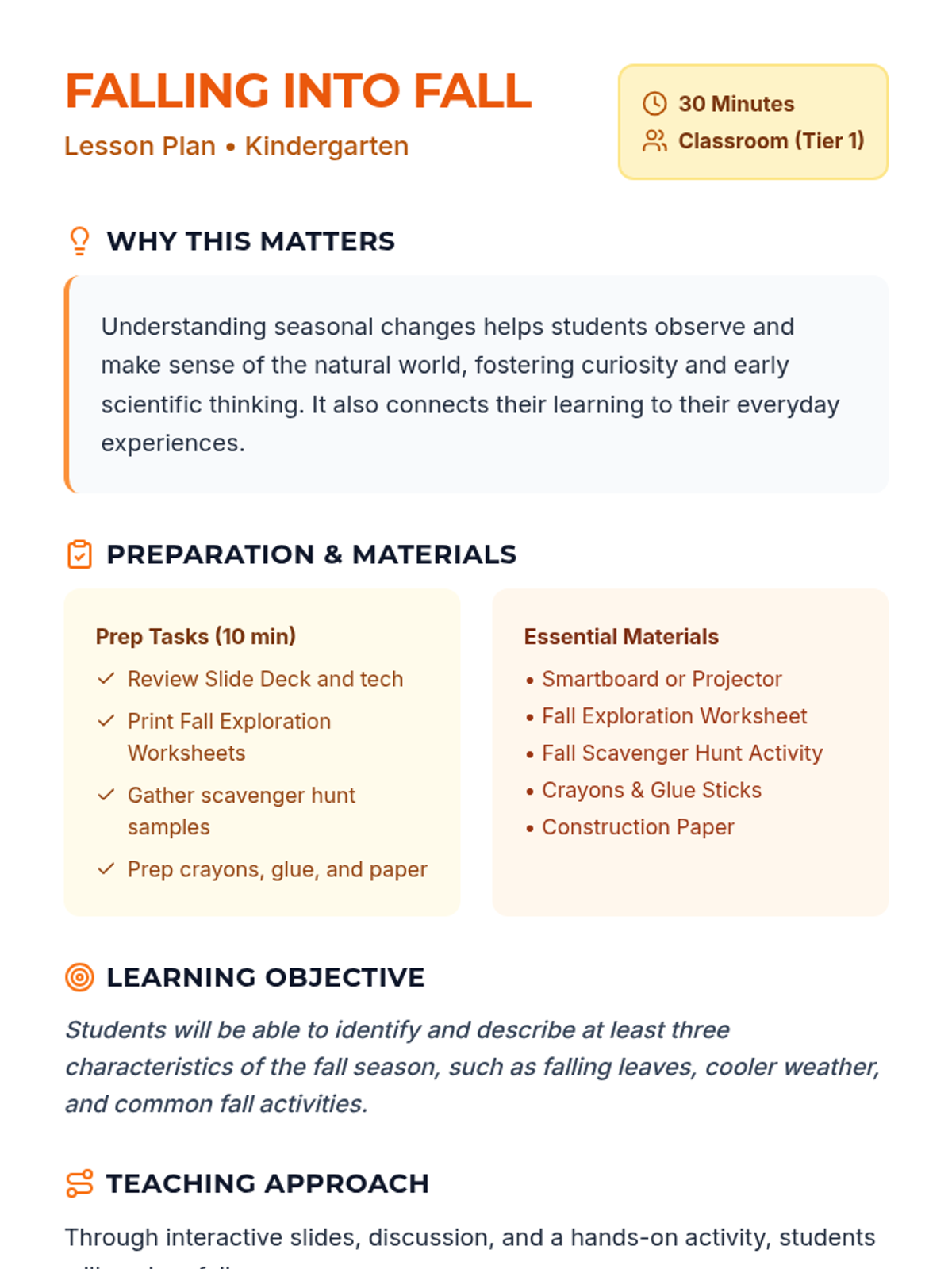 A 30-minute introductory lesson for Kindergarten students exploring the changes in nature during the fall season through interactive slides, discussion, and a hands-on drawing activity.