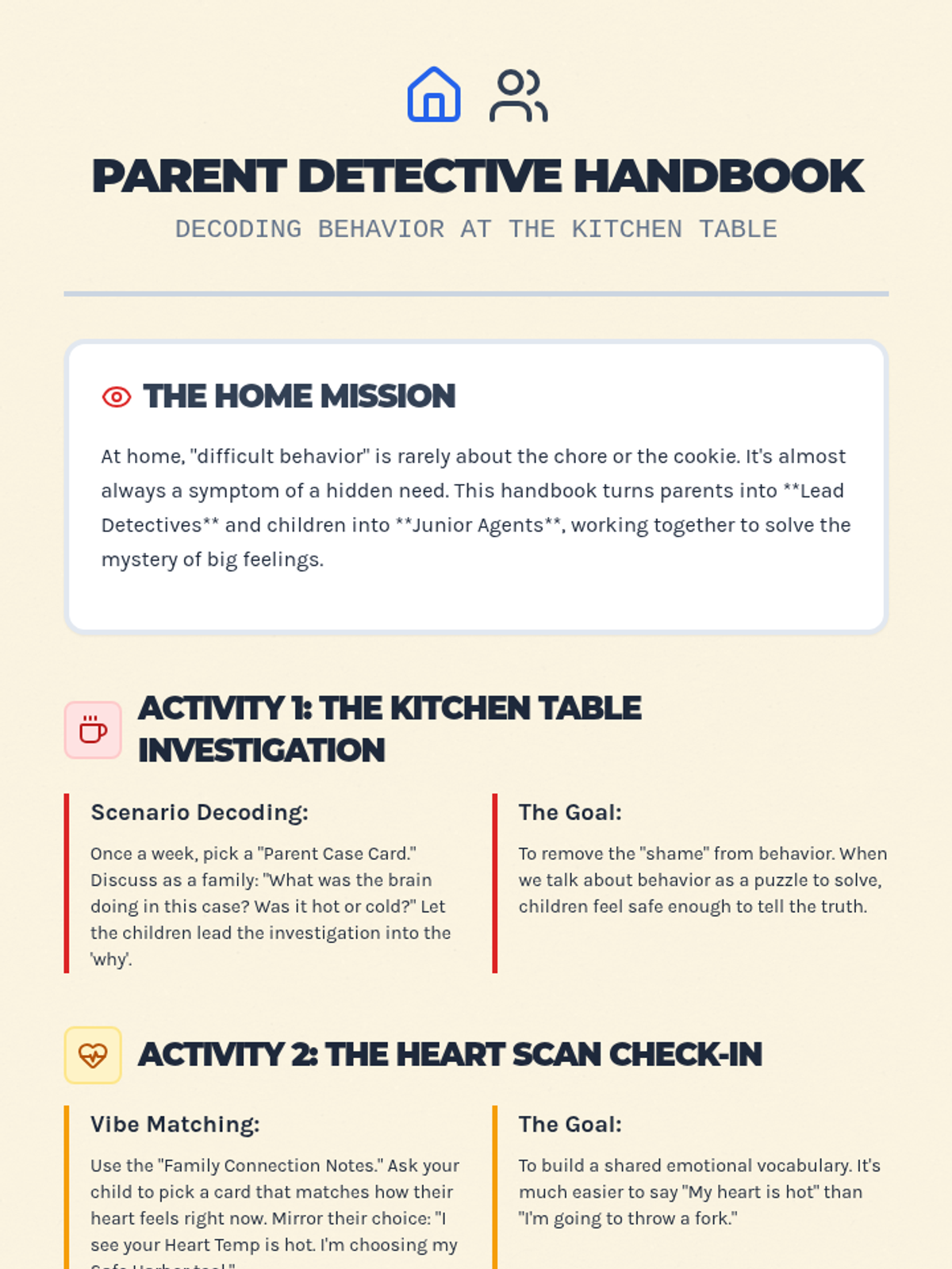A detective-themed guide for parents and children to decode difficult behaviors at home. By using 'investigative curiosity' and 'heart reports,' families turn tantrums and cheating into opportunities for deeper connection and mutual understanding.