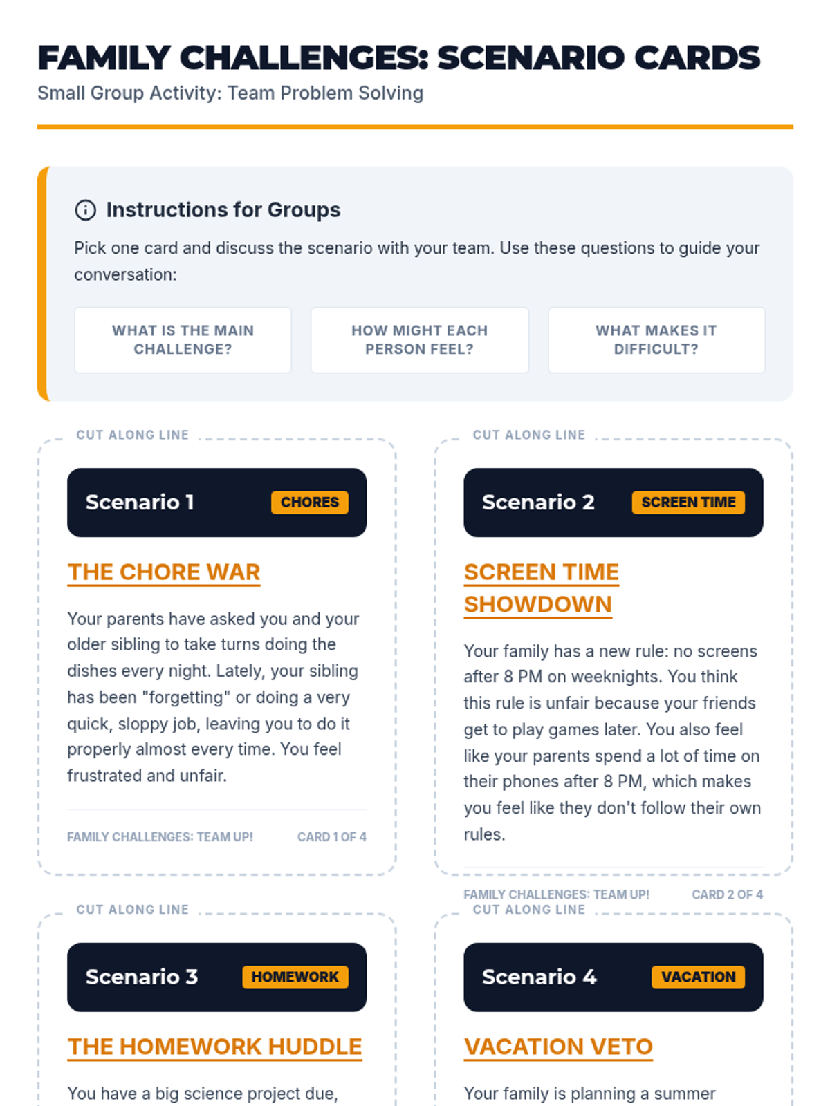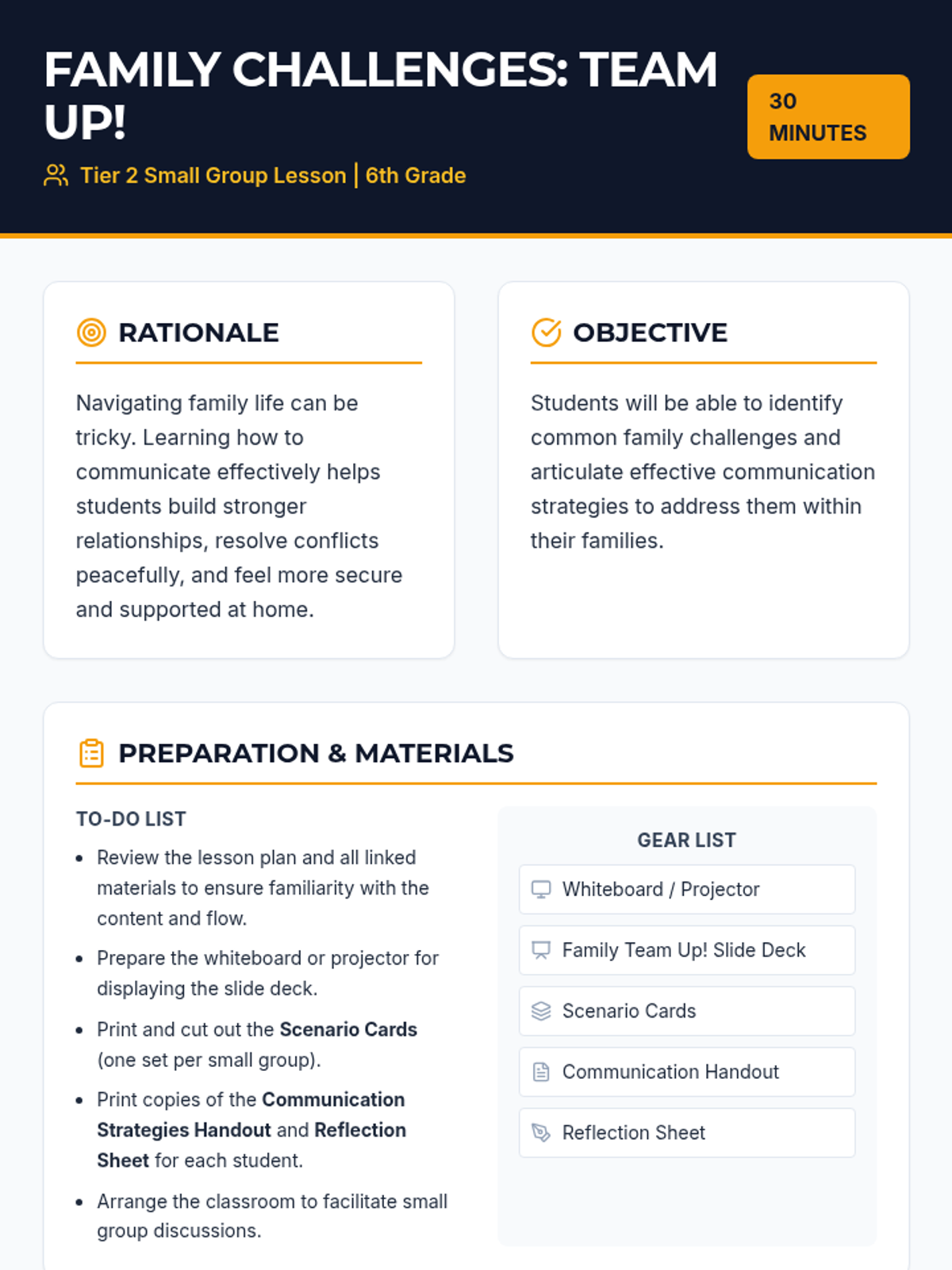 This 30-minute Tier 2 lesson helps 6th-grade students develop communication and collaboration strategies to overcome family challenges through empathy and problem-solving.