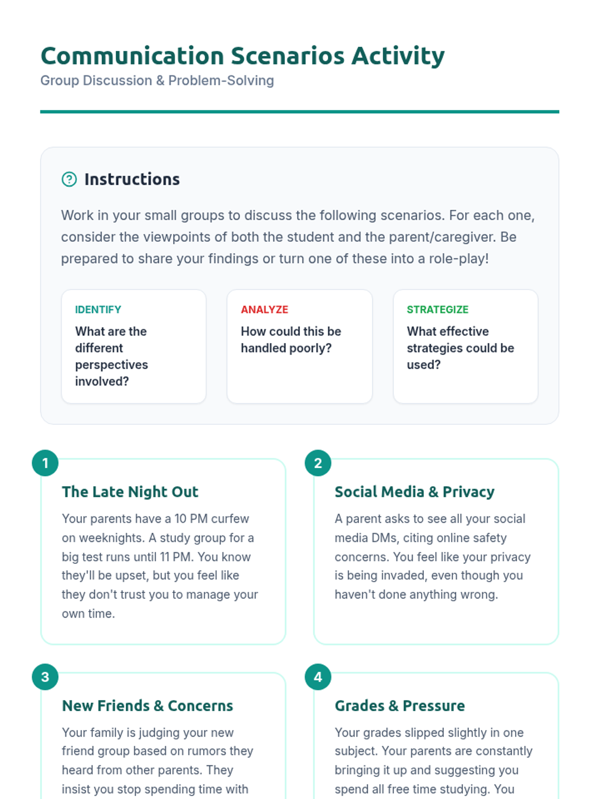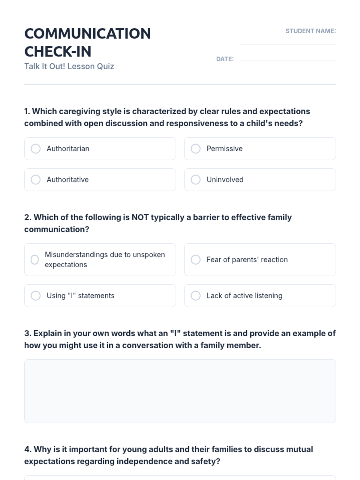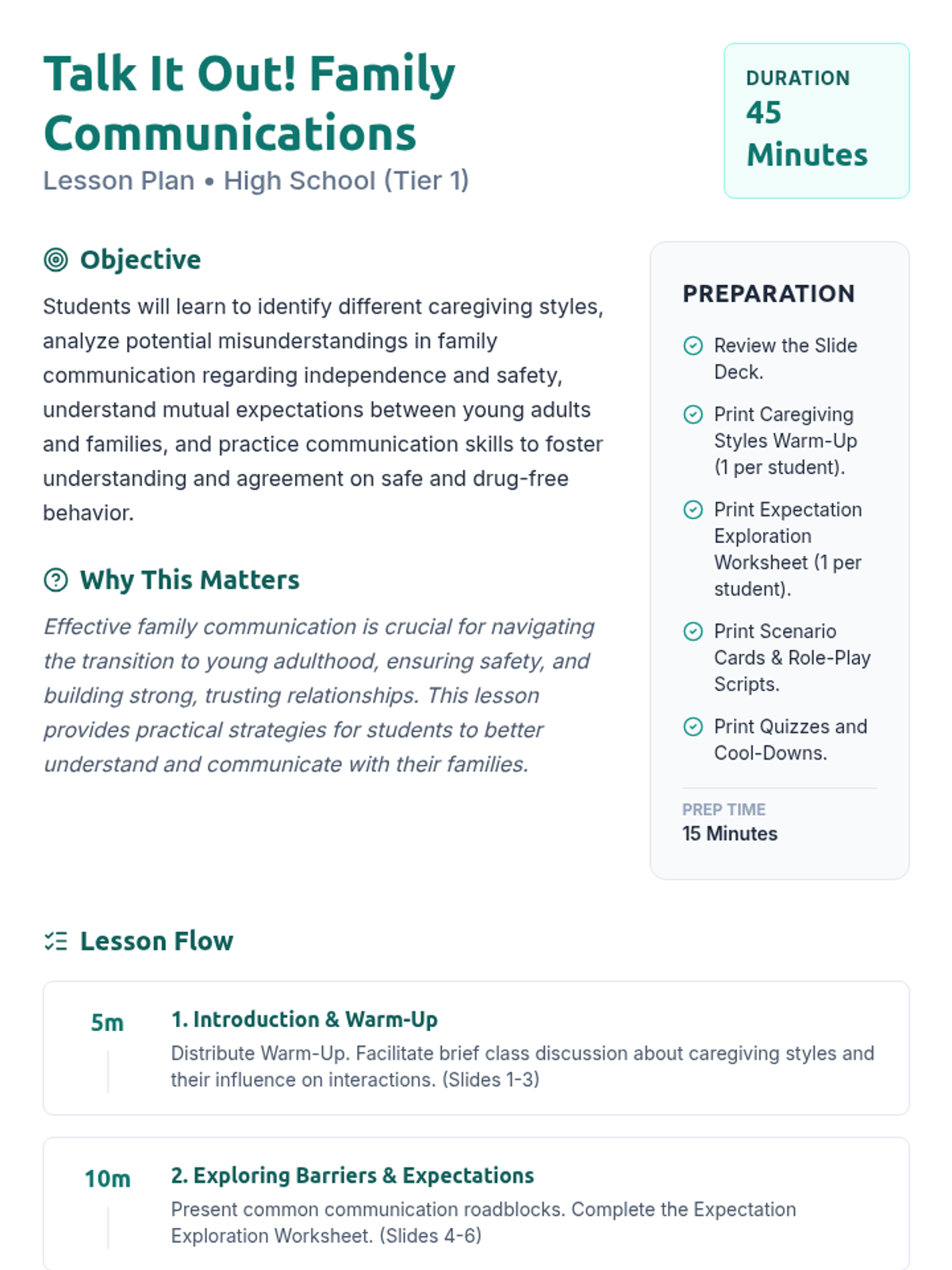 A 45-minute lesson for high school students focused on developing effective communication skills with family members to navigate independence and safety. Students explore caregiving styles, identify communication barriers, and practice strategies like 'I' statements and active listening through role-play and interactive activities.