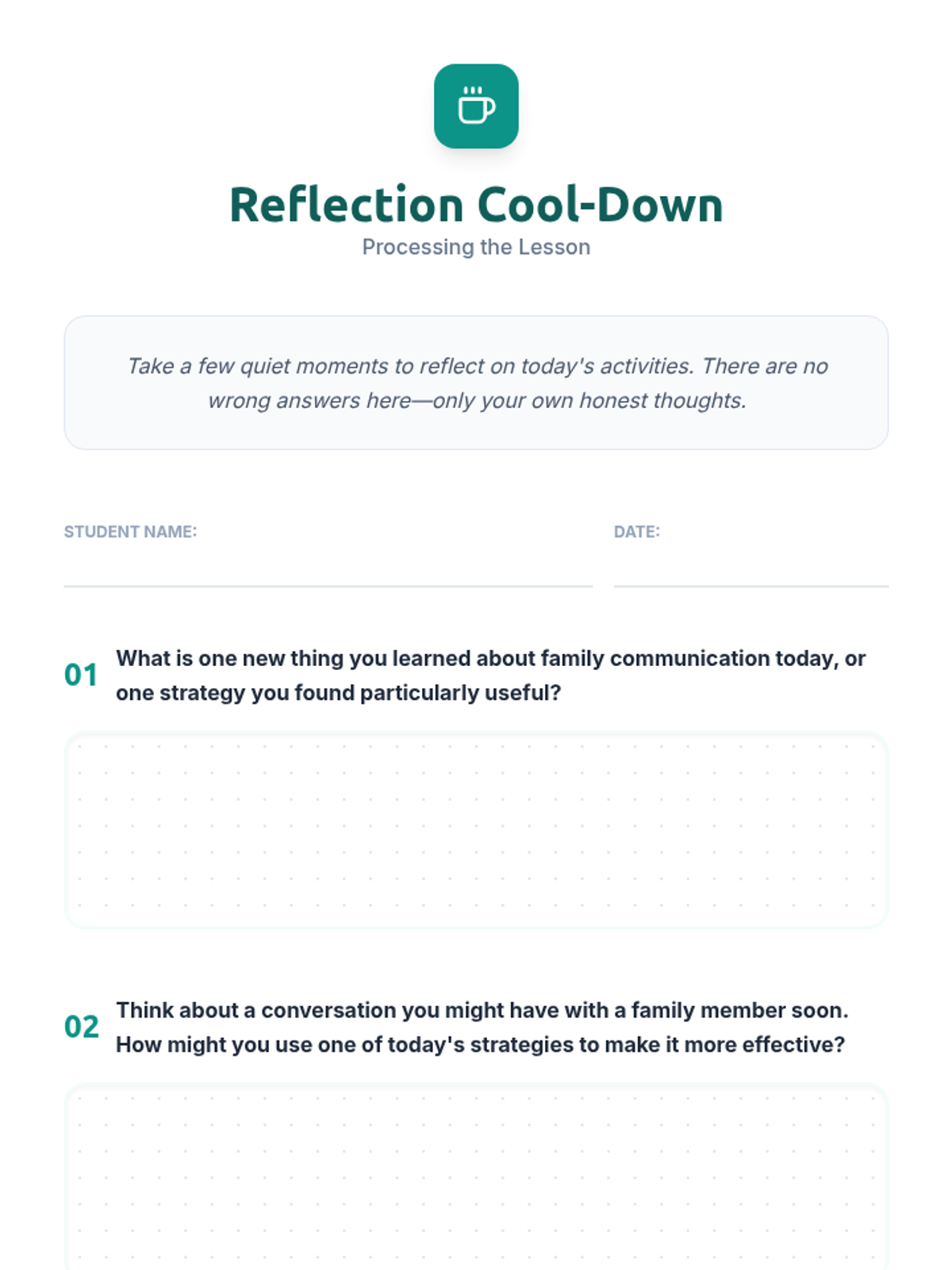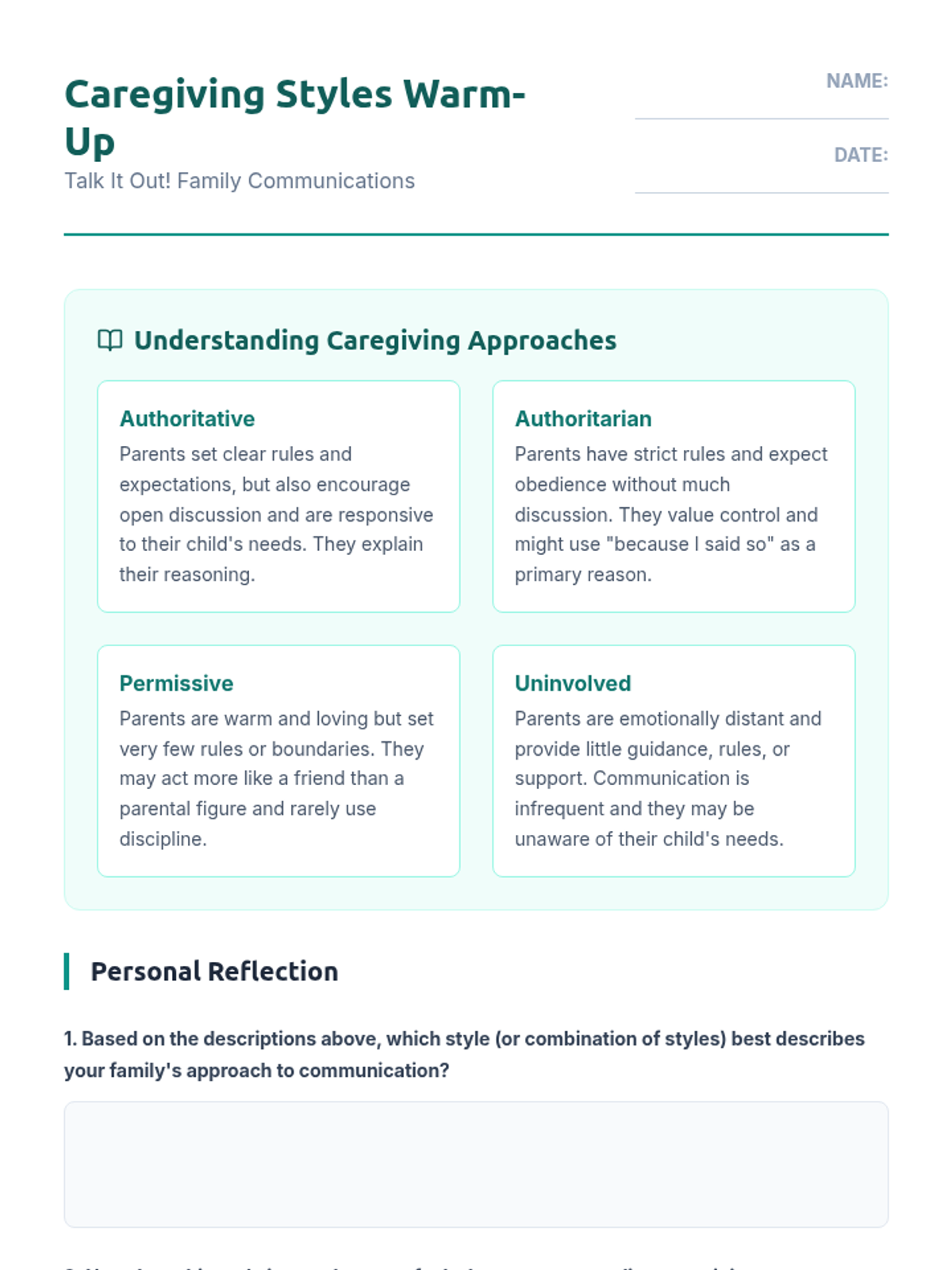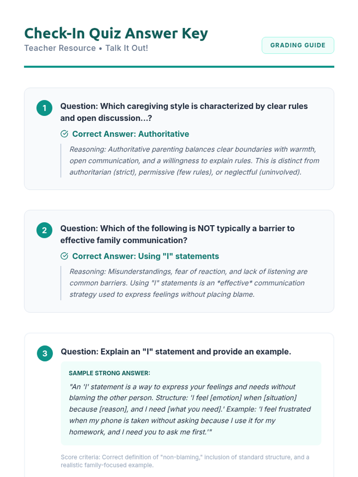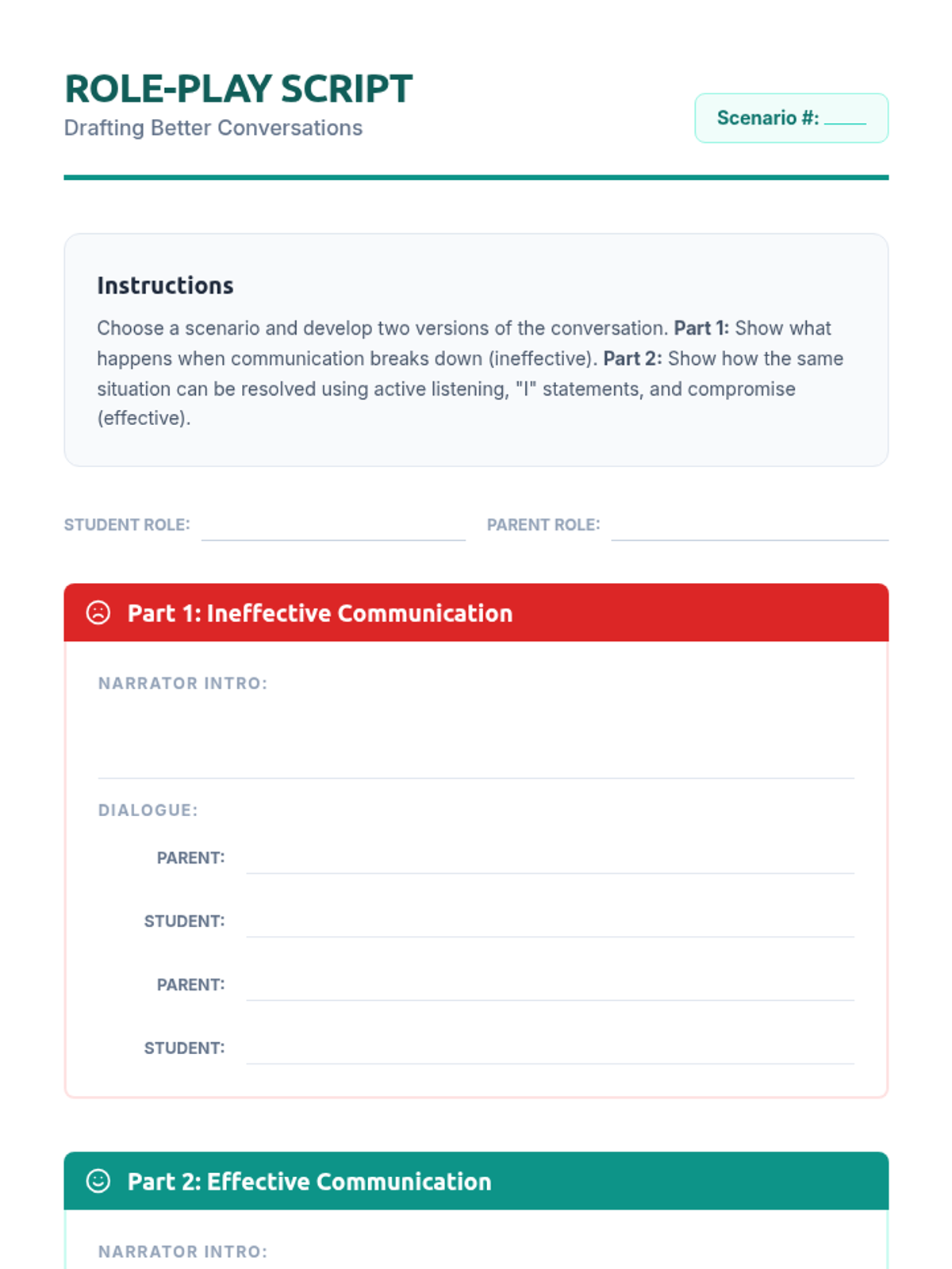 A 45-minute lesson for high school students focused on developing effective communication skills with family members to navigate independence and safety. Students explore caregiving styles, identify communication barriers, and practice strategies like 'I' statements and active listening through role-play and interactive activities.