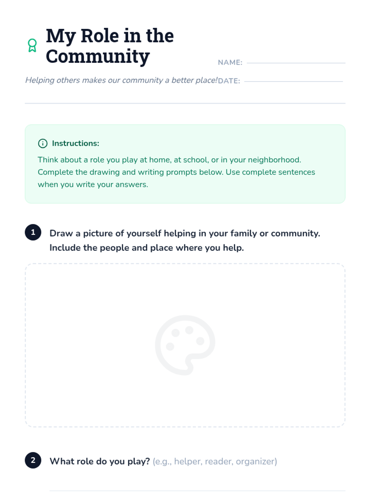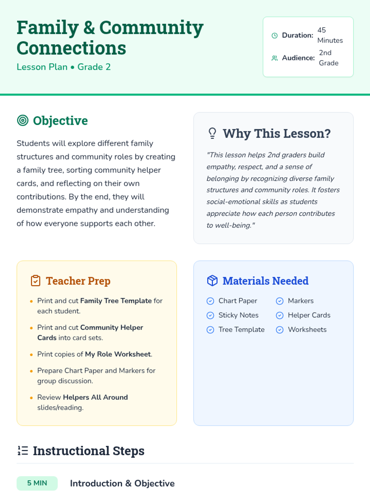 A single-session lesson for 2nd graders to explore family structures and community roles, fostering empathy and a sense of belonging through interactive activities and reflection.