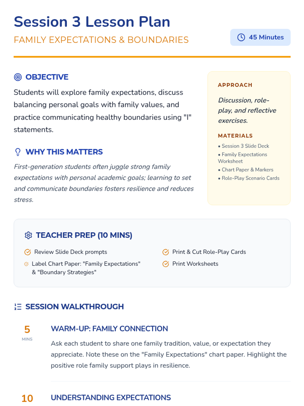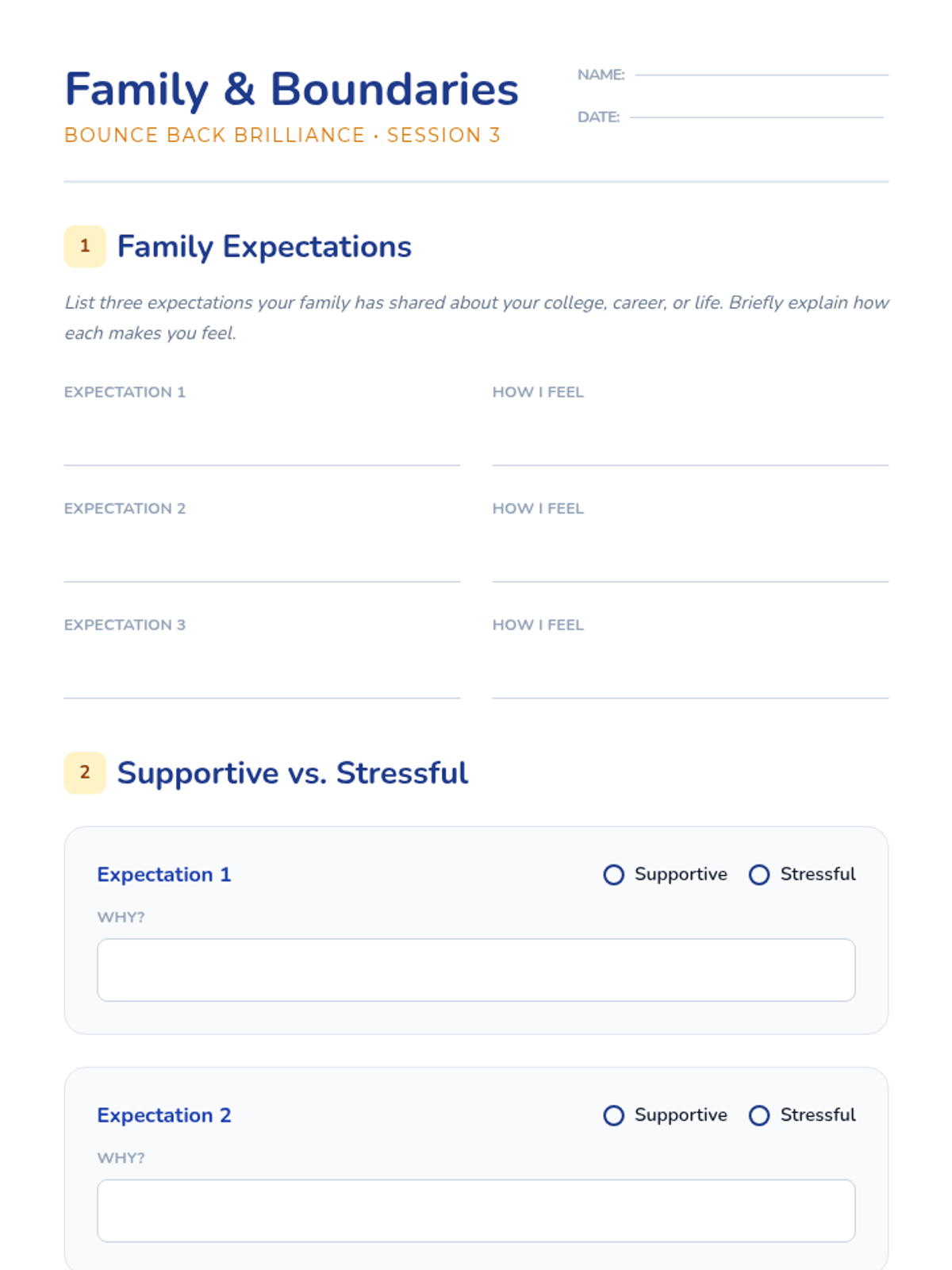 Students explore family expectations, discuss balancing personal goals with family values, and practice communicating healthy boundaries.