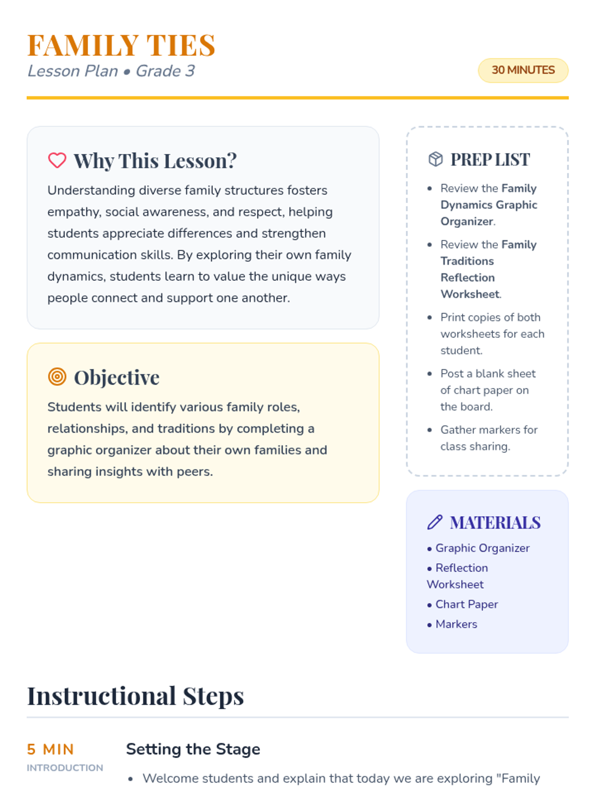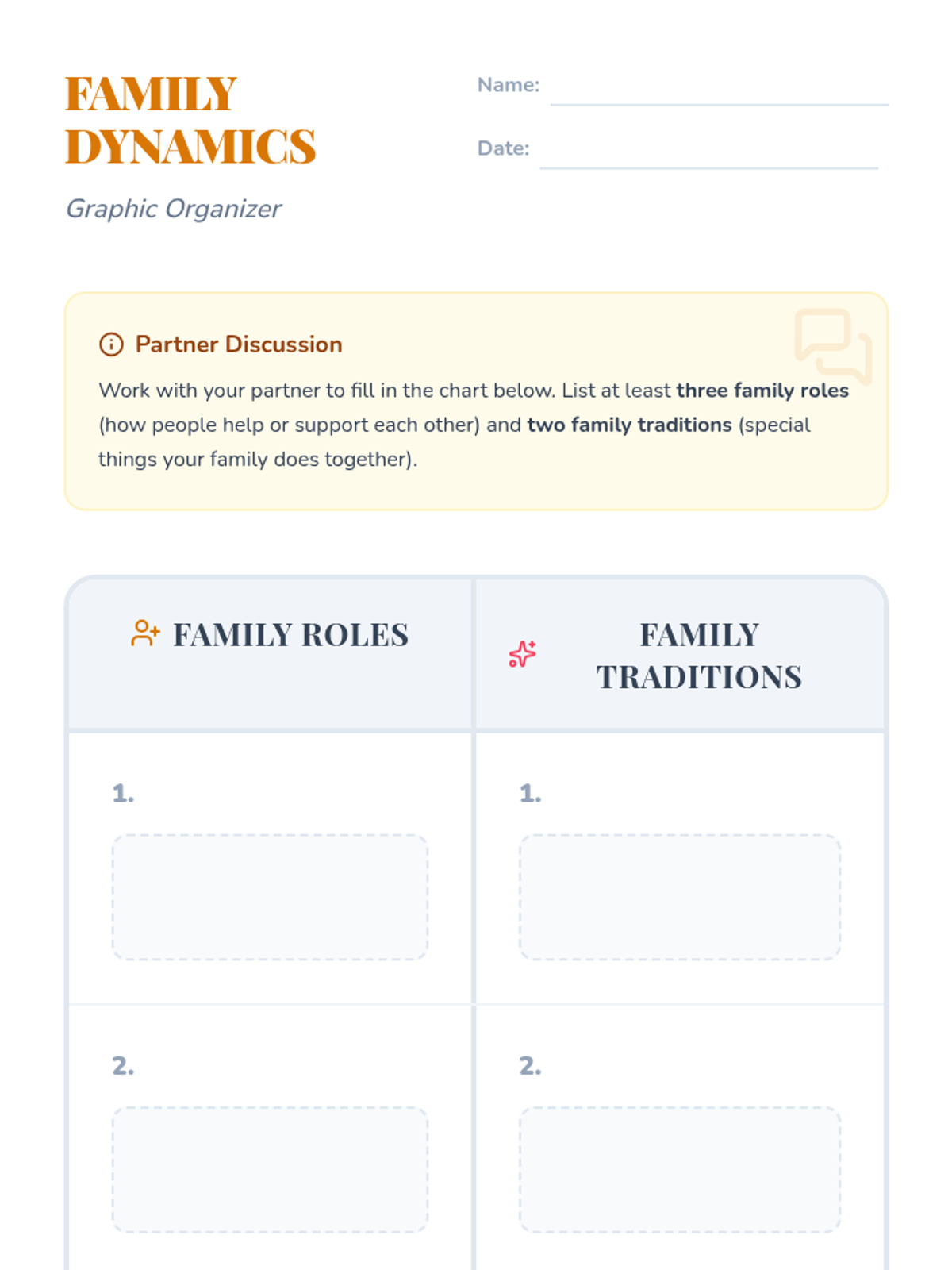 A 30-minute lesson for 3rd grade students to explore family dynamics by identifying roles, relationships, and traditions, fostering social awareness and empathy.