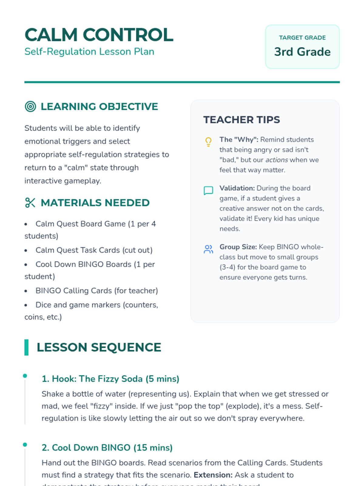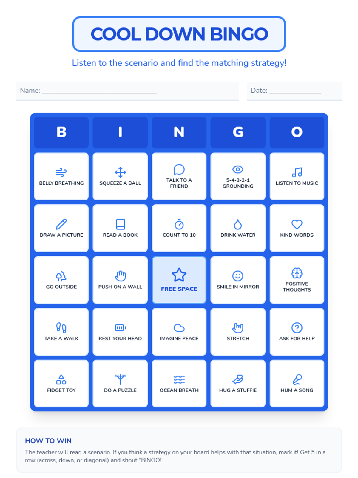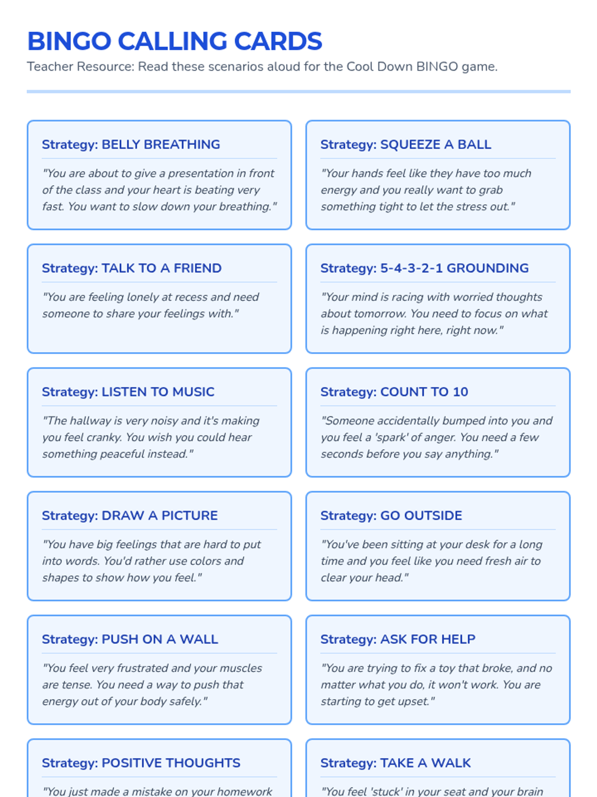 A fun, interactive lesson where 3rd graders practice identifying and applying self-regulation strategies through a board game and BINGO. Students will learn to recognize emotional triggers and choose appropriate 'calm-down' tools.