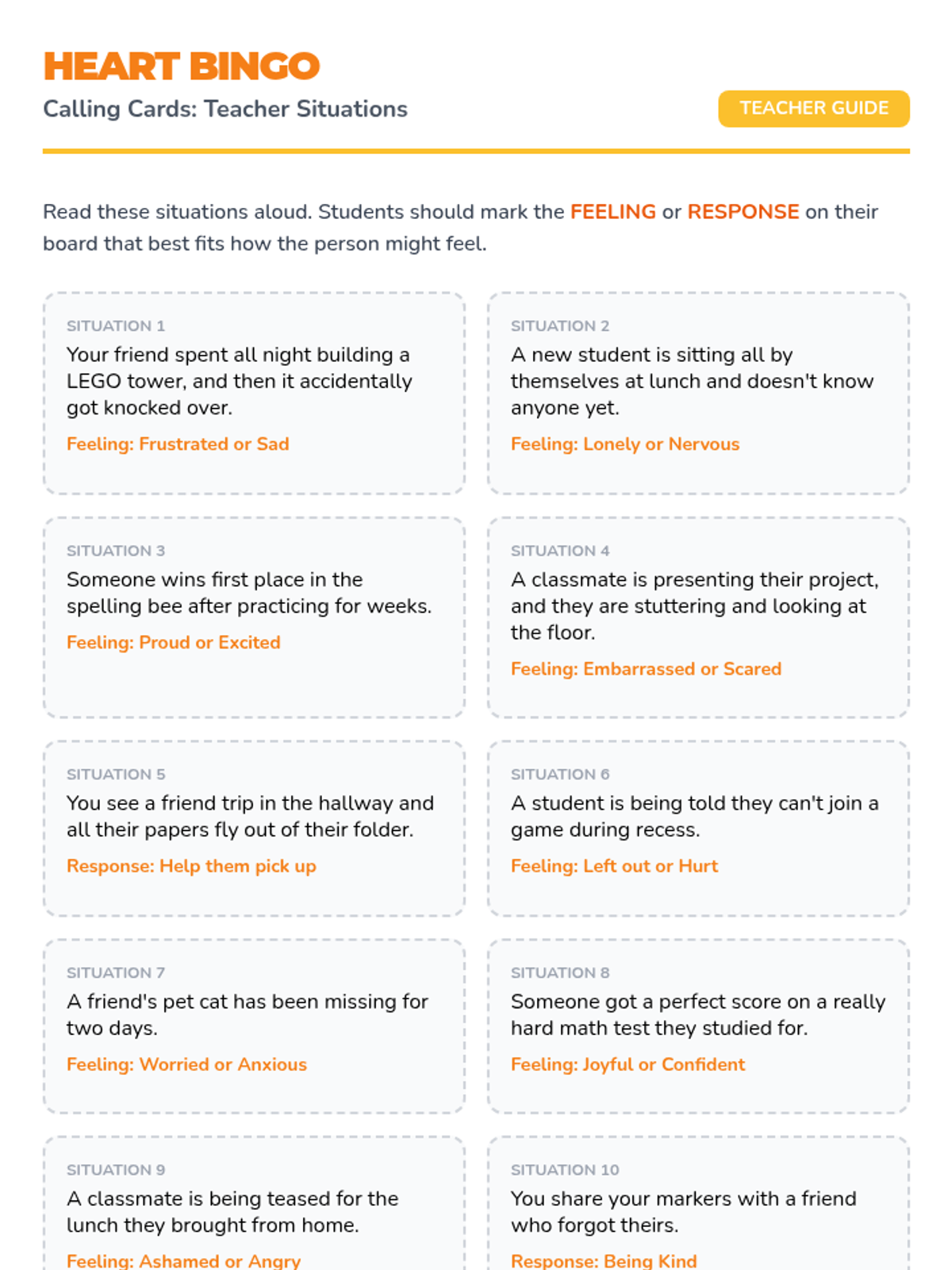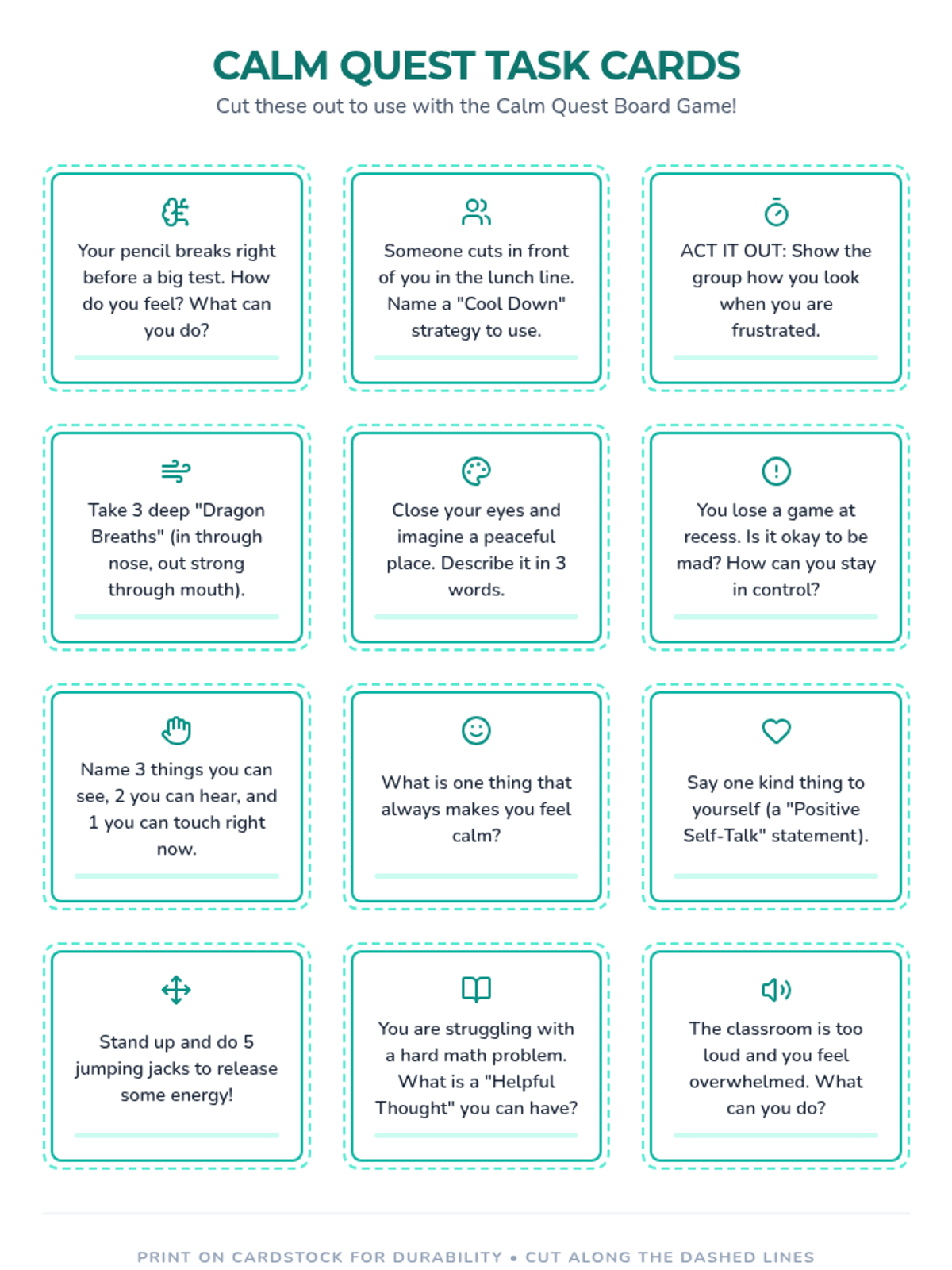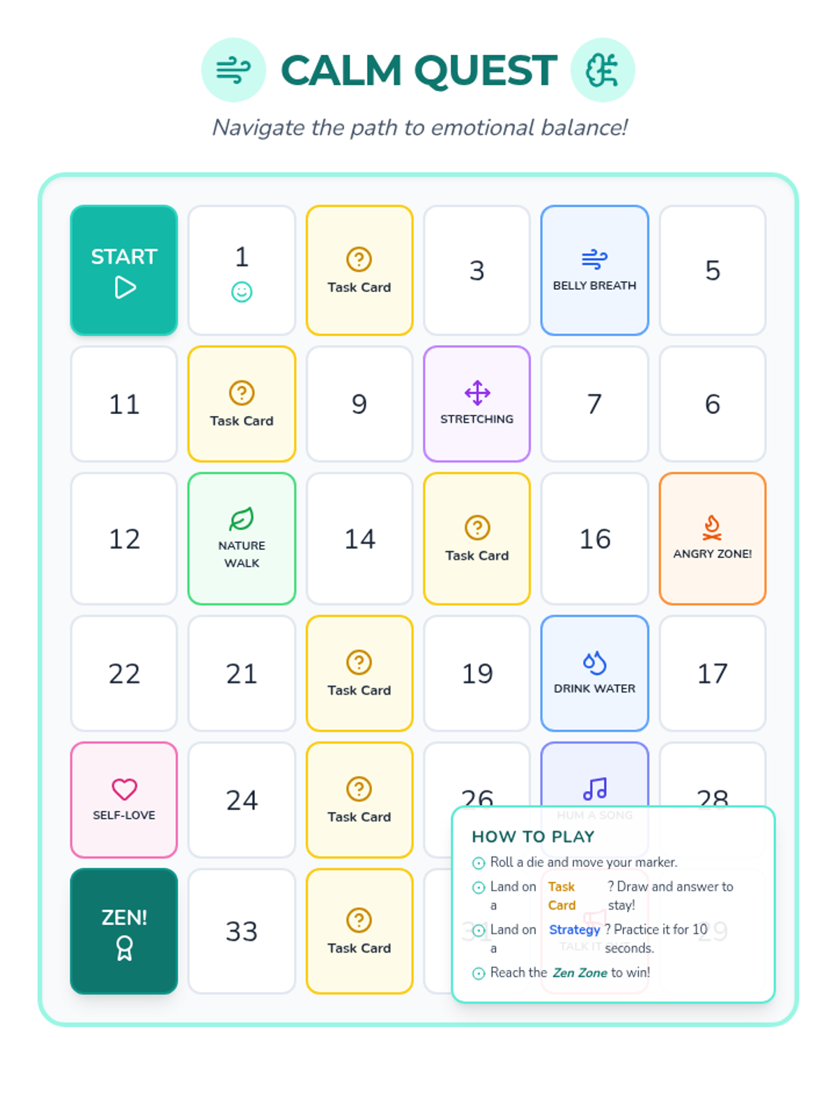 A fun, interactive lesson where 3rd graders practice identifying and applying self-regulation strategies through a board game and BINGO. Students will learn to recognize emotional triggers and choose appropriate 'calm-down' tools.