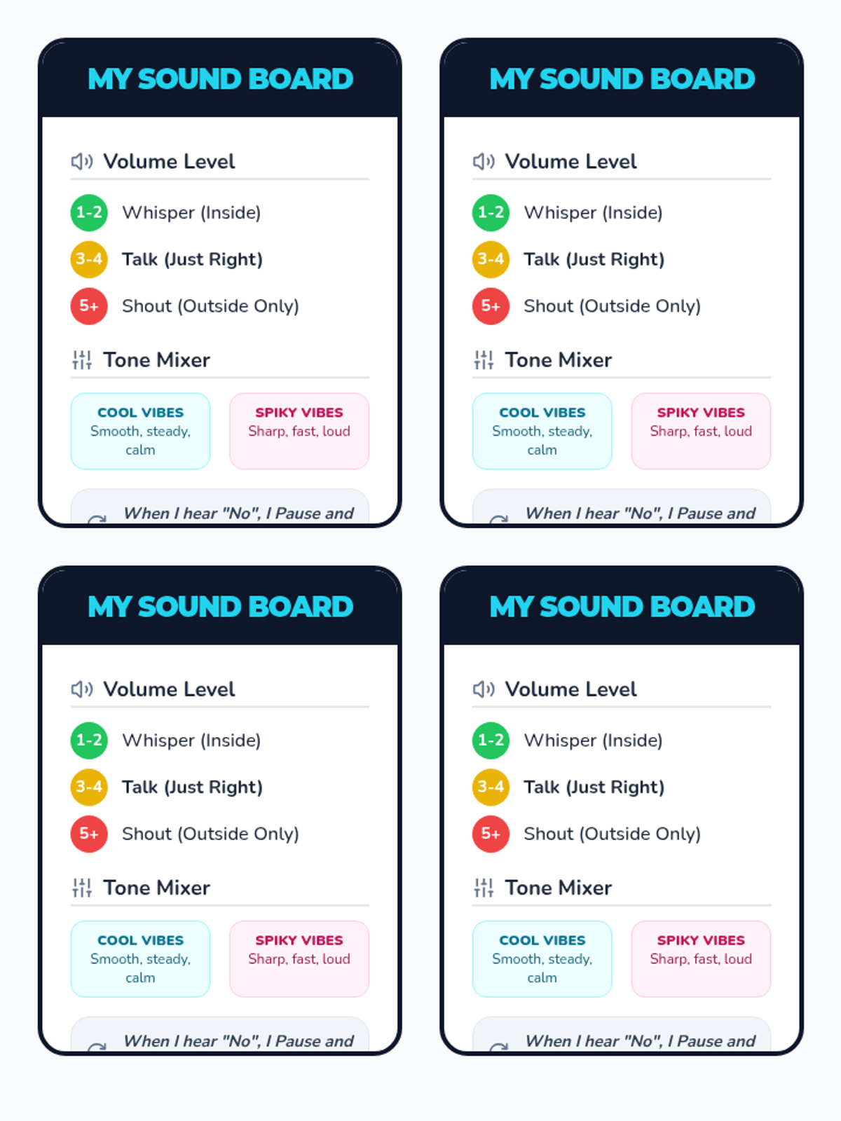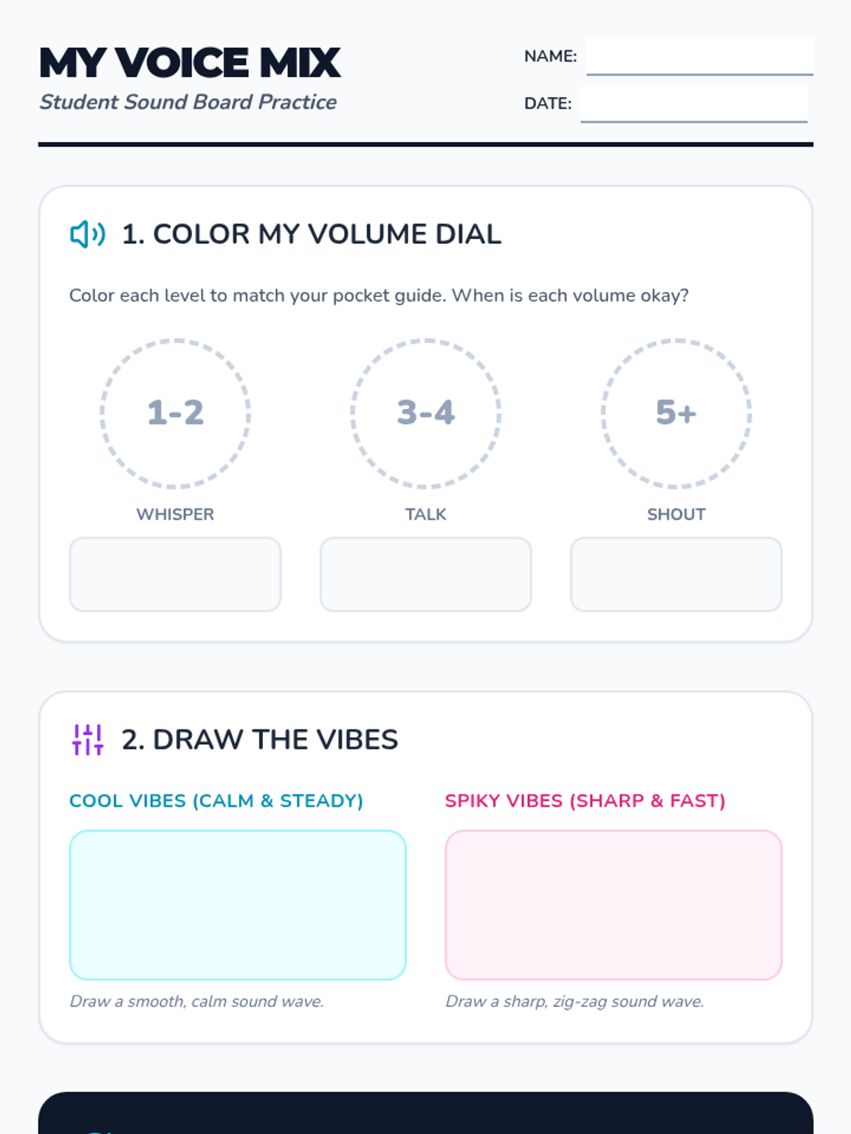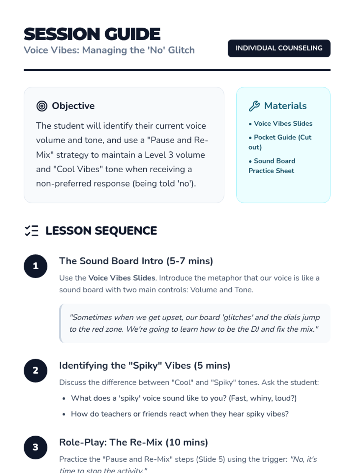 A quick counseling lesson for 3rd-grade students to manage tone and volume of voice when receiving 'no' as an answer. It uses visual metaphors of a sound board and voice meter to build self-awareness and emotional regulation.