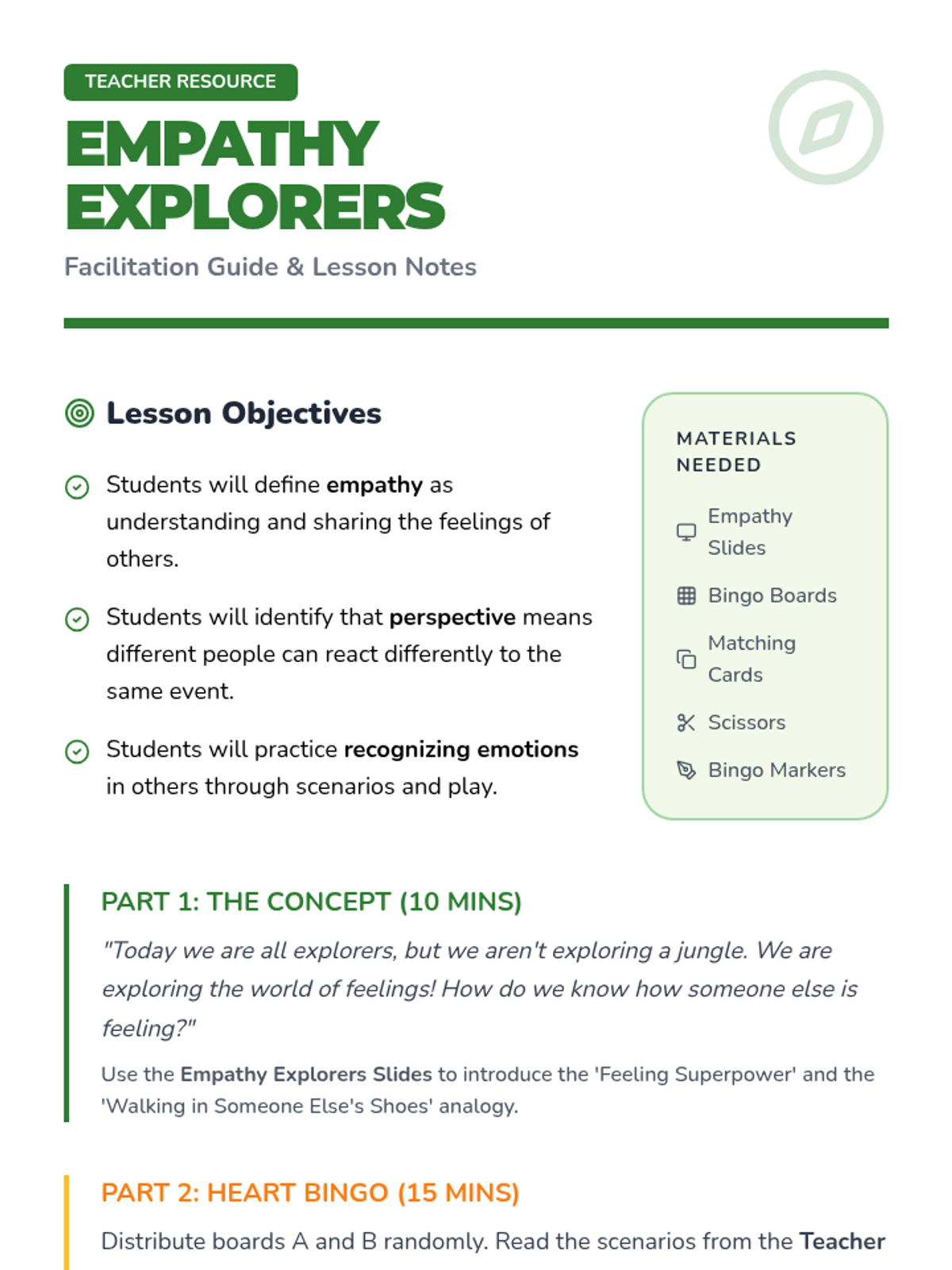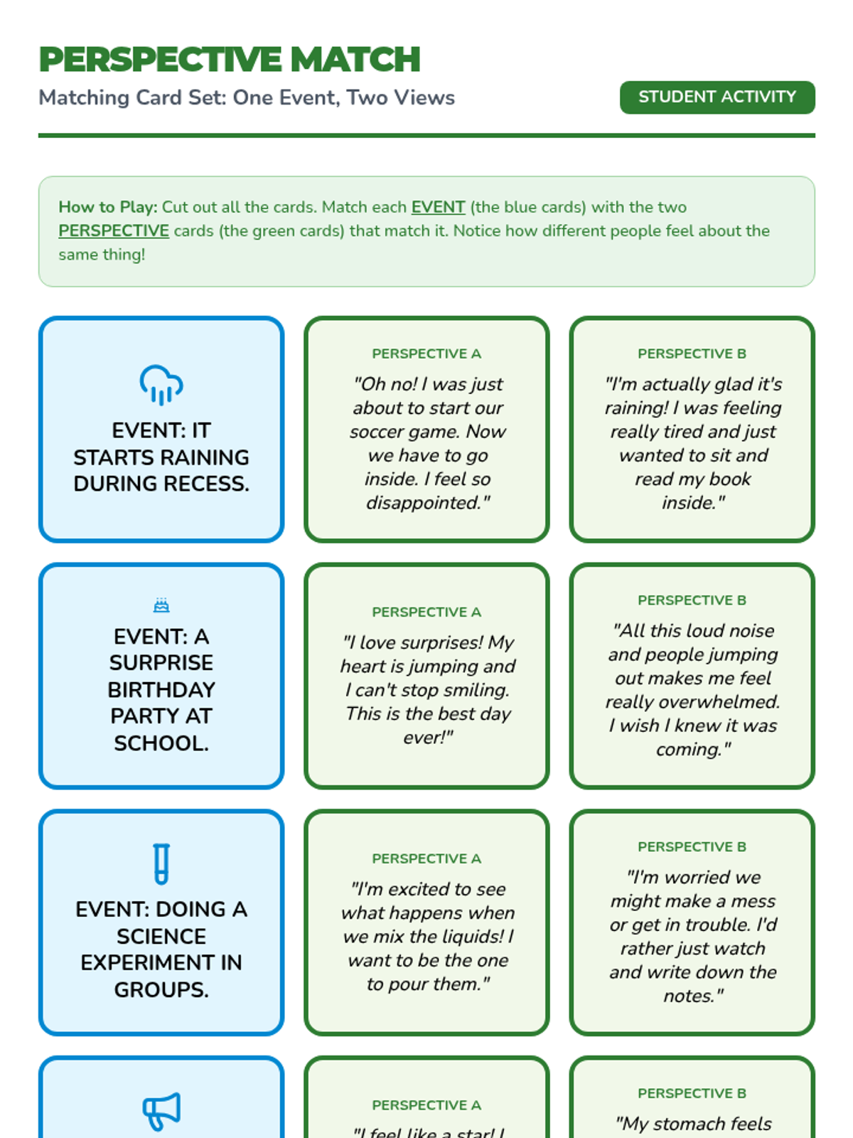 A lesson for 3rd graders focused on developing empathy and perspective-taking skills through interactive games and discussion. Students will learn to recognize others' feelings and understand that people can have different reactions to the same event.
