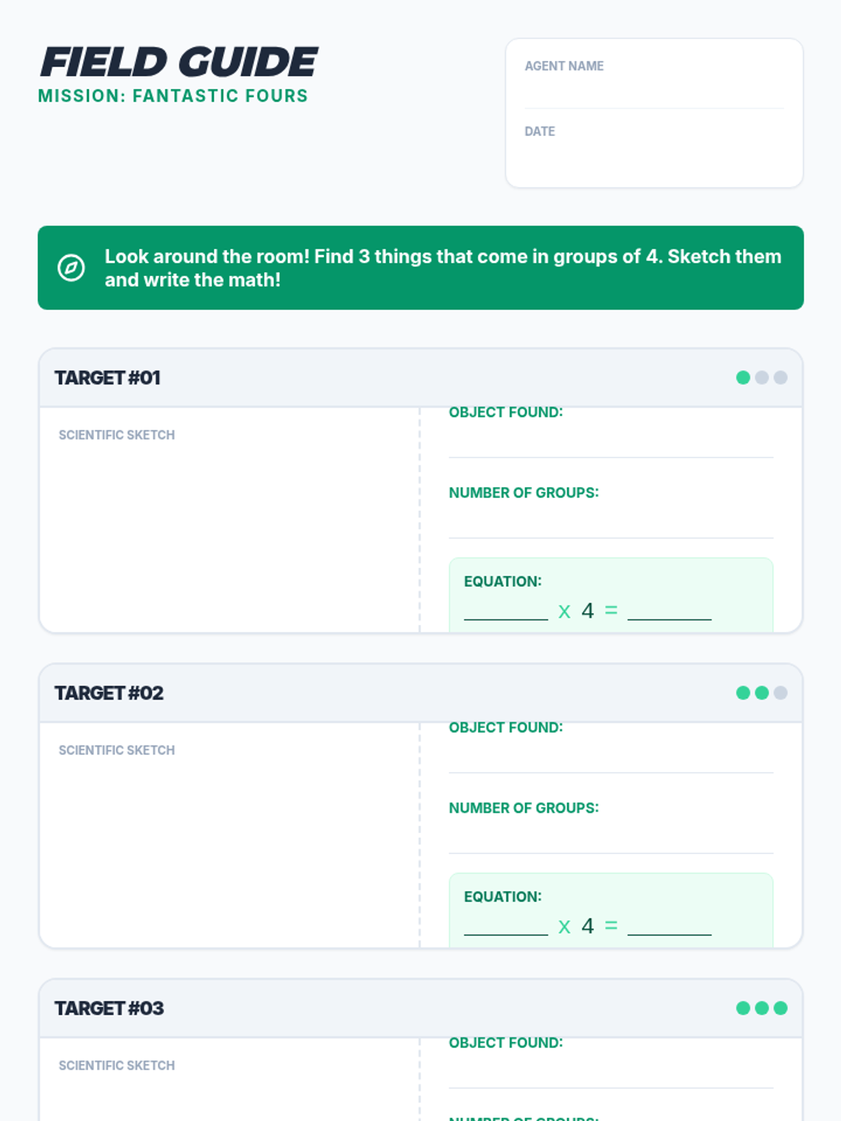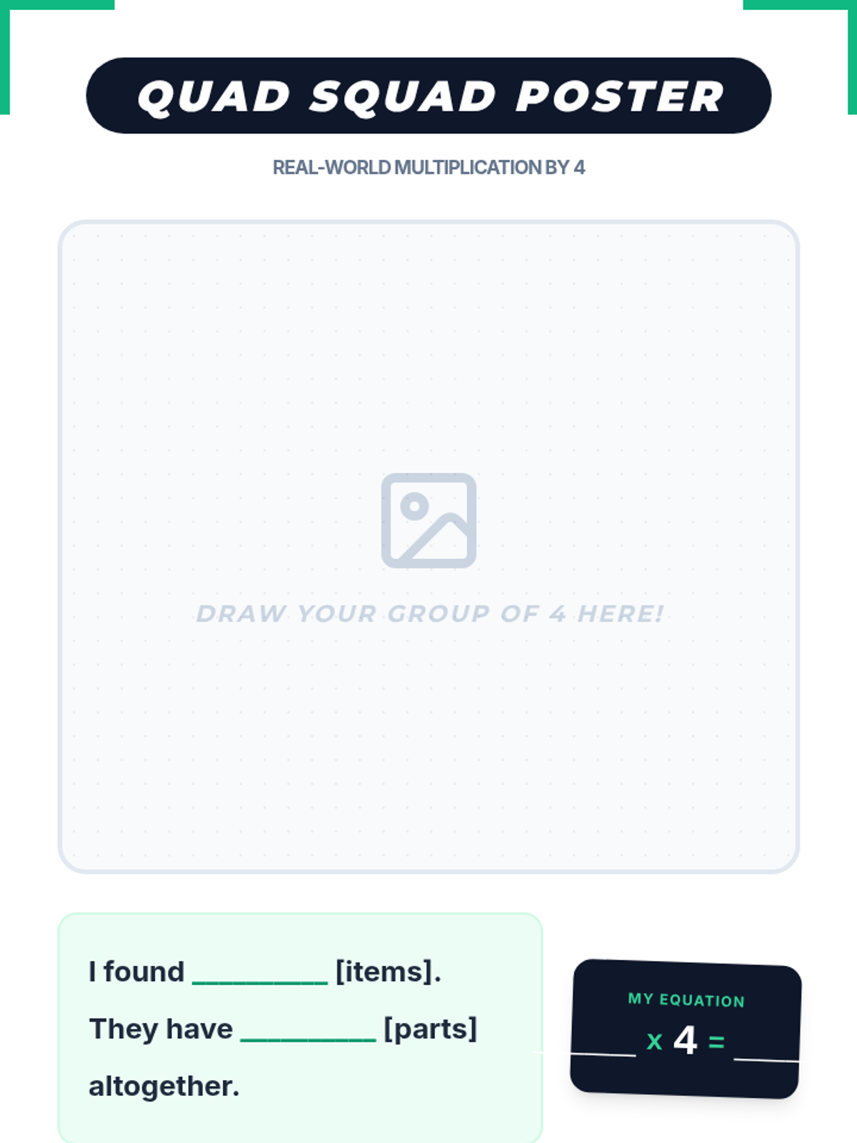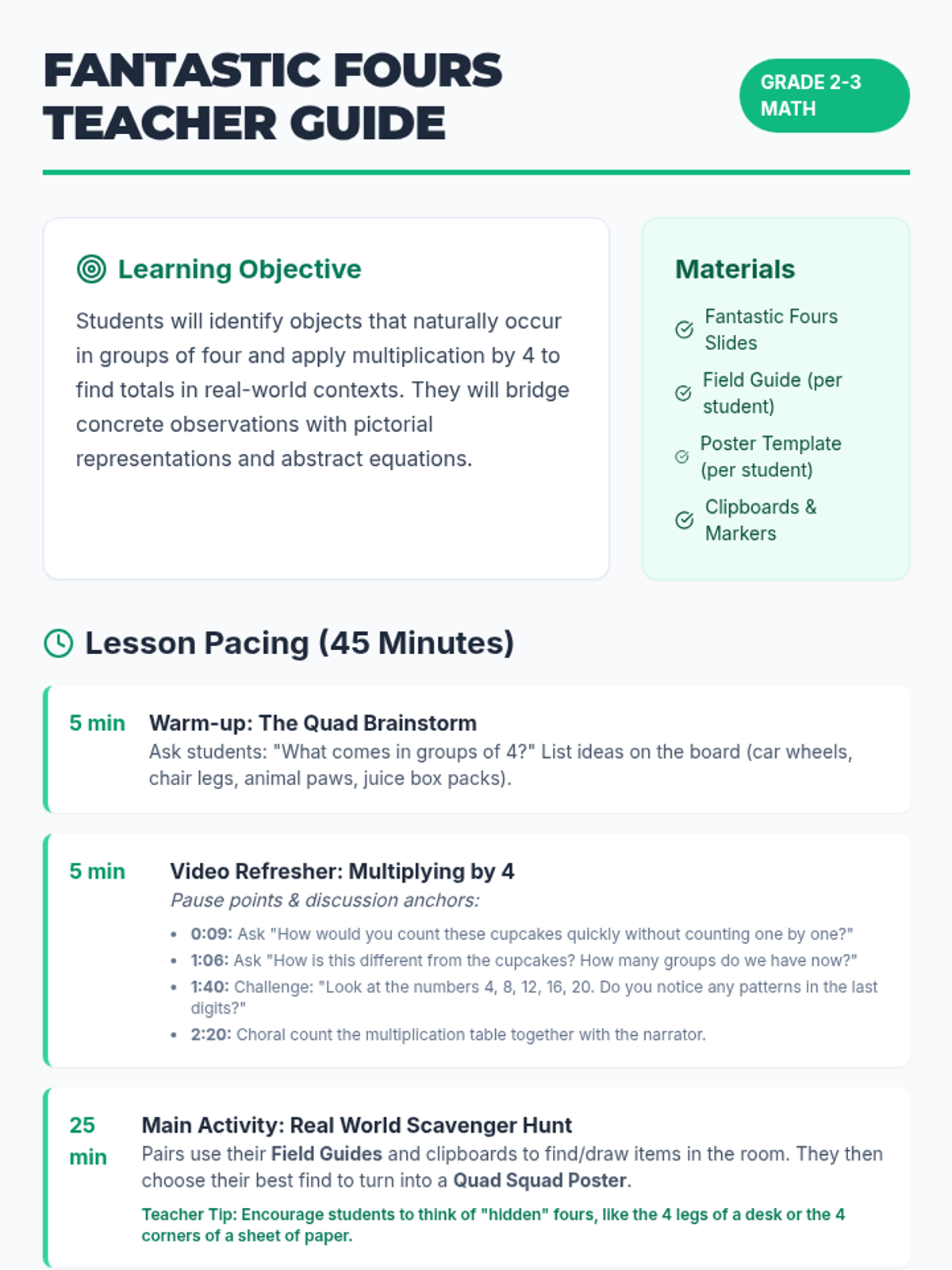 A hands-on multiplication lesson where students explore real-world 'groups of 4' through a scavenger hunt and creative poster-making.