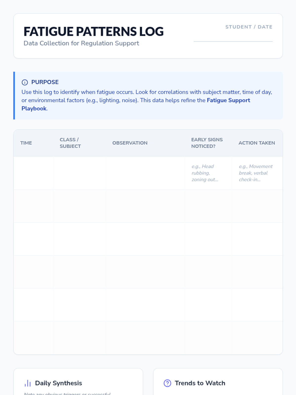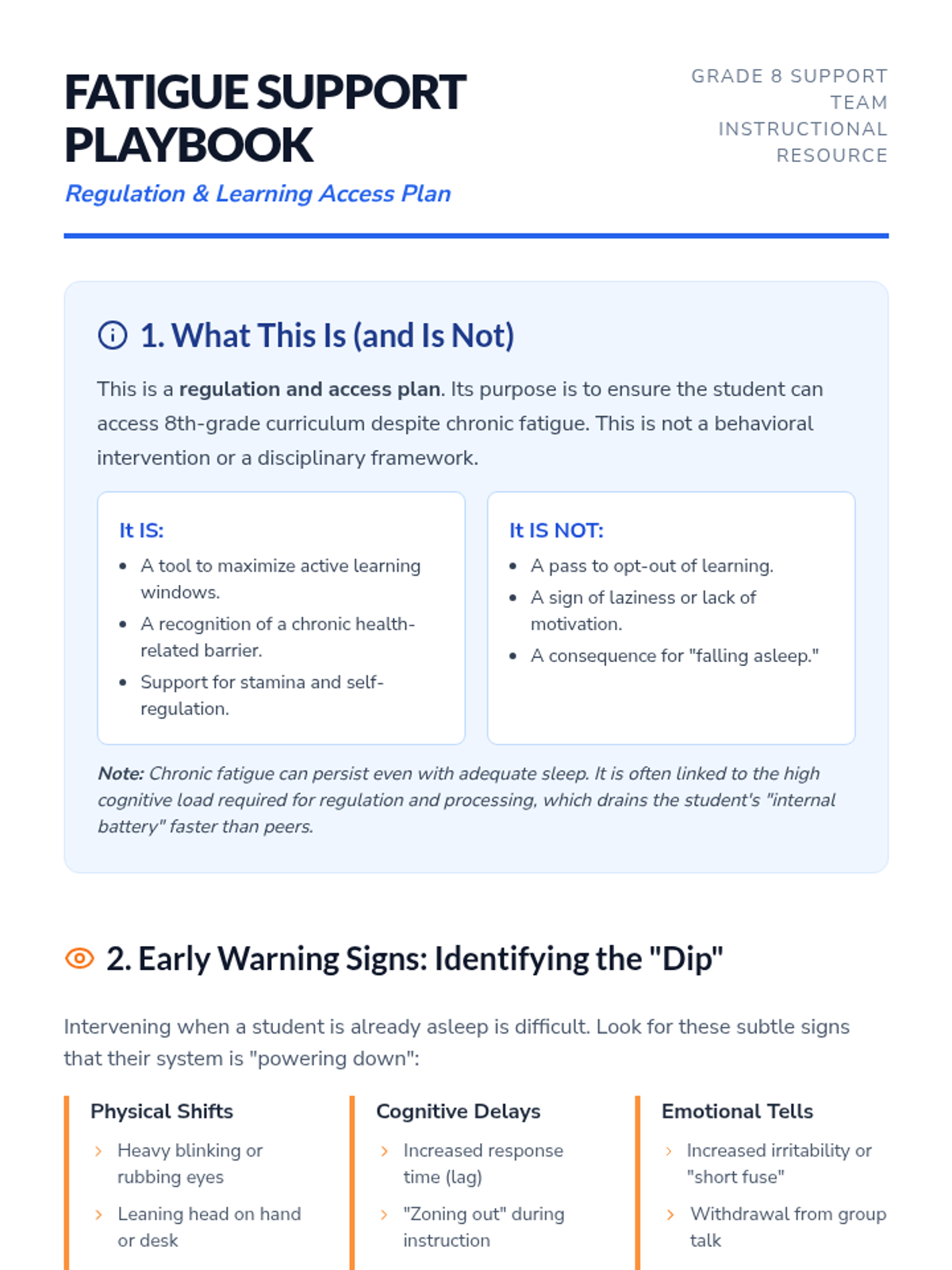A comprehensive teacher-facing resource designed to support an 8th-grade student experiencing chronic fatigue, focusing on classroom-based regulation and instructional adjustments.
