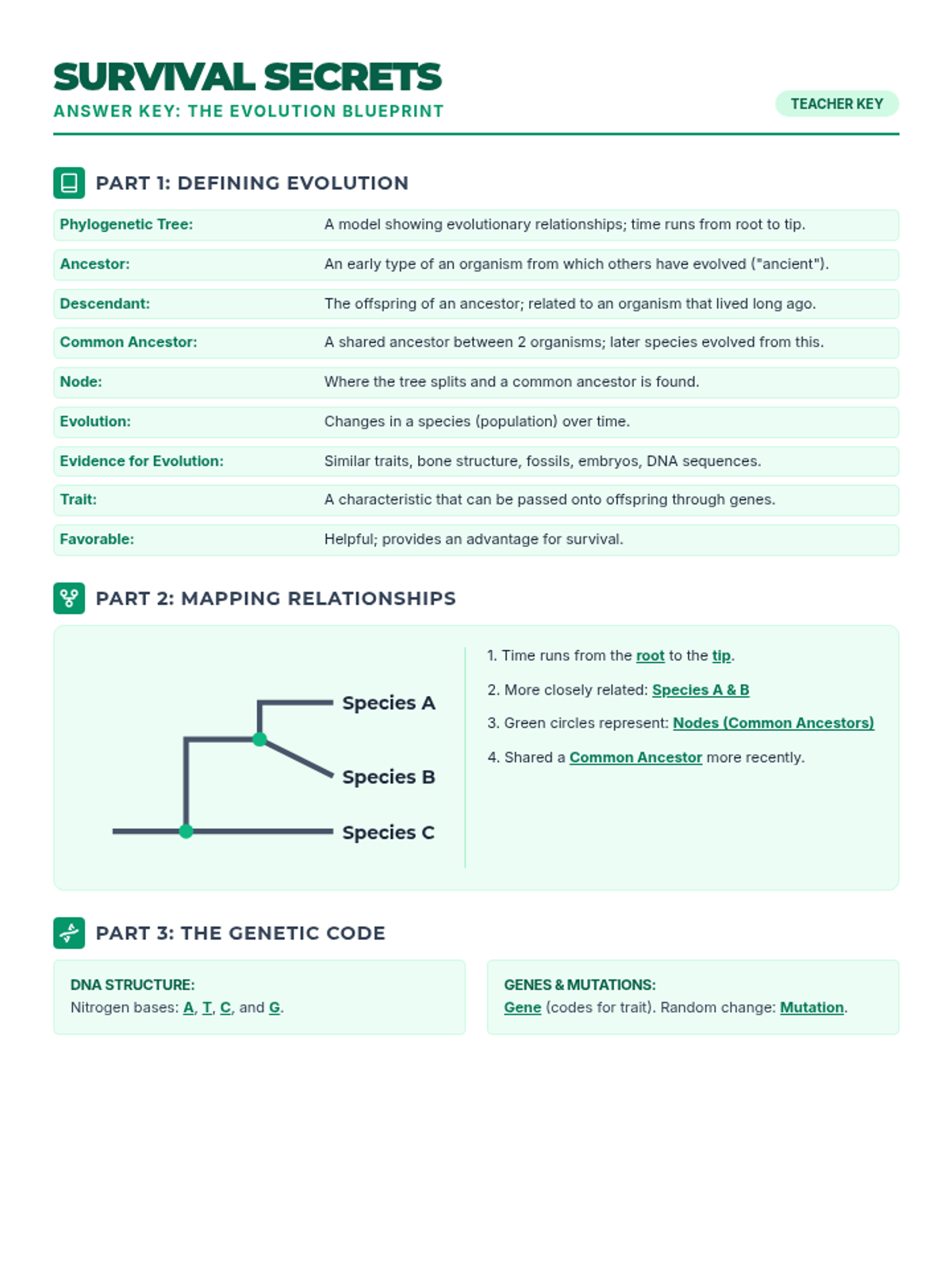 A comprehensive lesson on natural selection and evolution, covering vocabulary, phylogenetic trees, and evidence for evolution for 7th-grade students.