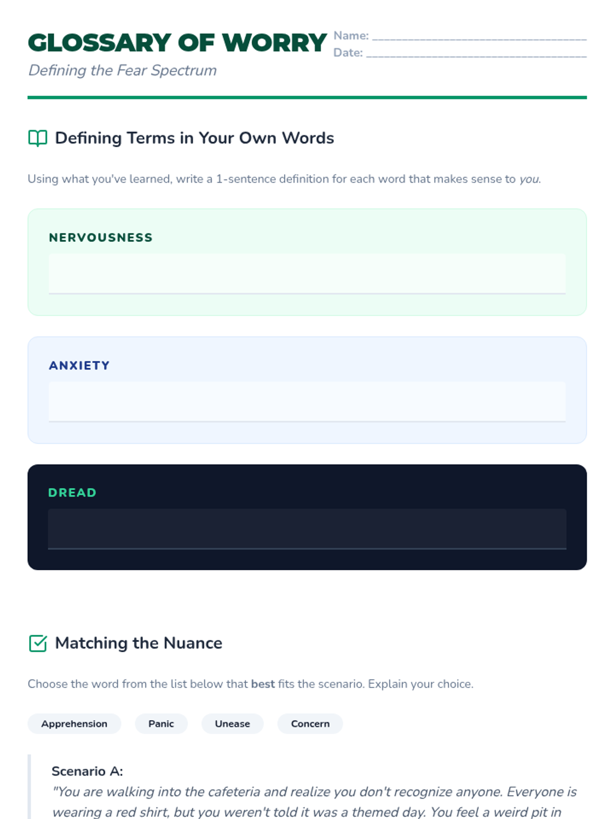 Students examine the spectrum of fear, distinguishing between immediate fright, lingering anxiety, and subtle nervousness. They create a 'Glossary of Worry' to define these terms in their own words.