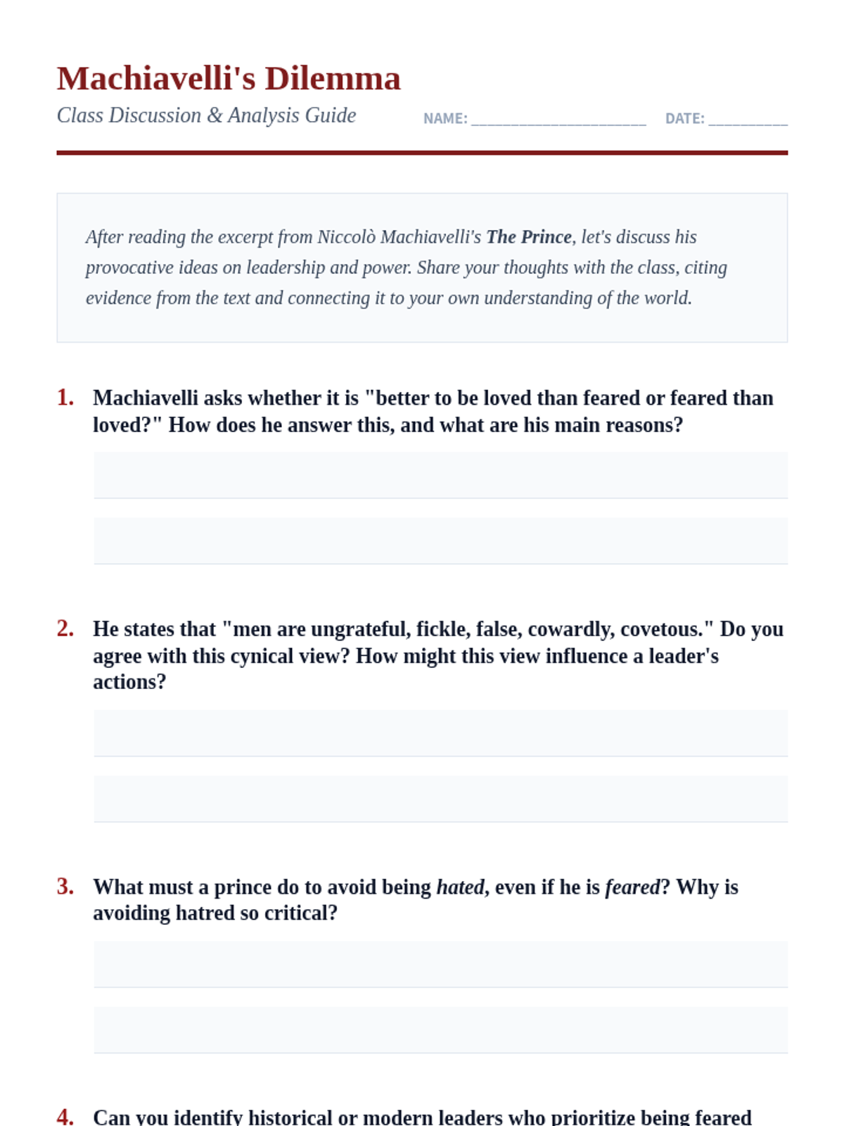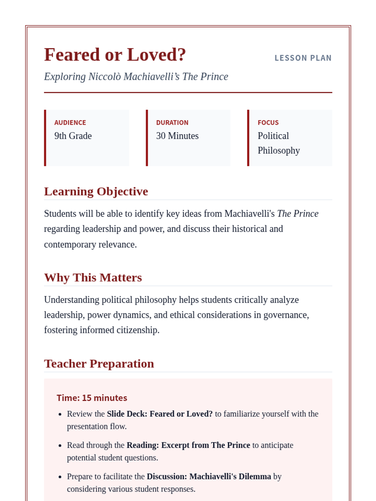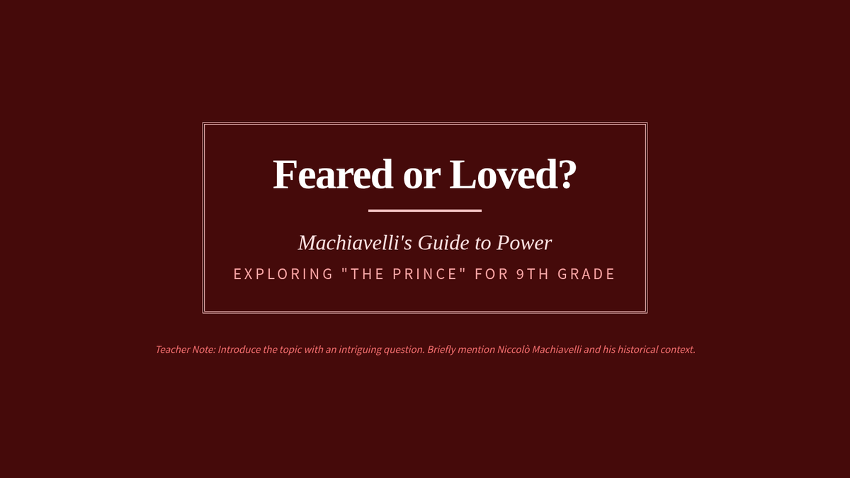 This lesson introduces 9th-grade students to Niccolò Machiavelli's seminal work, The Prince, exploring its core ideas on leadership and power. Students will analyze historical perspectives to critically evaluate modern leadership roles and ethical governance.