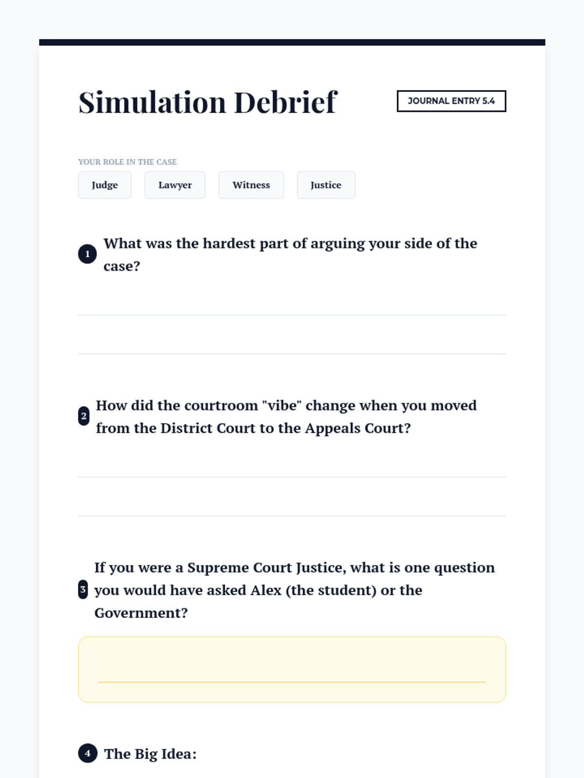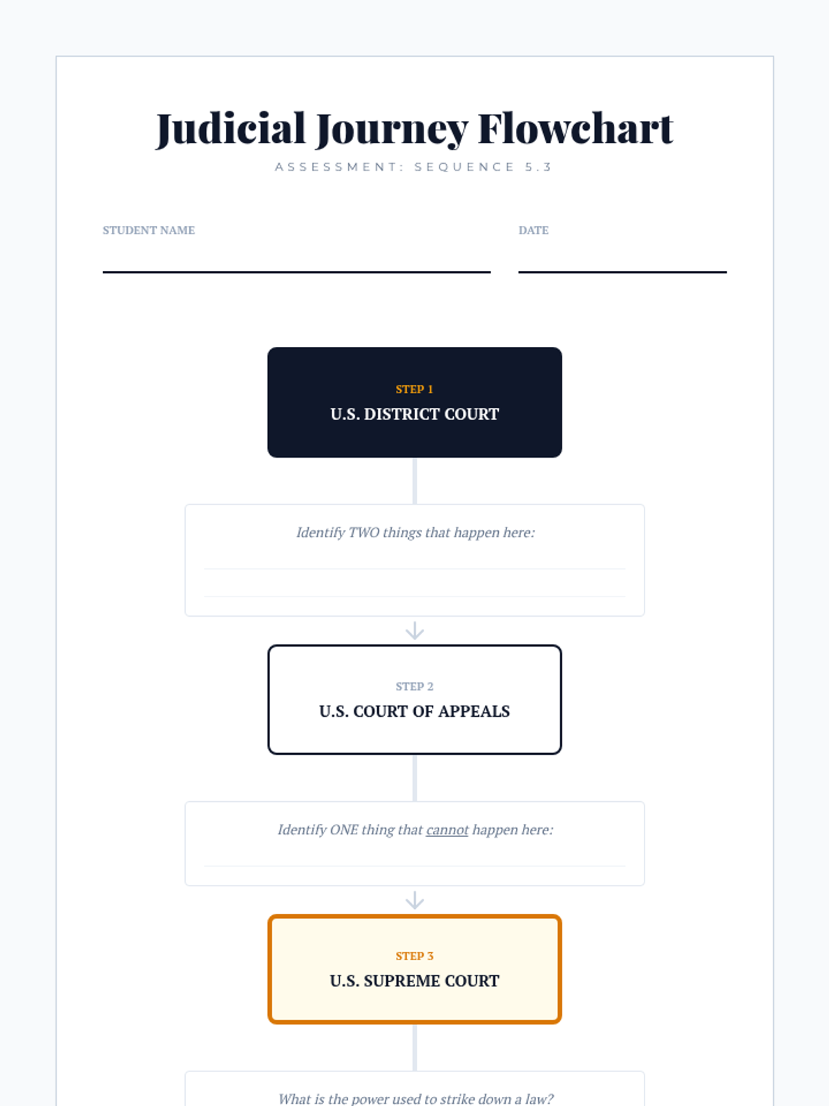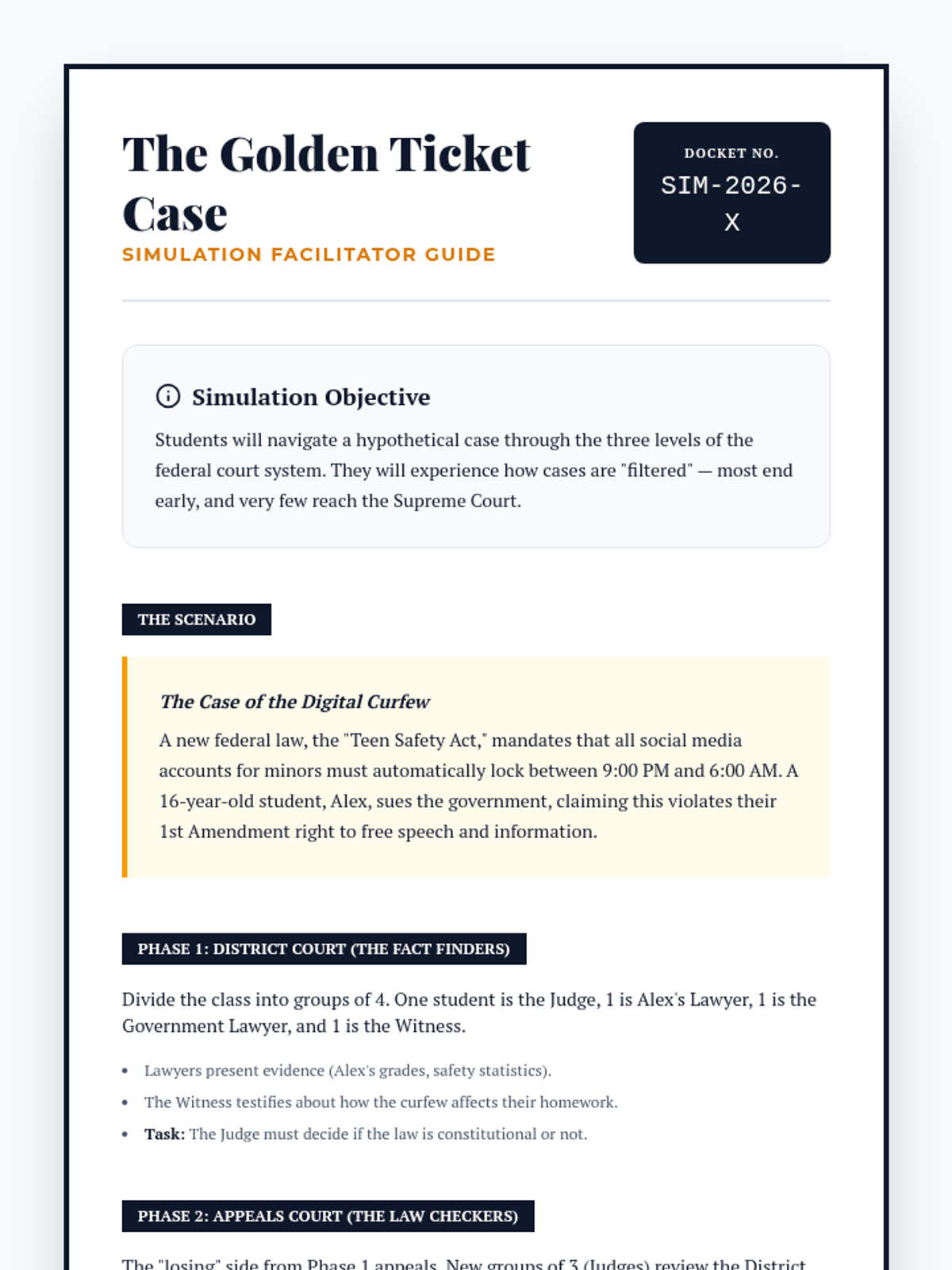A culminating simulation where students trace a constitutional case from filing in a District Court through the Appeals circuit to a Supreme Court petition, demonstrating the filtering process of the federal judiciary.