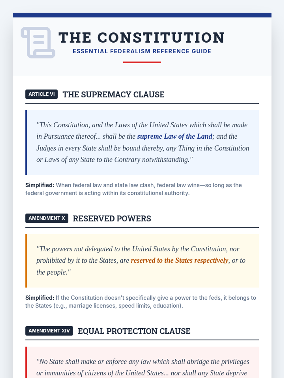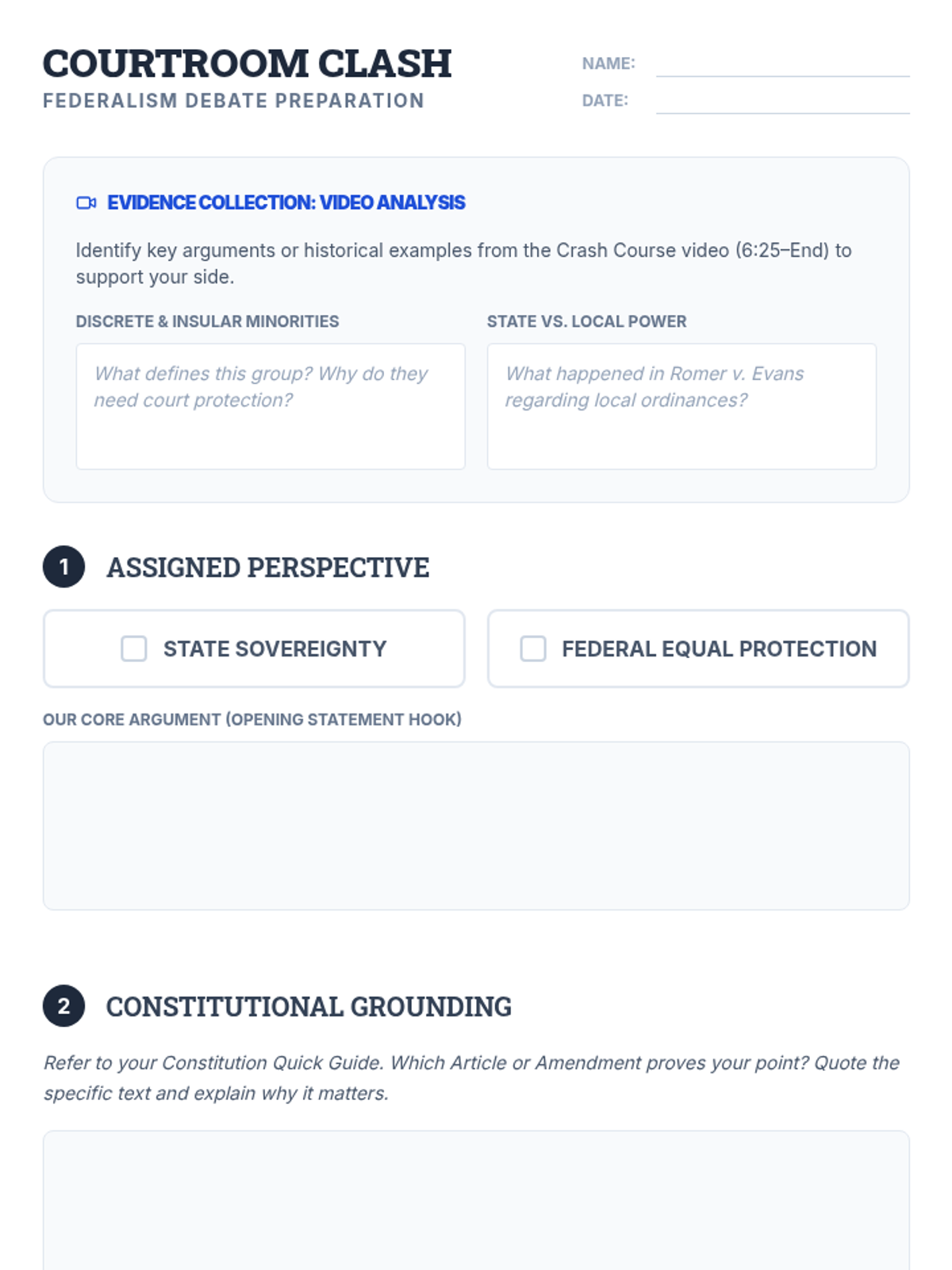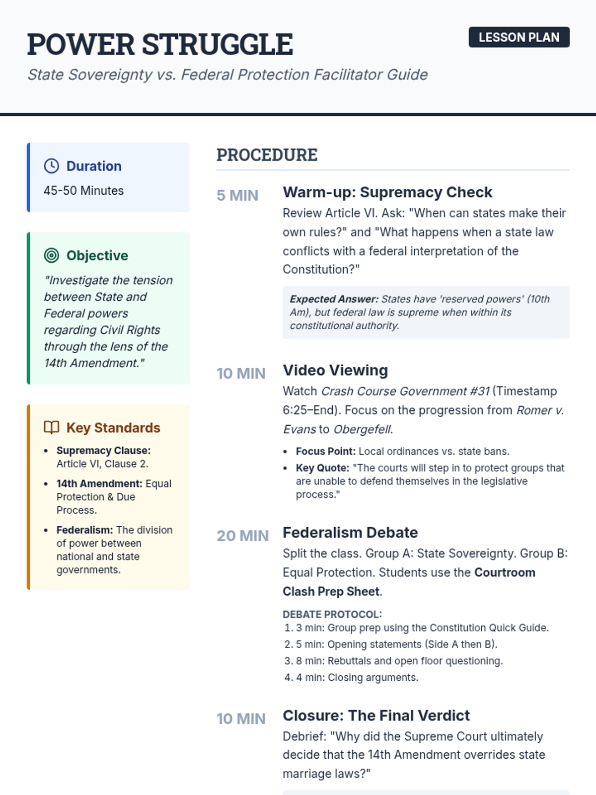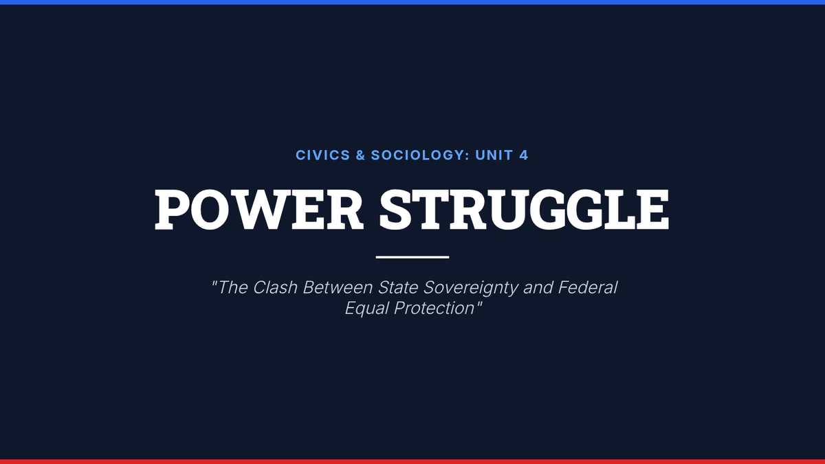 Students explore the tension between state and federal powers through the lens of civil rights, focusing on the 14th Amendment and the landmark case Obergefell v. Hodges. The lesson culminates in a debate between state sovereignty and federal equal protection.